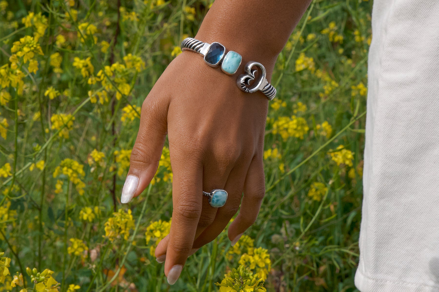 The Larimar stone is featured in many of Vibe Jewelry’s designs. It is a beautiful blue stone that reflects the colors of the Caribbean ocean. With every design featuring the Larimar stone, you will notice that the markings and shades vary as each stone is hand cut creating its own unique character. When wearing this stone in its natural form, it is known to be a way to promote calmness in your life.