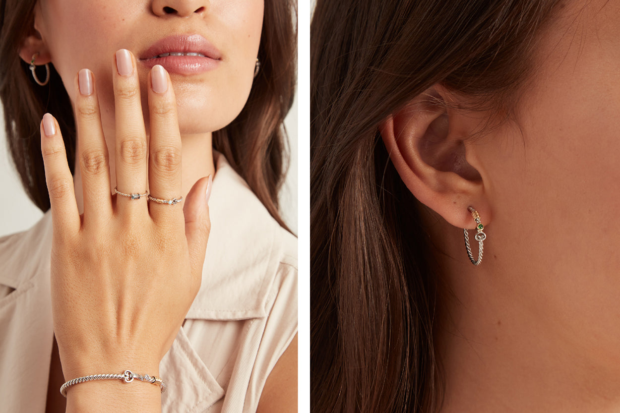 Introducing the Twisted Collection, a stunning array of jewelry showcasing intricate rope-inspired detailing. Whether it's the band of a ring, a hoop earring, or a bracelet, each piece boasts this captivating design. Expertly crafted in sterling silver or 14K gold and embellished with gemstones, these pieces are a flawless addition to your jewelry collection. Whether you prefer a coordinated set of the same styles or enjoy mixing and matching for a one-of-a-kind look, this collection offers endless possibilities to express your unique style. Rest assured, you'll find your perfect match within this exquisite collection!