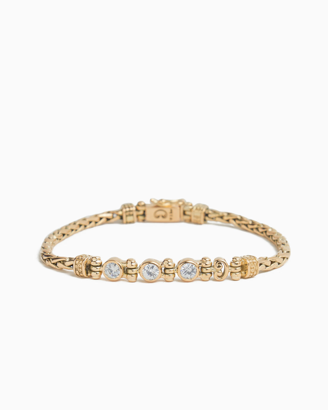 The Link Bracelet with Triple Stones features a 14K solid gold wheat link band. It...