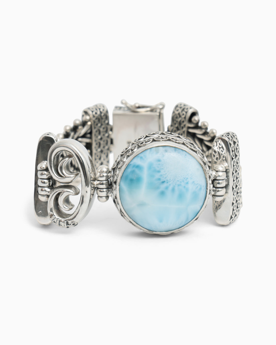 The Twisted Link Bracelet with Larimar & Petroglyph is handcrafted in sterling silver and features...