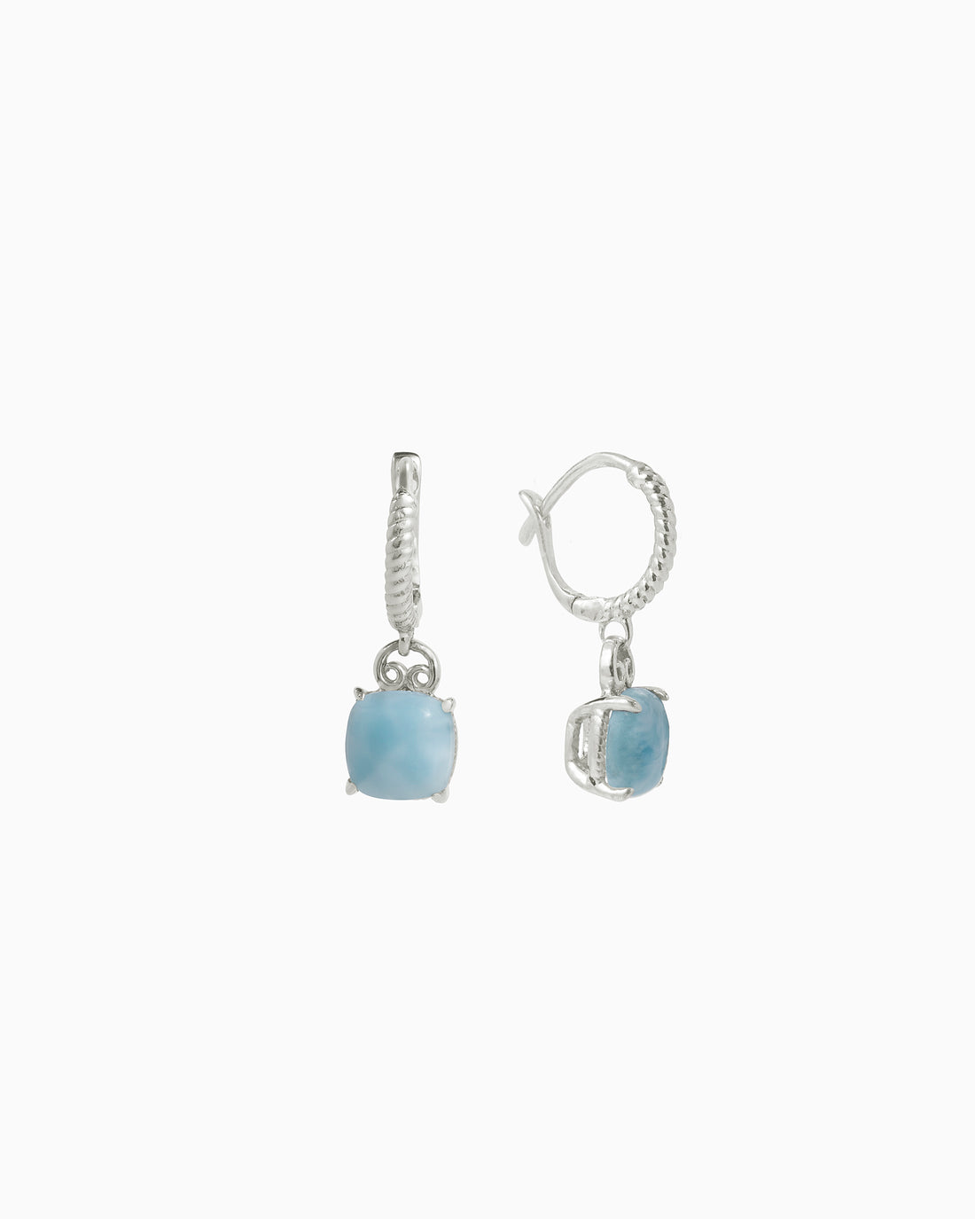 The Gemstone Drop Huggie showcases a large larimar cabochon within a twisted sterling silver basket...