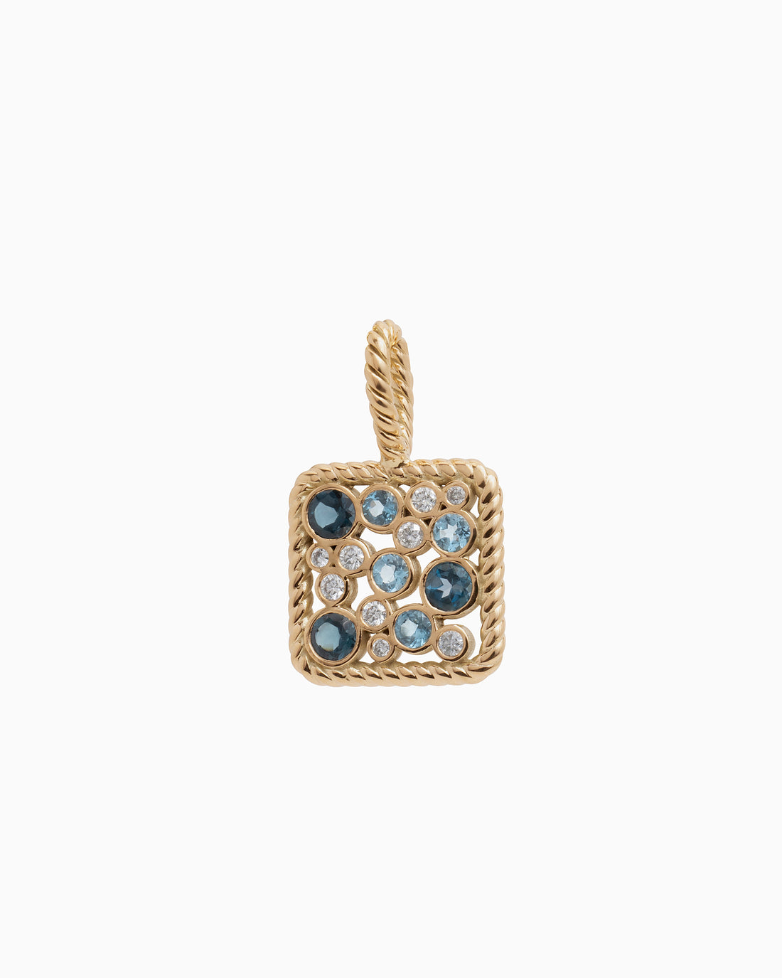The Twisted Ocean Bubbles Pendant is an eye-catching piece featuring faceted diamonds and blue topaz...