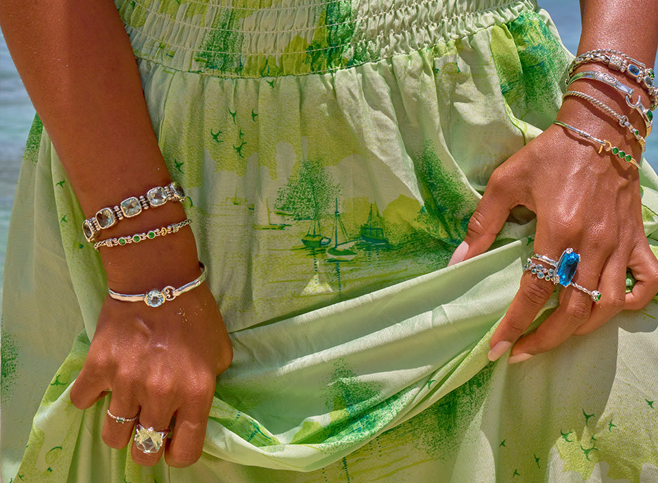 Endless Summer is a collection of handcrafted sterling silver and 14K solid gold gemstone jewelry inspired by the light, color, and ease of the season. From the vibrant tones of London blue topaz to the soft seafoam glow of prasiolite, these pieces channel the palette of warm summer days on the beach. From dainty stacking rings and breezy bangles to bold statement gems, every style is made to carry that golden hour feeling.