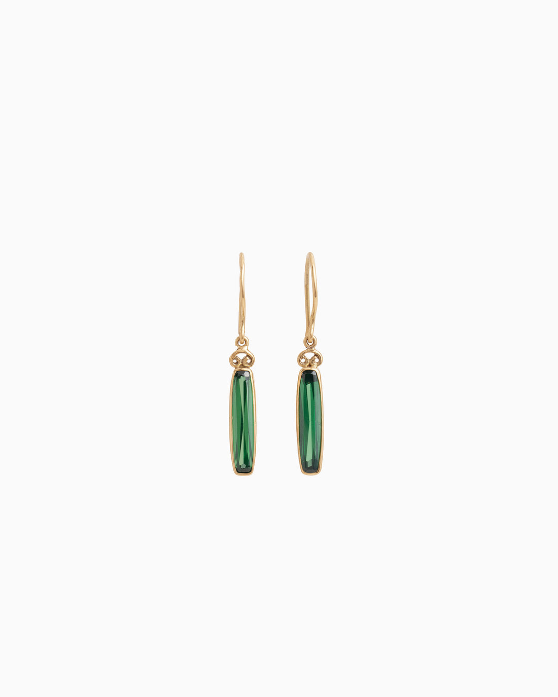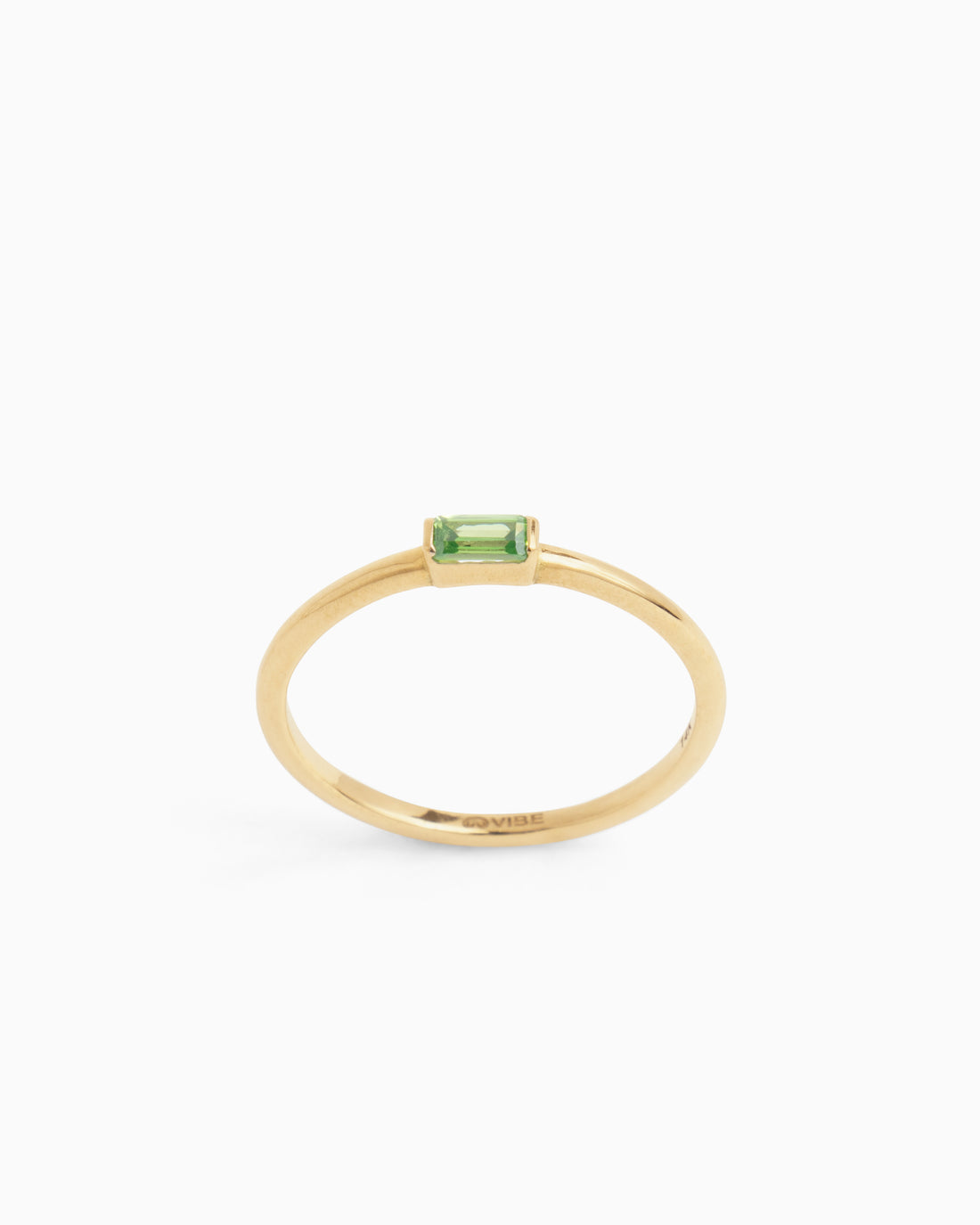 The Dainty Stacker Band, handcrafted in 14K solid gold, features a rectangular faceted green zircon...