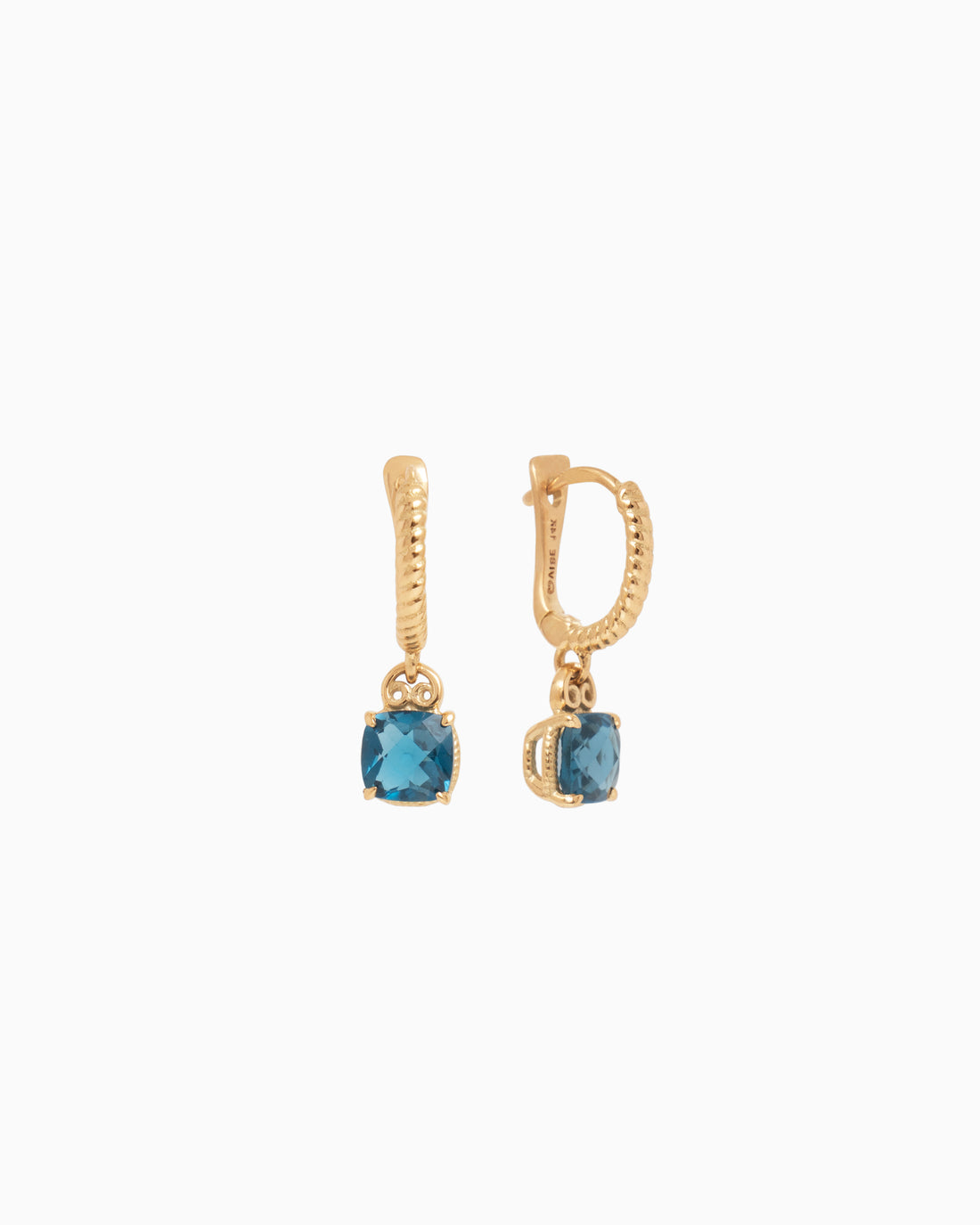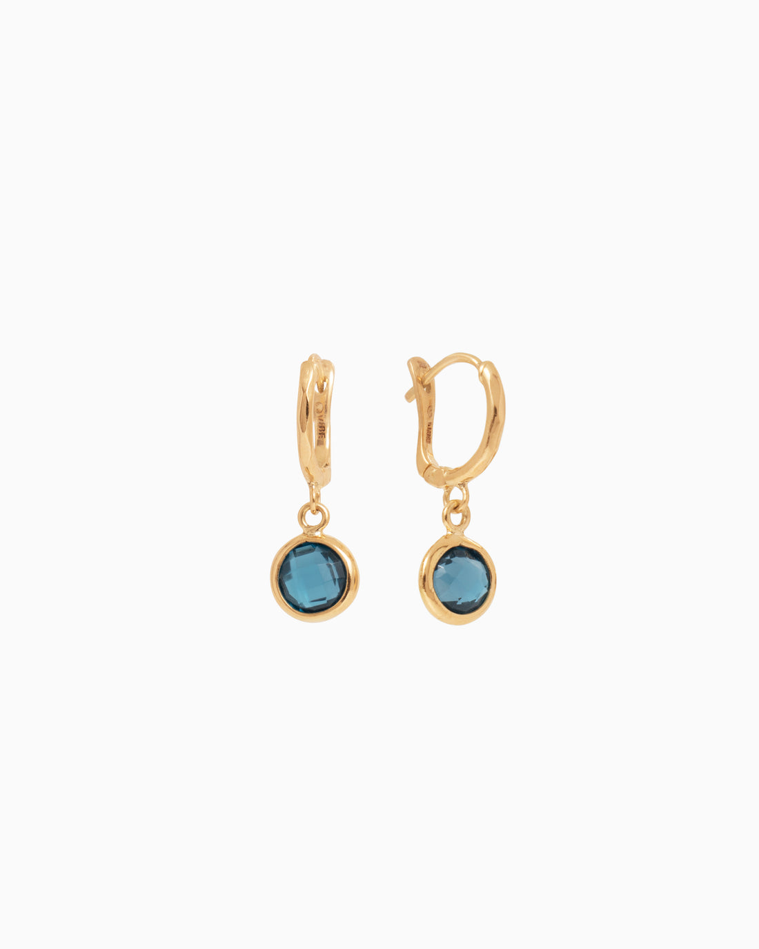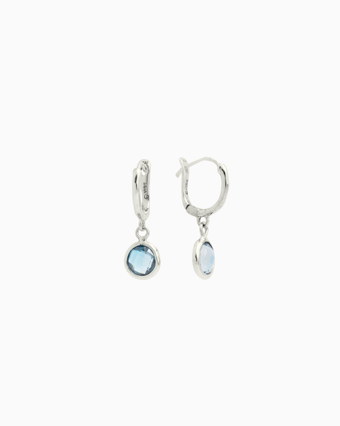 The Circle Stone Huggie showcases a circle faceted London blue topaz stone dangling from a...