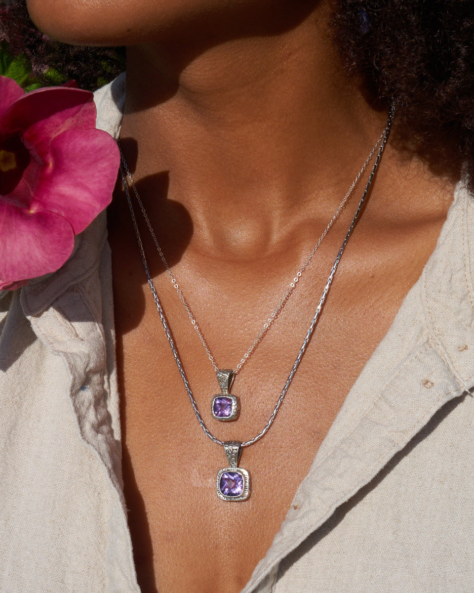 The Pink Ribbon Stone Pendant is handcrafted in sterling silver and features a faceted pink...