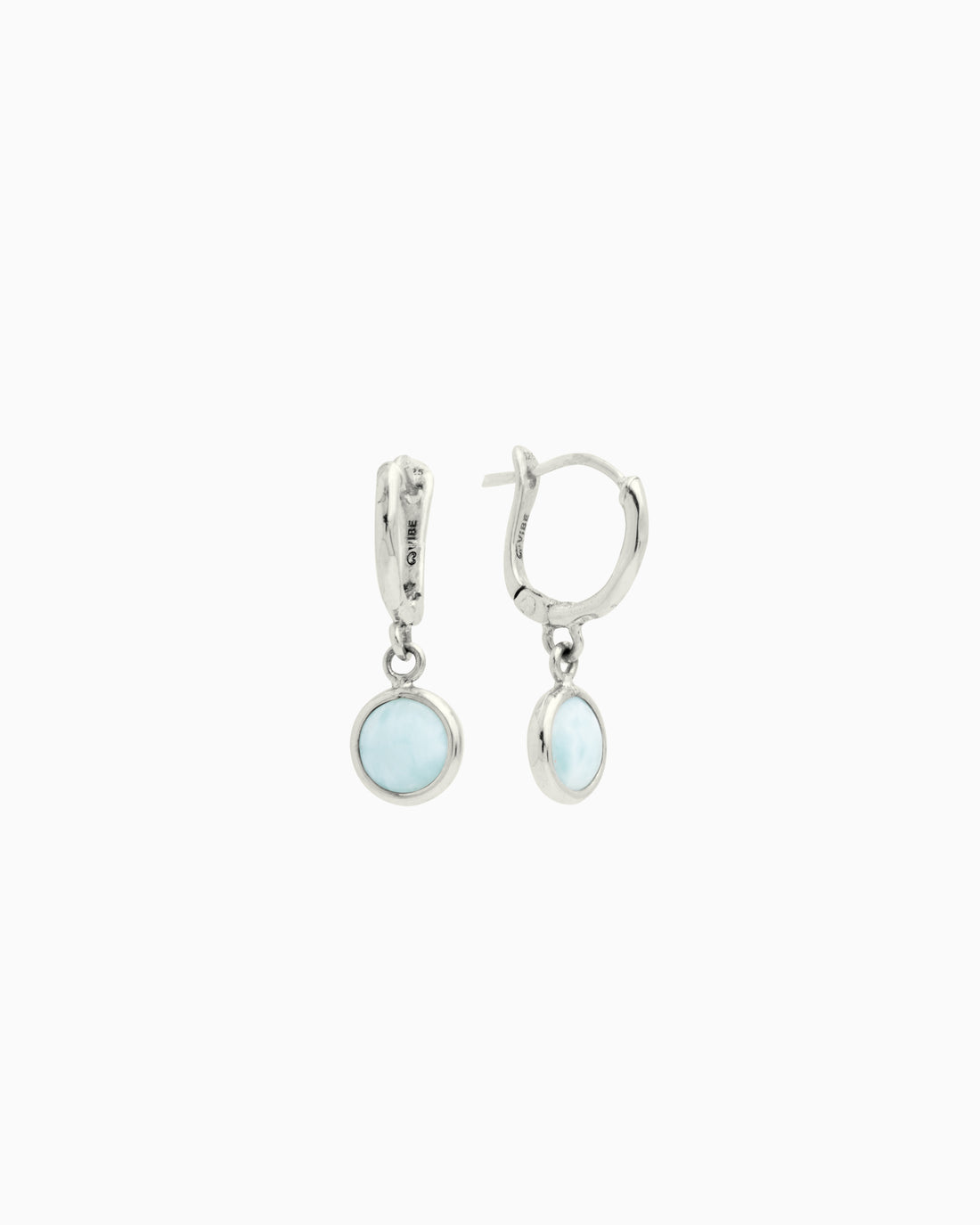 The Circle Stone Huggie showcases a circle cabochon larimar stone dangling from a huggie hoop...