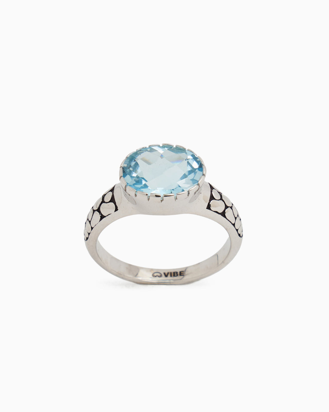 The Water Stone Ring with Turtle Texture showcases a faceted oval sky blue topaz stone...