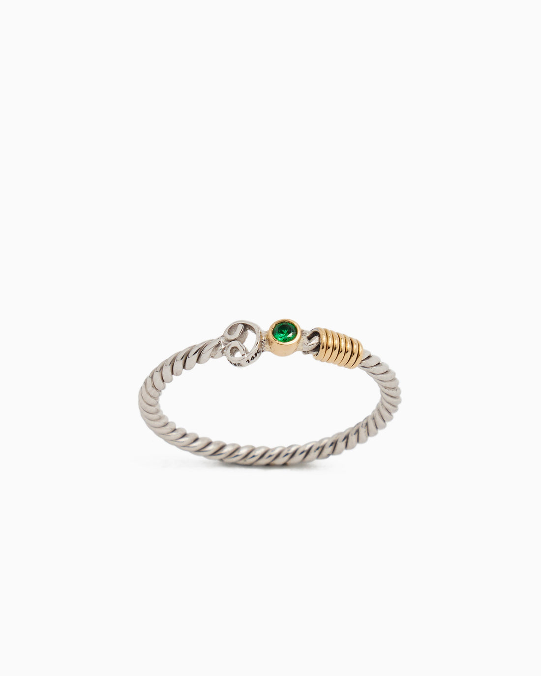 This sterling silver ring features an intertwined rope-inspired band, adorned with seven 14K gold good...