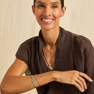 The sterling silver Twisted Hook Bracelet with Dewdrop Stone features an intertwined rope-inspired band adorned...
