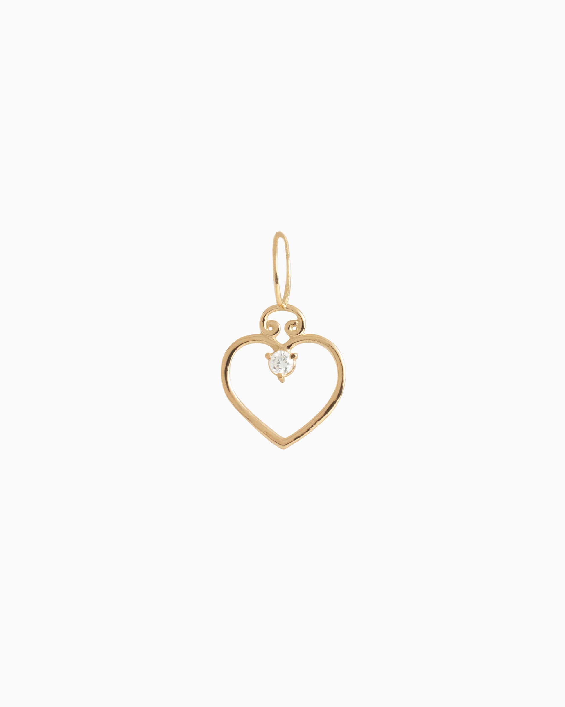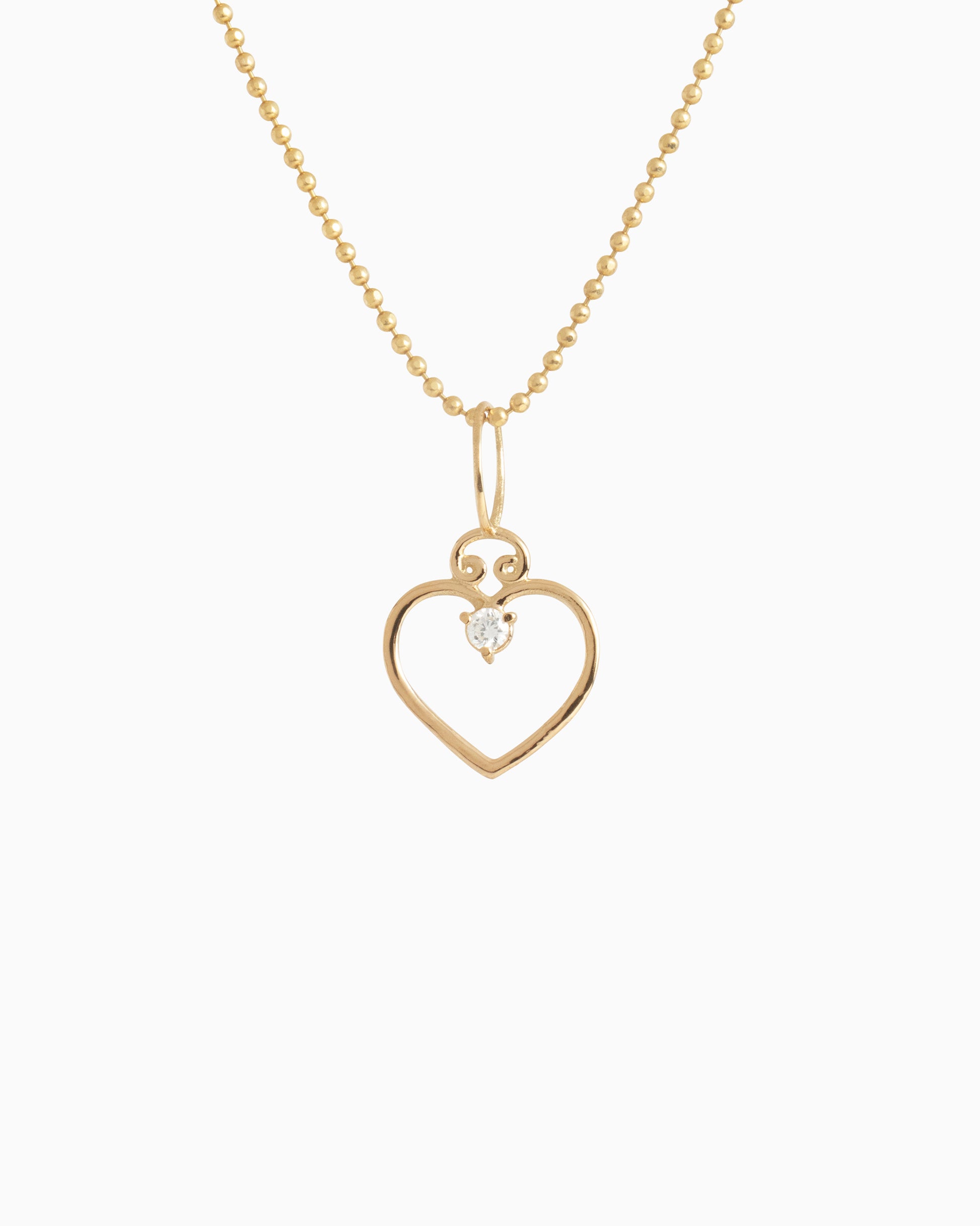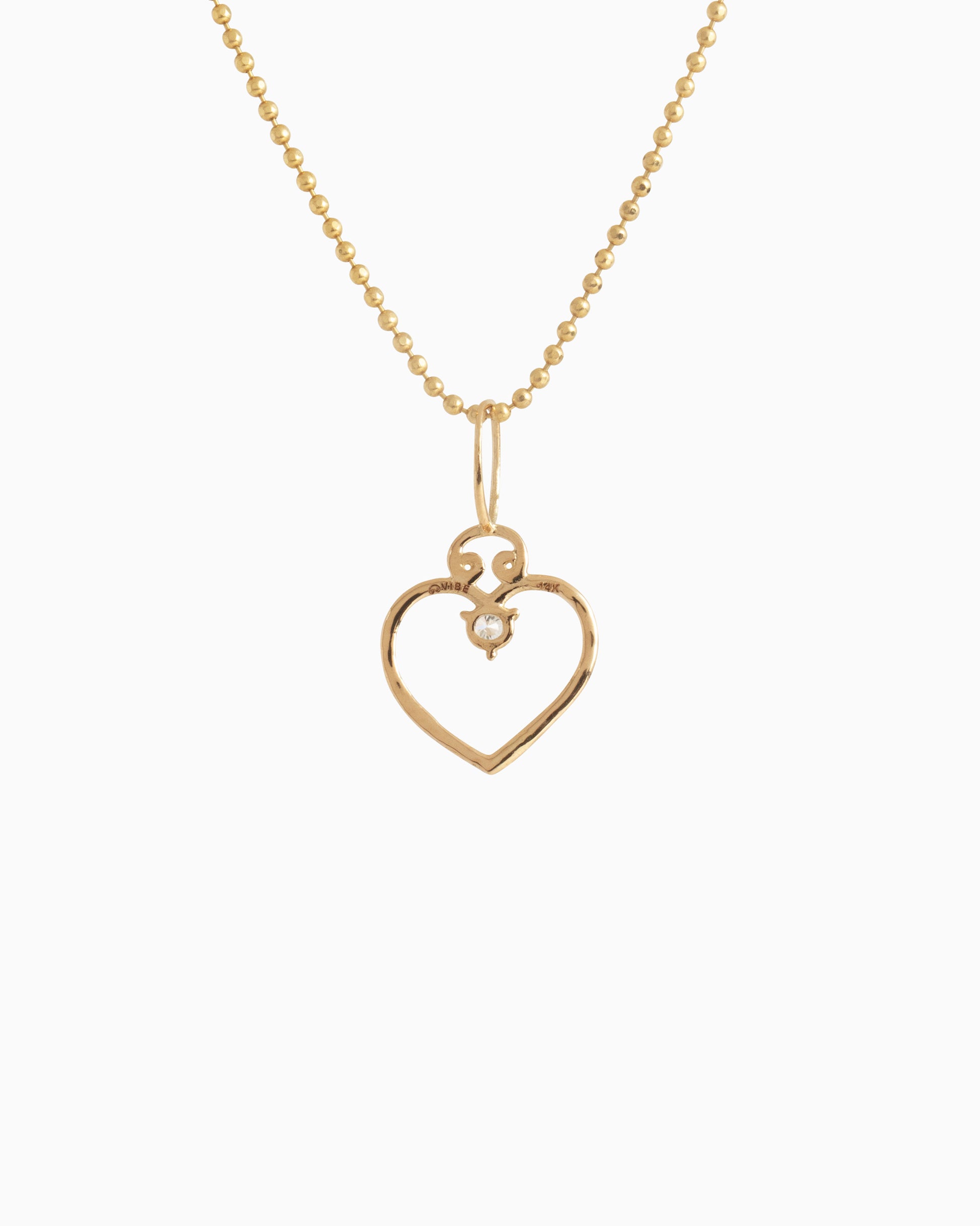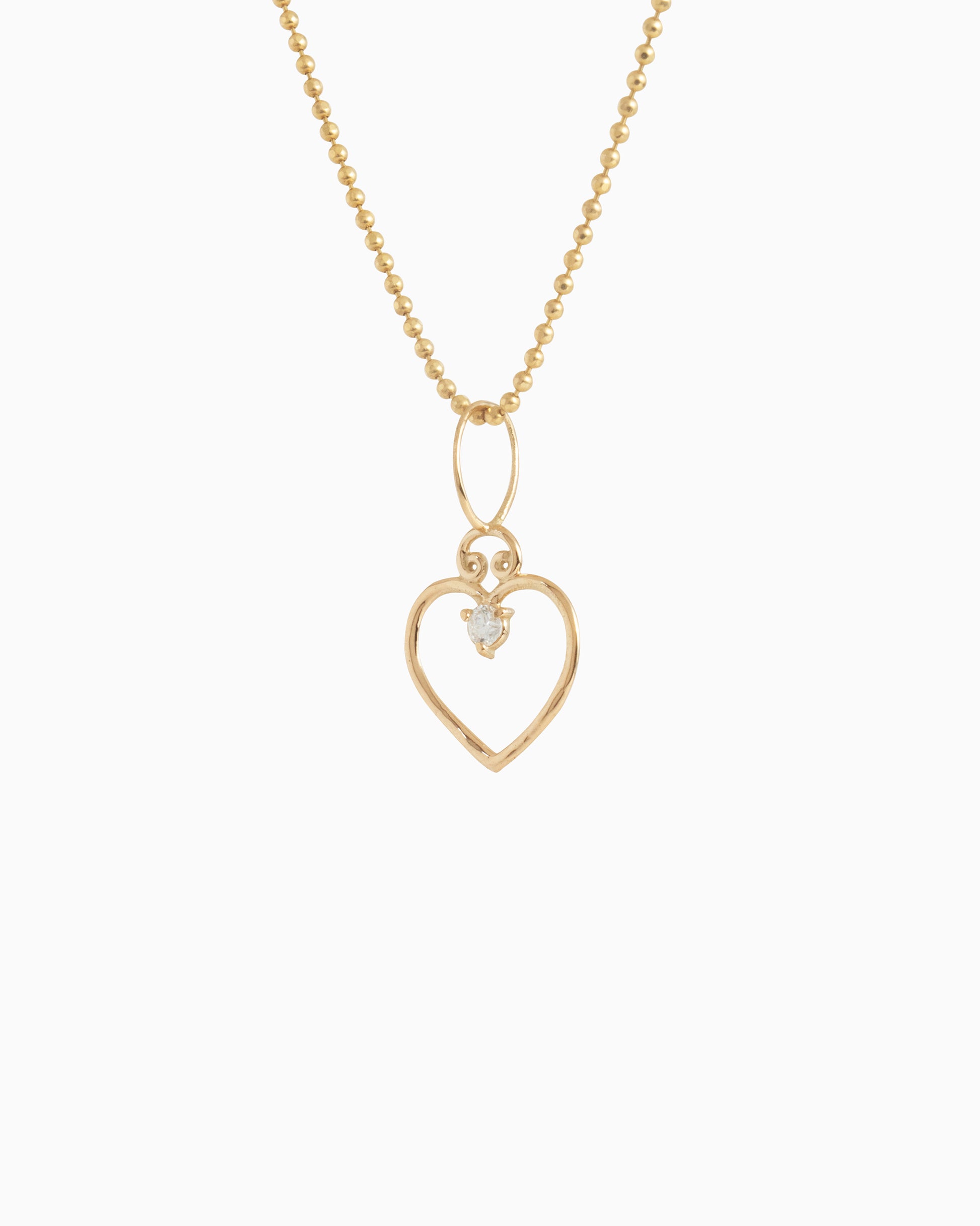 The Open Heart Pendant is handcrafted in 14K solid gold, featuring a heart shape and showcasing a stunning faceted diamond at the center. A petroglyph connects the heart to the bail, adding an extra Vibe touch to this dainty piece. Pair with your favorite chain, sold separately.