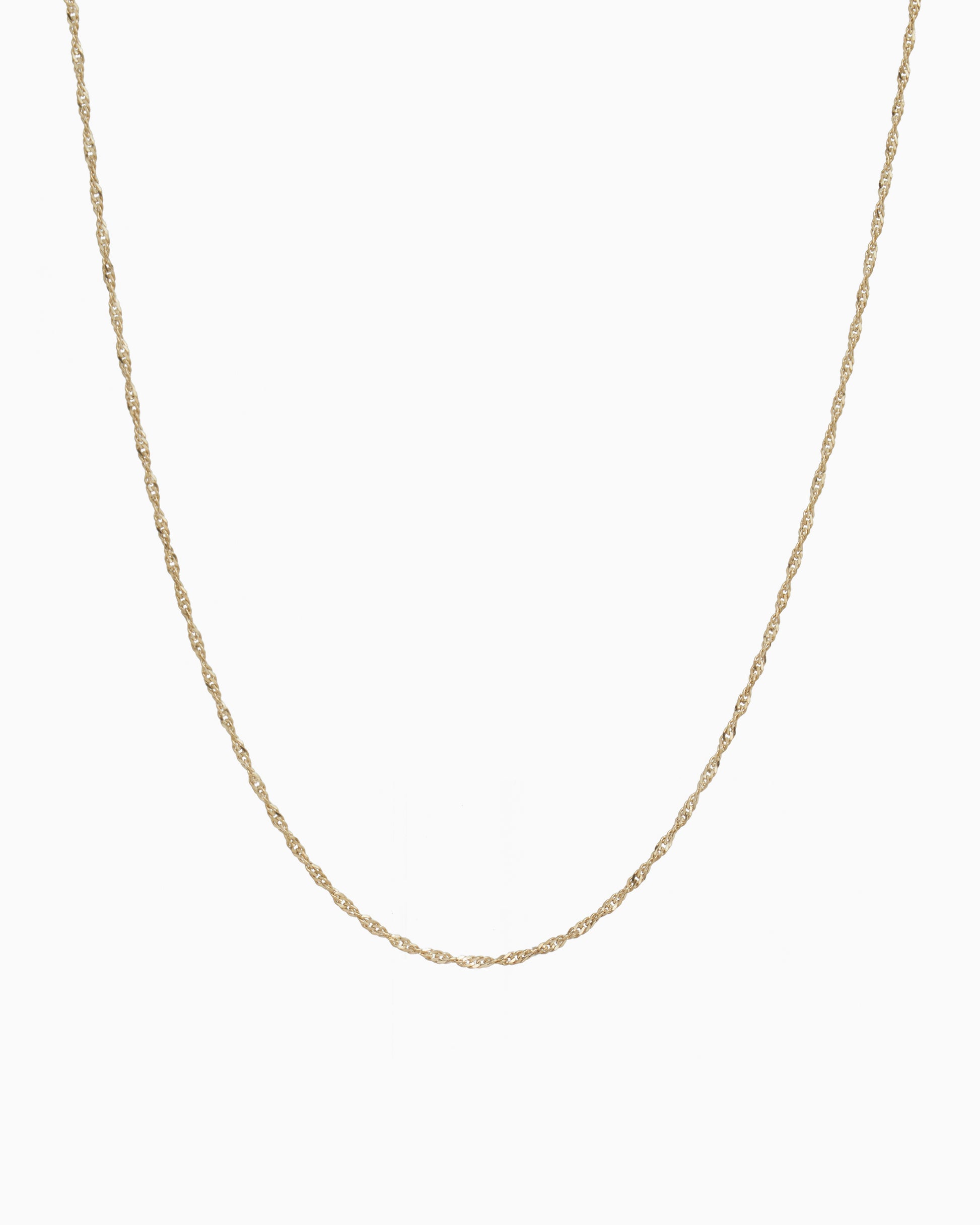 The Twist Chain is the everyday essential you've been looking for. Made in 14K solid gold, this sleek twisted singapore chain offers a highly textured look that strikes the perfect balance between contemporary and vintage styles. It's a versatile and timeless addition to your jewelry collection.