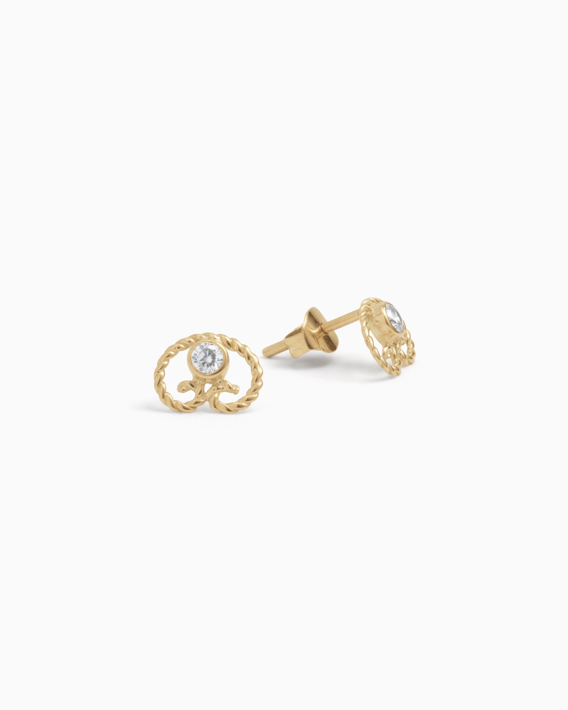 The Twisted Petroglyph Studs feature the St. John petroglyph handcrafted in 14K solid gold with a rope-inspired twist, accented by a bezel-set white zircon at the center. Petite yet full of meaning, they add a subtle island touch to any look.
