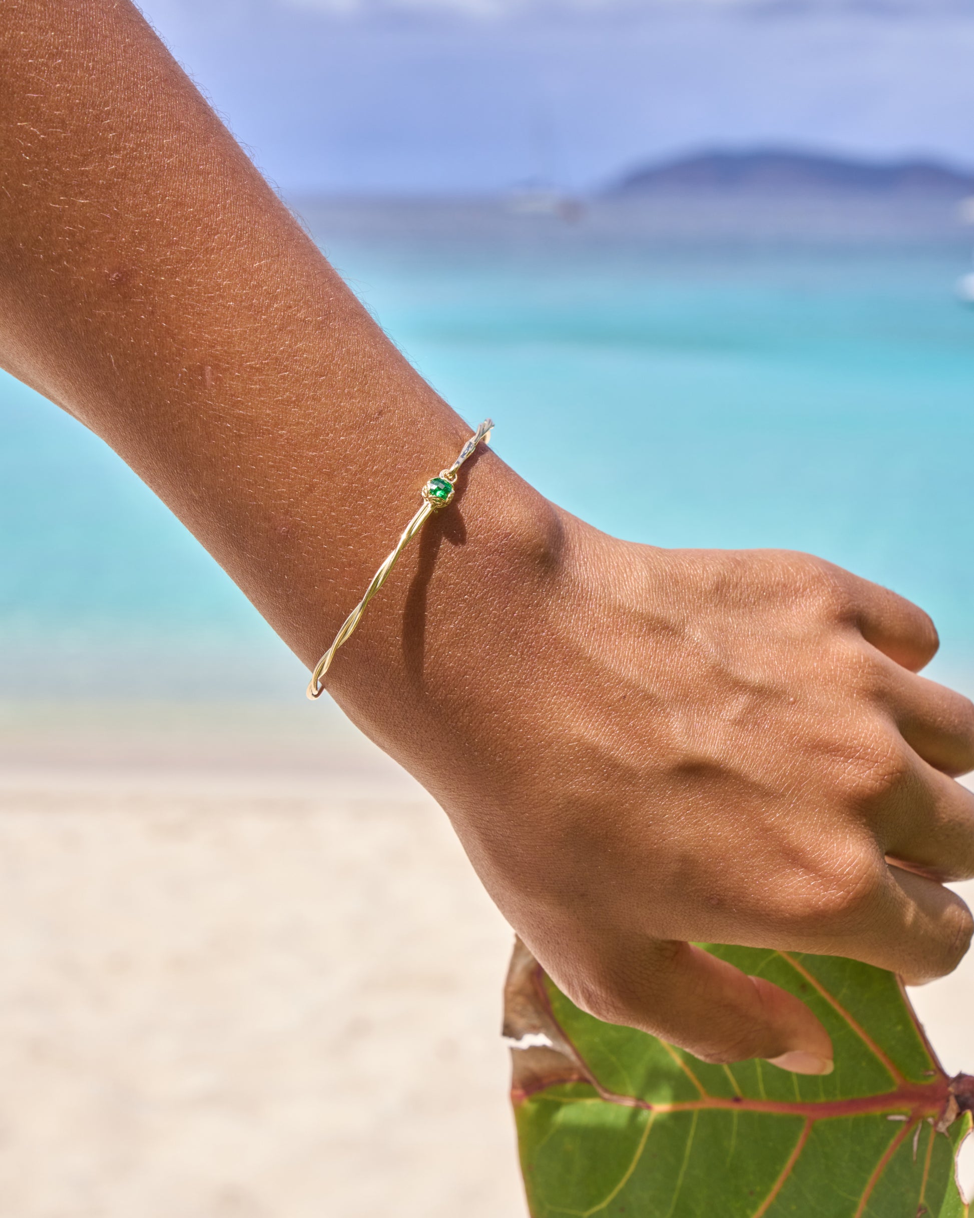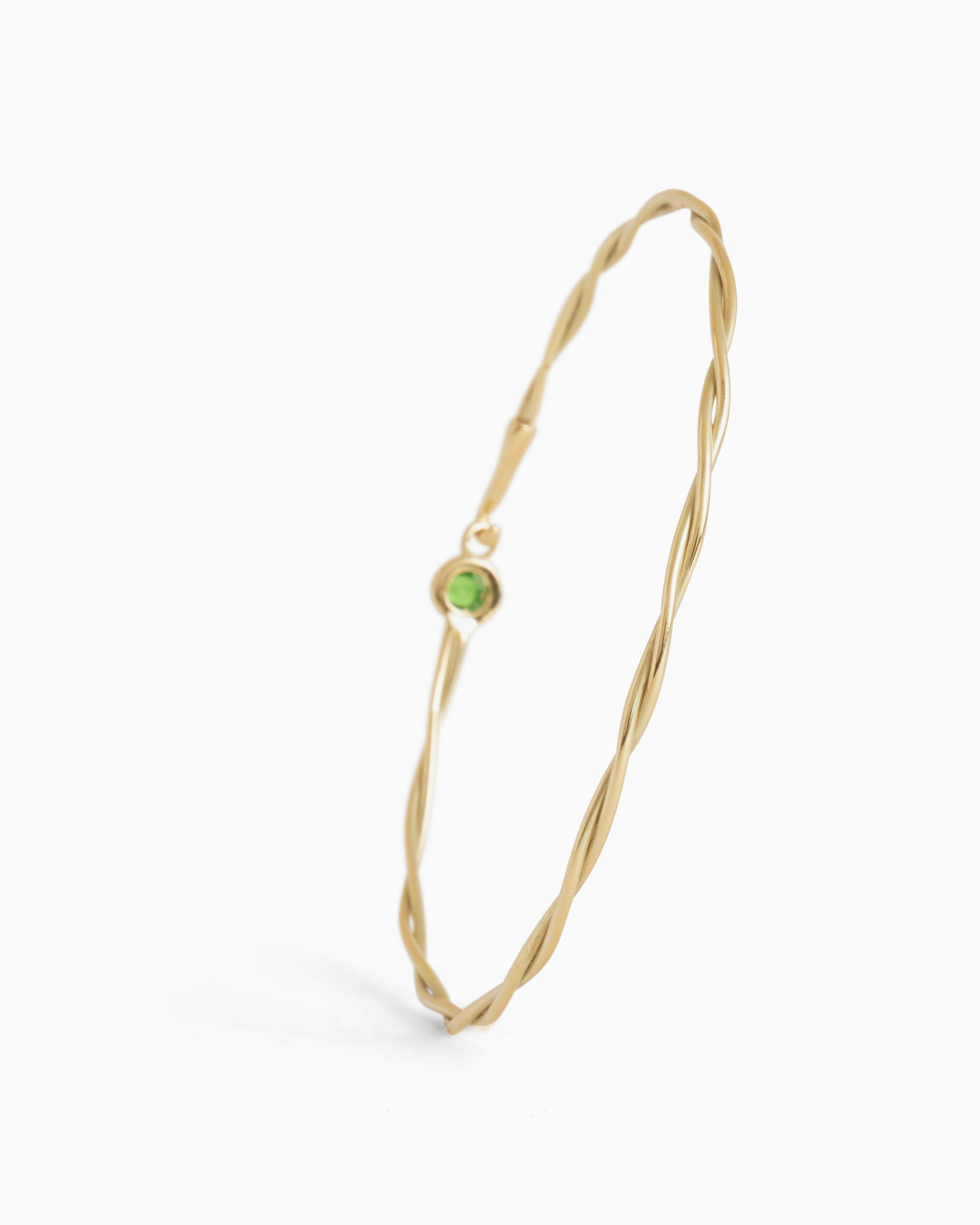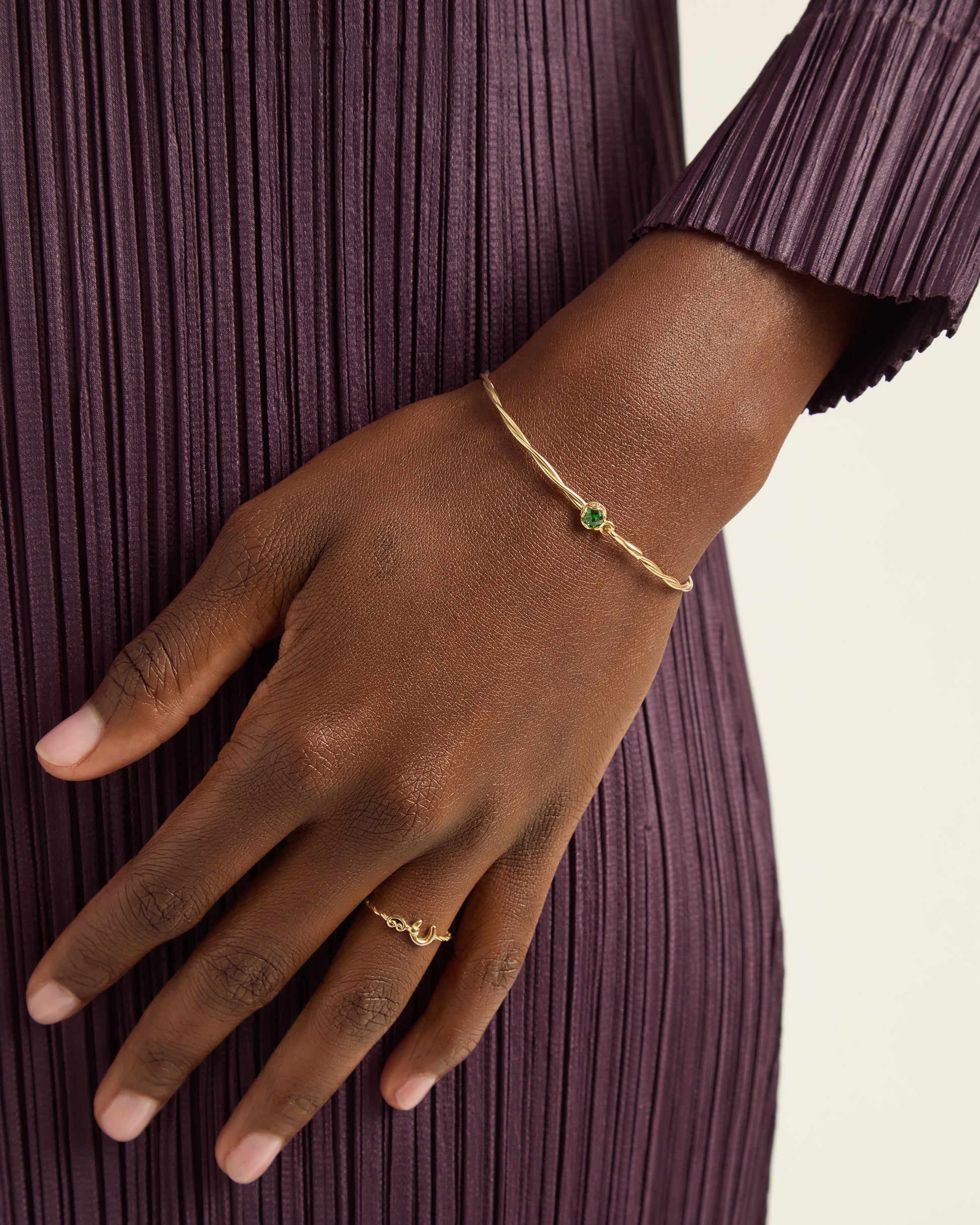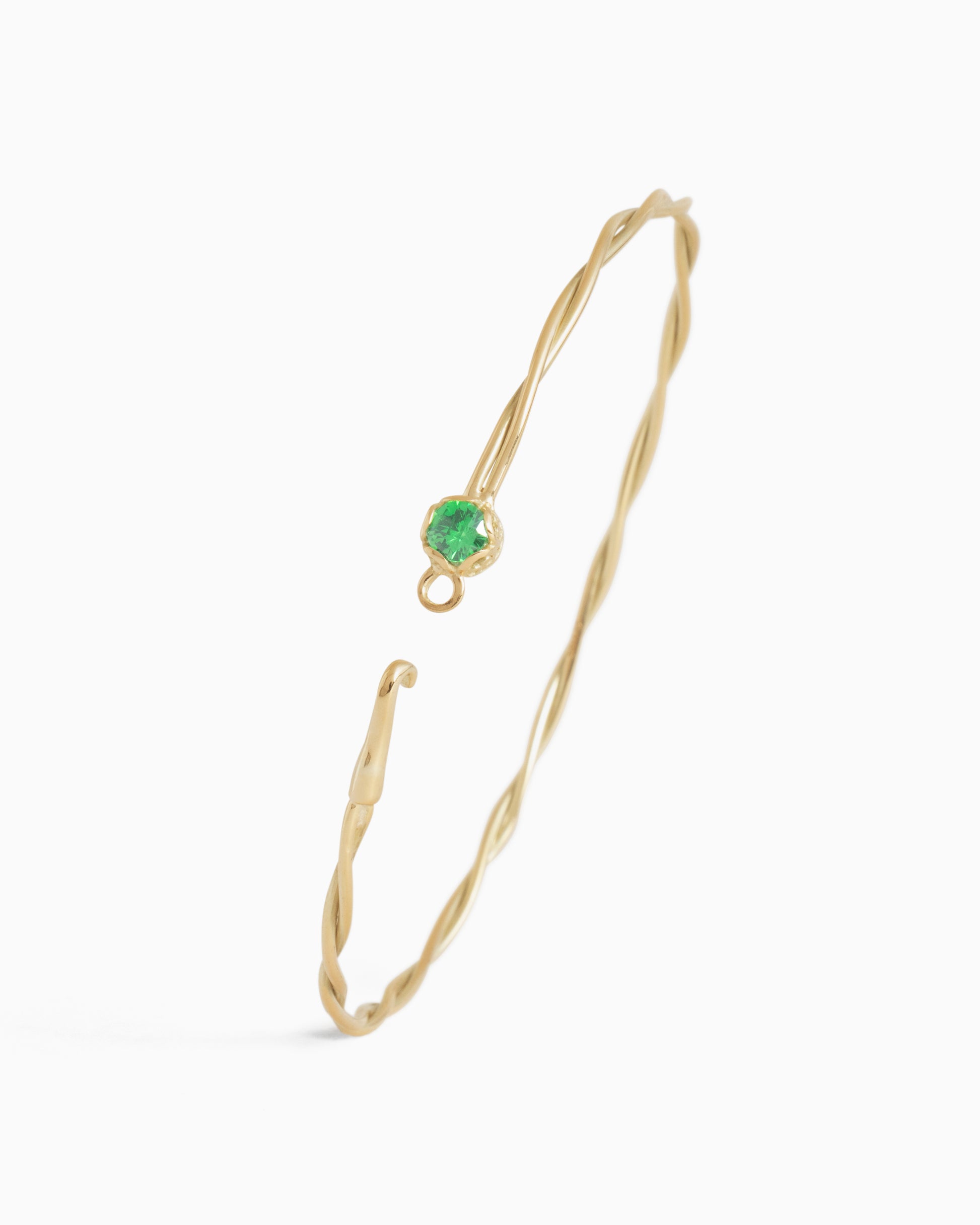 The Twisted Princess Hook Bracelet is a timeless design, handcrafted in 14K solid gold with an intertwined rope-inspired band. It showcases a faceted round green zircon stone, set with intricate petroglyph detailing around its base. A signature hook closure completes the look, making it a perfect standalone statement or a sophisticated addition to any stack.