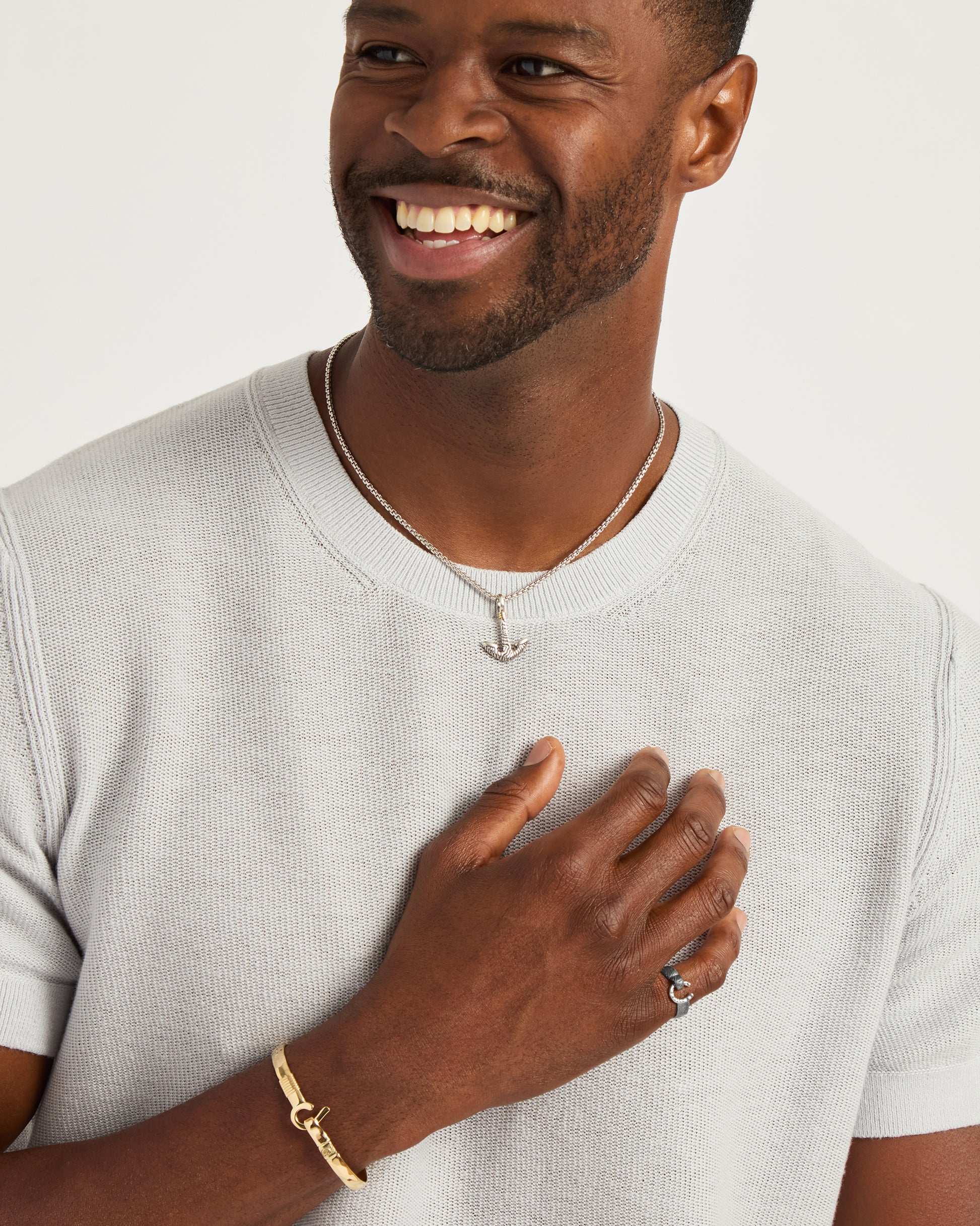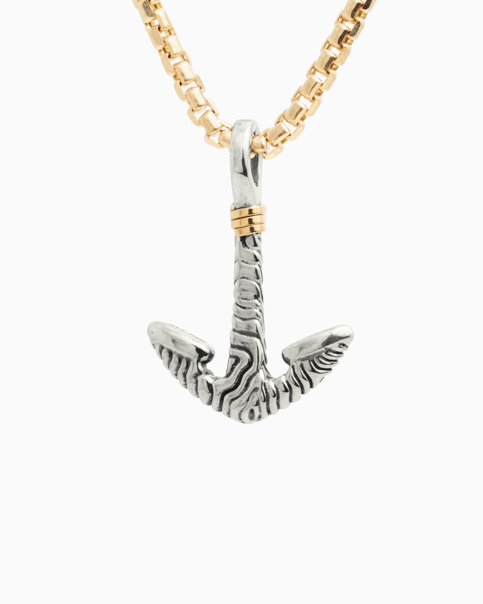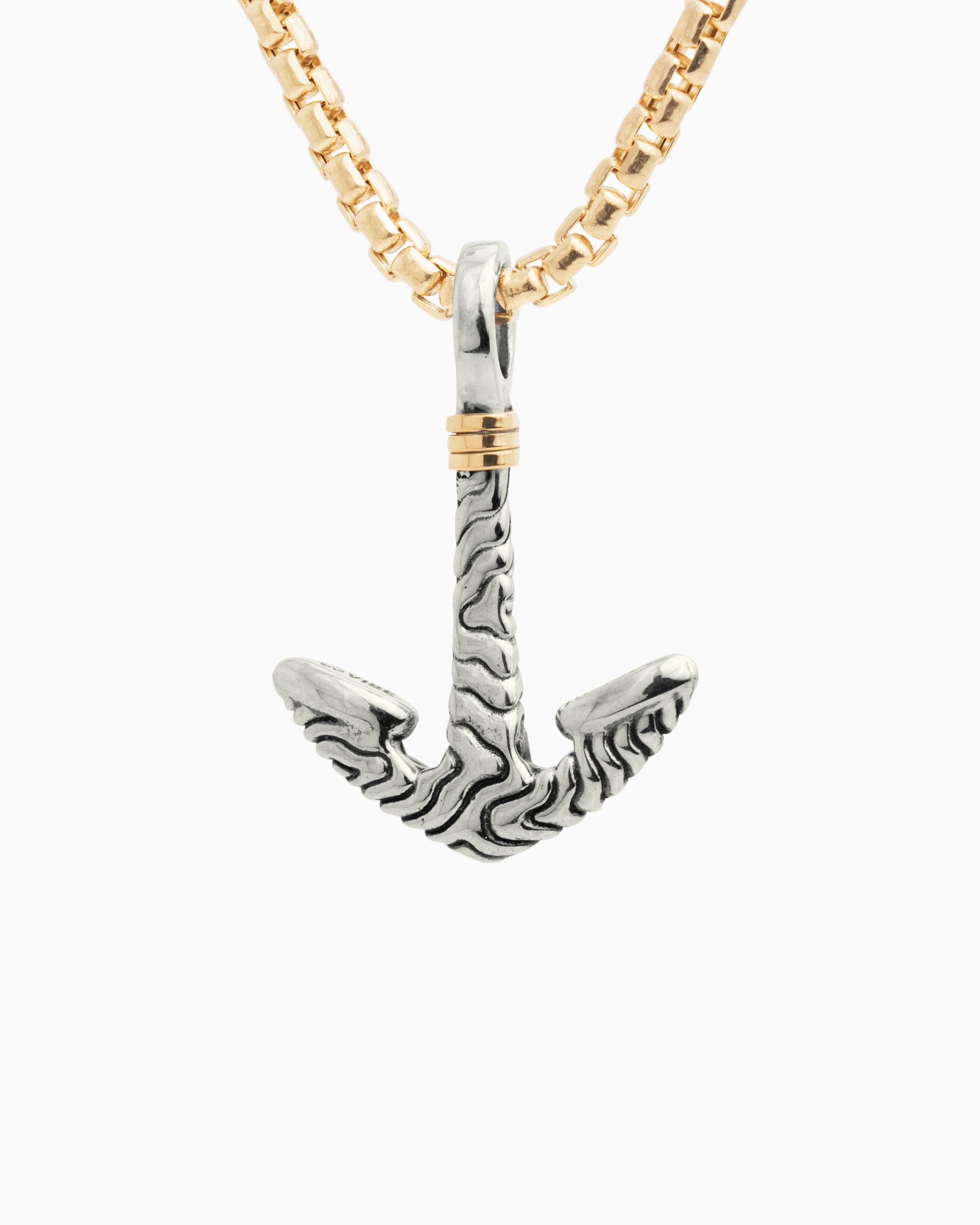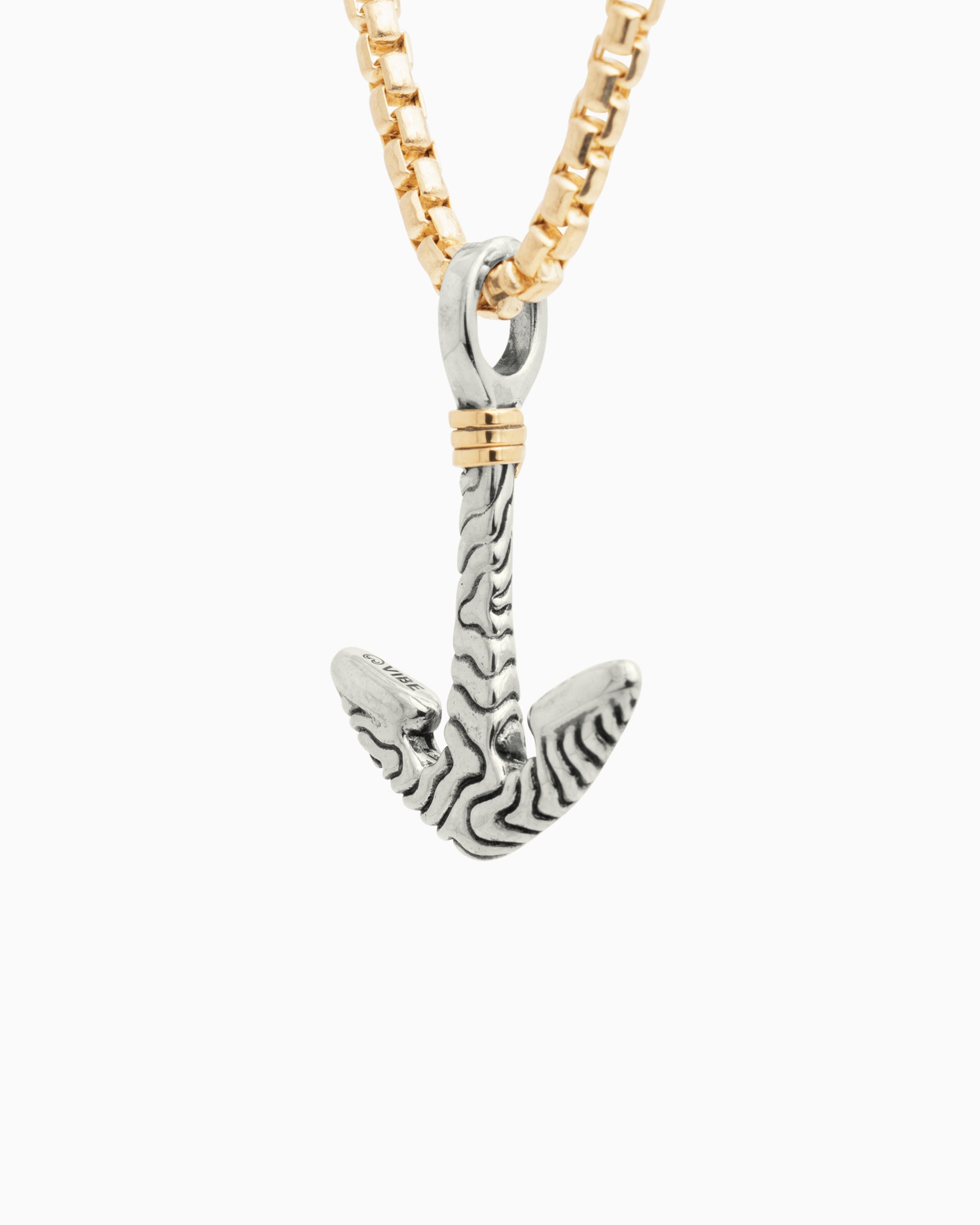 The nautical-inspired Anchor Pendant is handcrafted in sterling silver with our signature reef texture, designed to replicate the intricate patterns found in a reef. This pendant features 14K gold good luck wraps which are found in many of our designs. Vibe’s good luck wraps represent love, laughter, happiness, good fortune, health, unity, and peace. Pair with your favorite chain, sold separately.