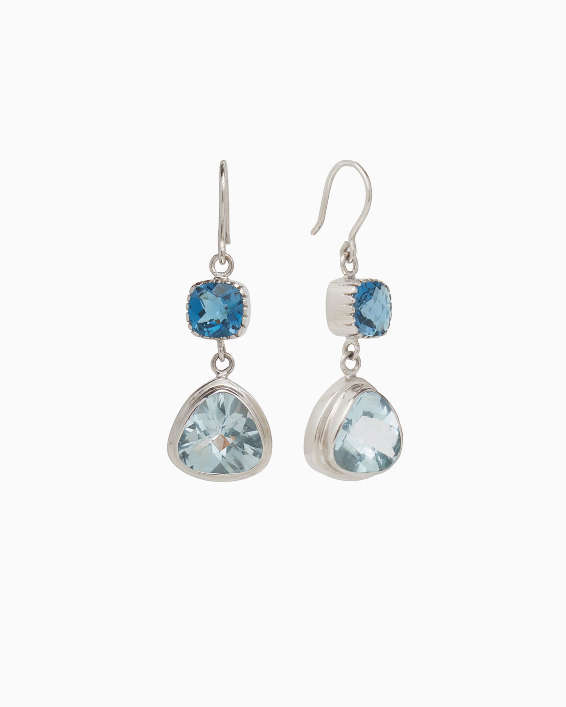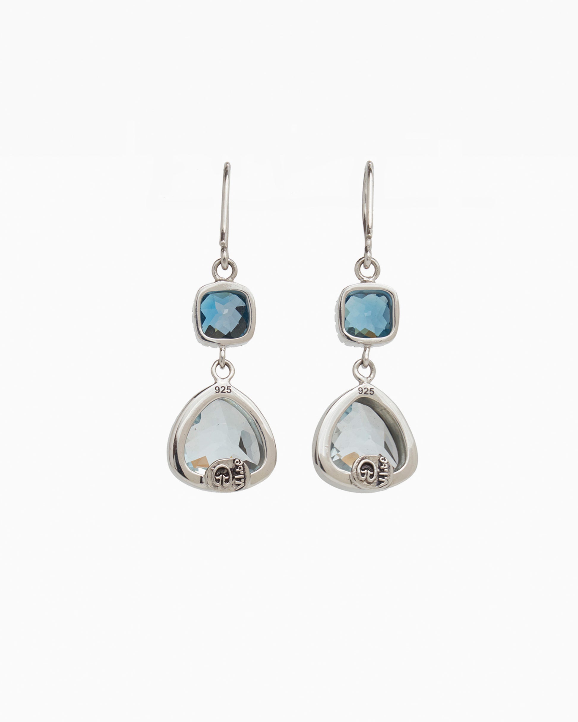 Timeless and bold, the Angelfish Double Stone Drop Earrings are a great addition to your jewelry collection. Handcrafted from sterling silver, these earrings showcase a harmonious blend of two stacked stones: a petite square London blue topaz and a larger triangular sky blue topaz, creating a stunning contrast and a truly eye-catching design.