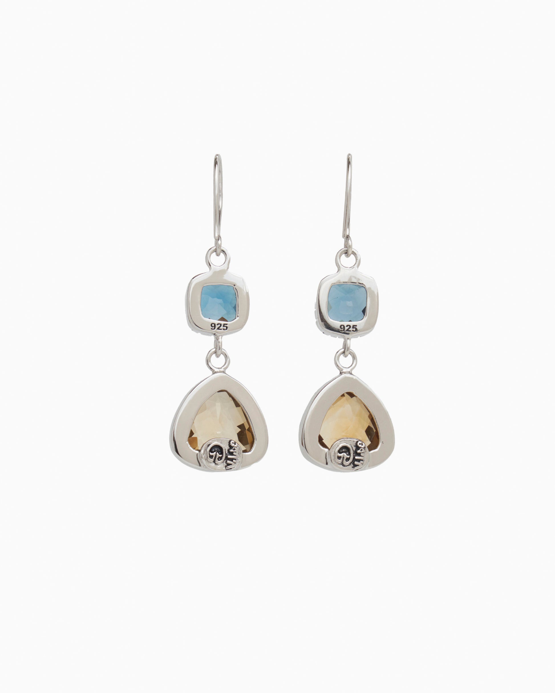 Timeless and bold, the Angelfish Double Stone Drop Earrings are a great addition to your jewelry collection. Handcrafted from sterling silver, these earrings showcase a harmonious blend of two stacked stones: a petite square London blue topaz and a larger triangular citrine, creating a stunning contrast and a truly eye-catching design.