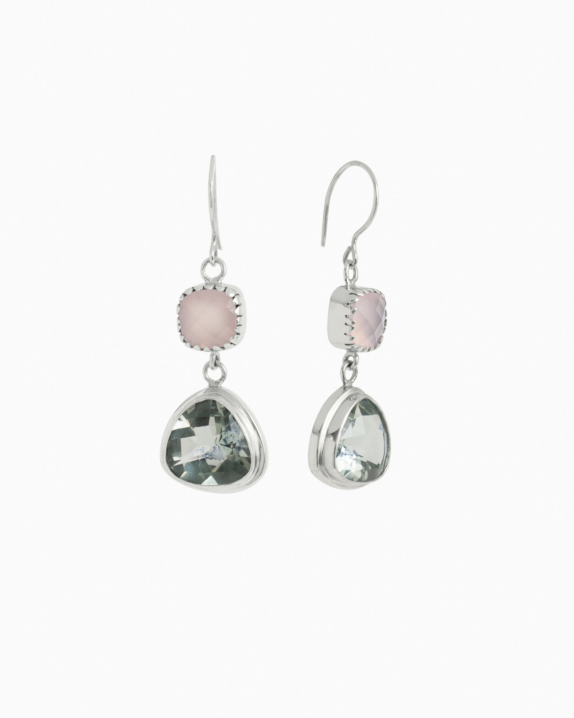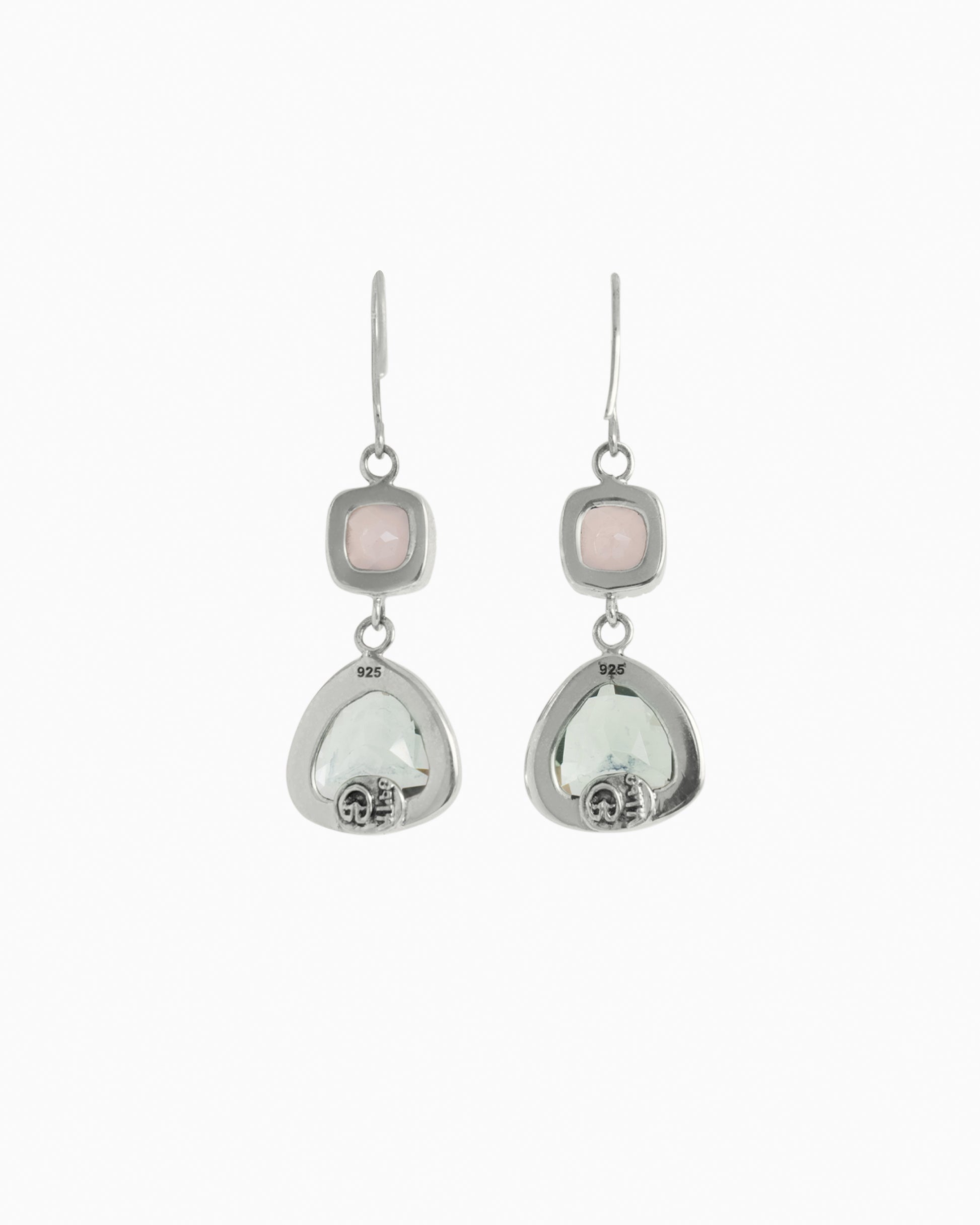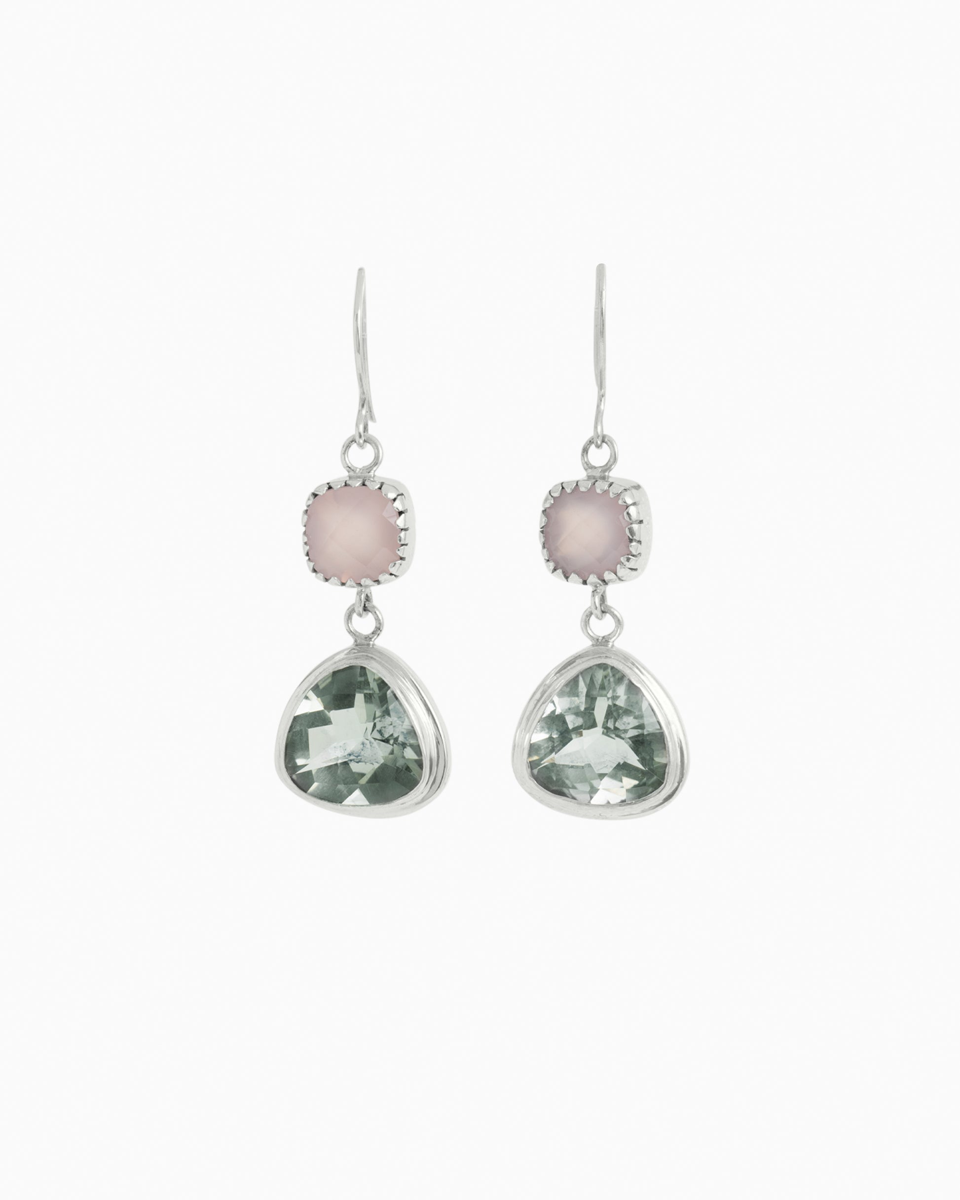 Timeless and bold, the Angelfish Double Stone Drop Earrings are a great addition to your jewelry collection. Handcrafted from sterling silver, these earrings showcase a harmonious blend of two stacked stones: a petite square rose quartz and a larger triangular prasiolite, creating a stunning contrast and a truly eye-catching design.