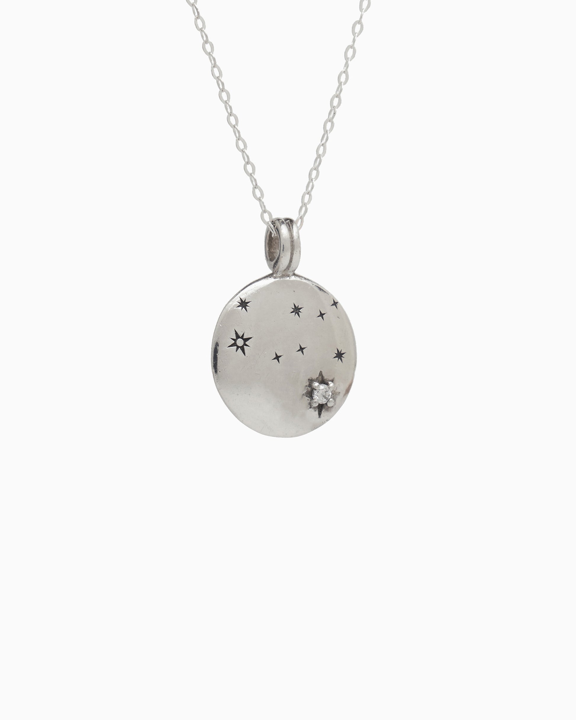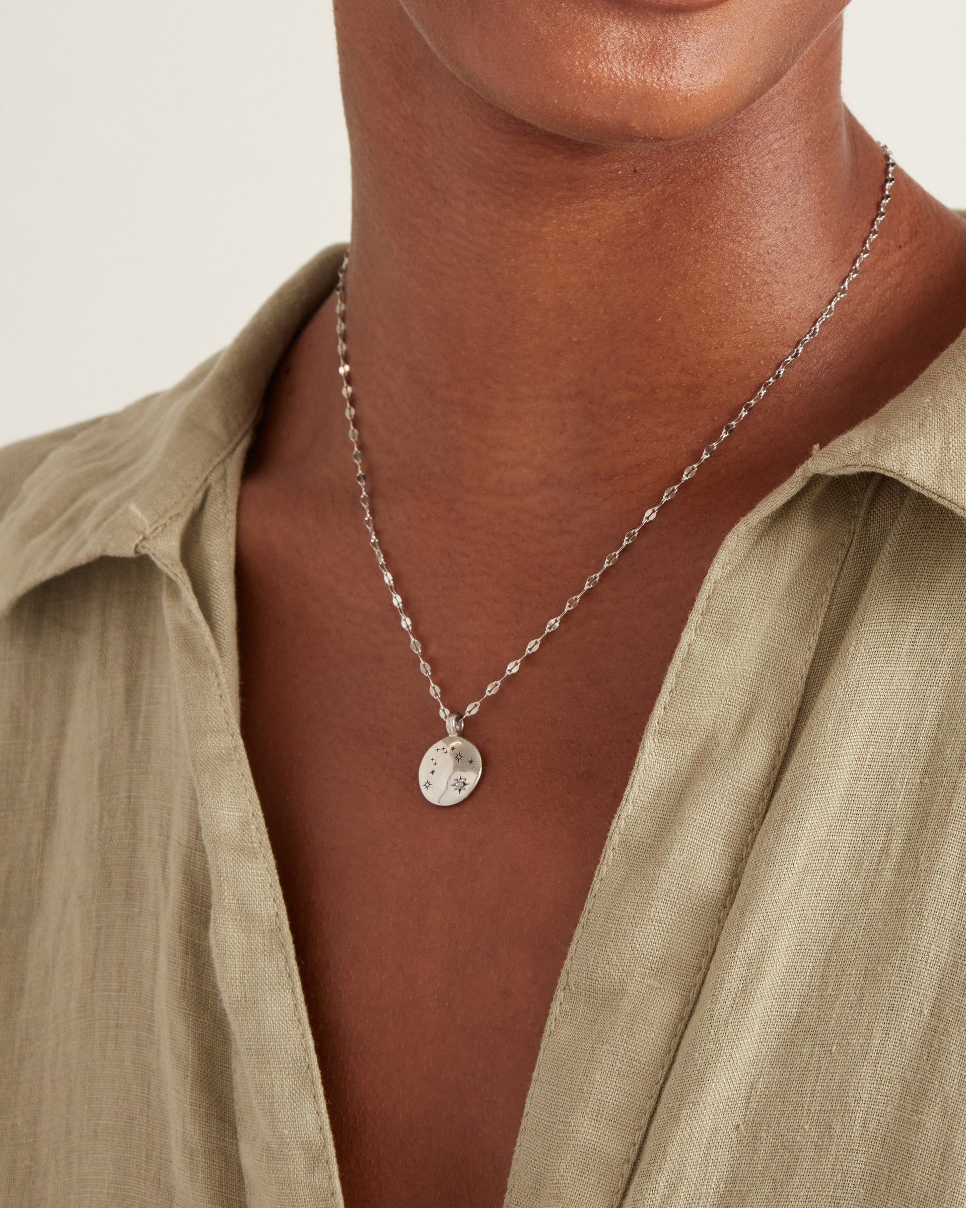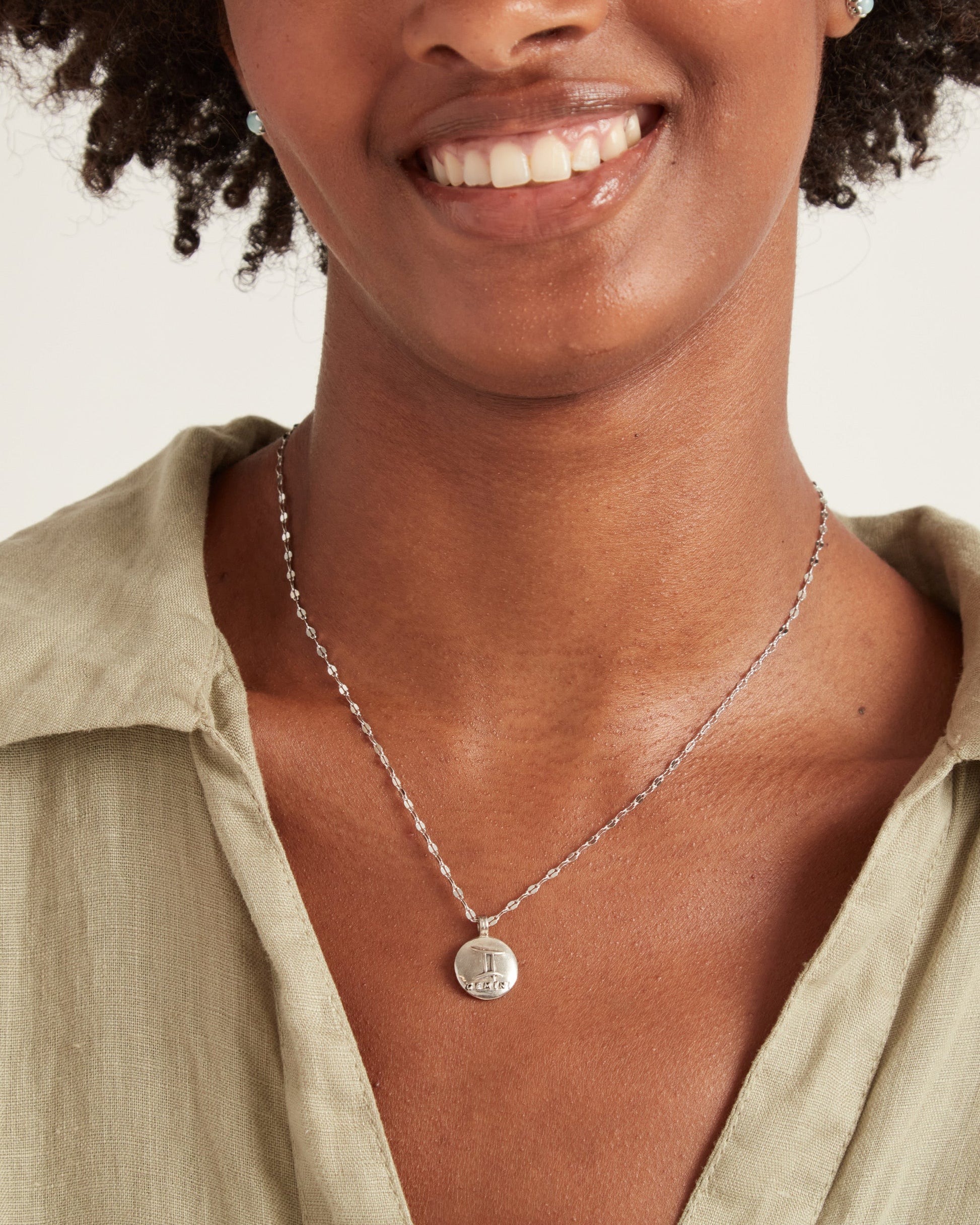 The Astrology Pendant is handcrafted from sterling silver, showcasing the Gemini zodiac symbol on one side and the constellation on the other, with a faceted zircon stone representing the brightest star. This pendant is a thoughtful gift, whether it's for yourself or someone else in your life, symbolizing their unique traits and celestial connection. Pair with your favorite chain, sold separately.