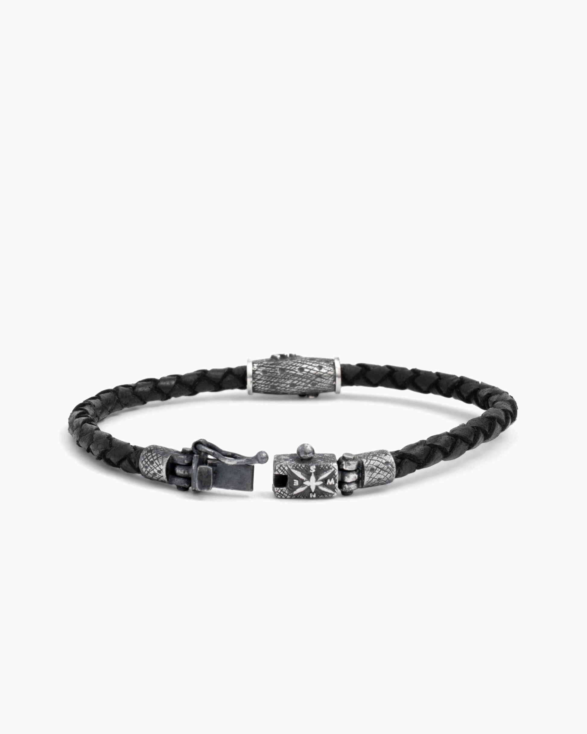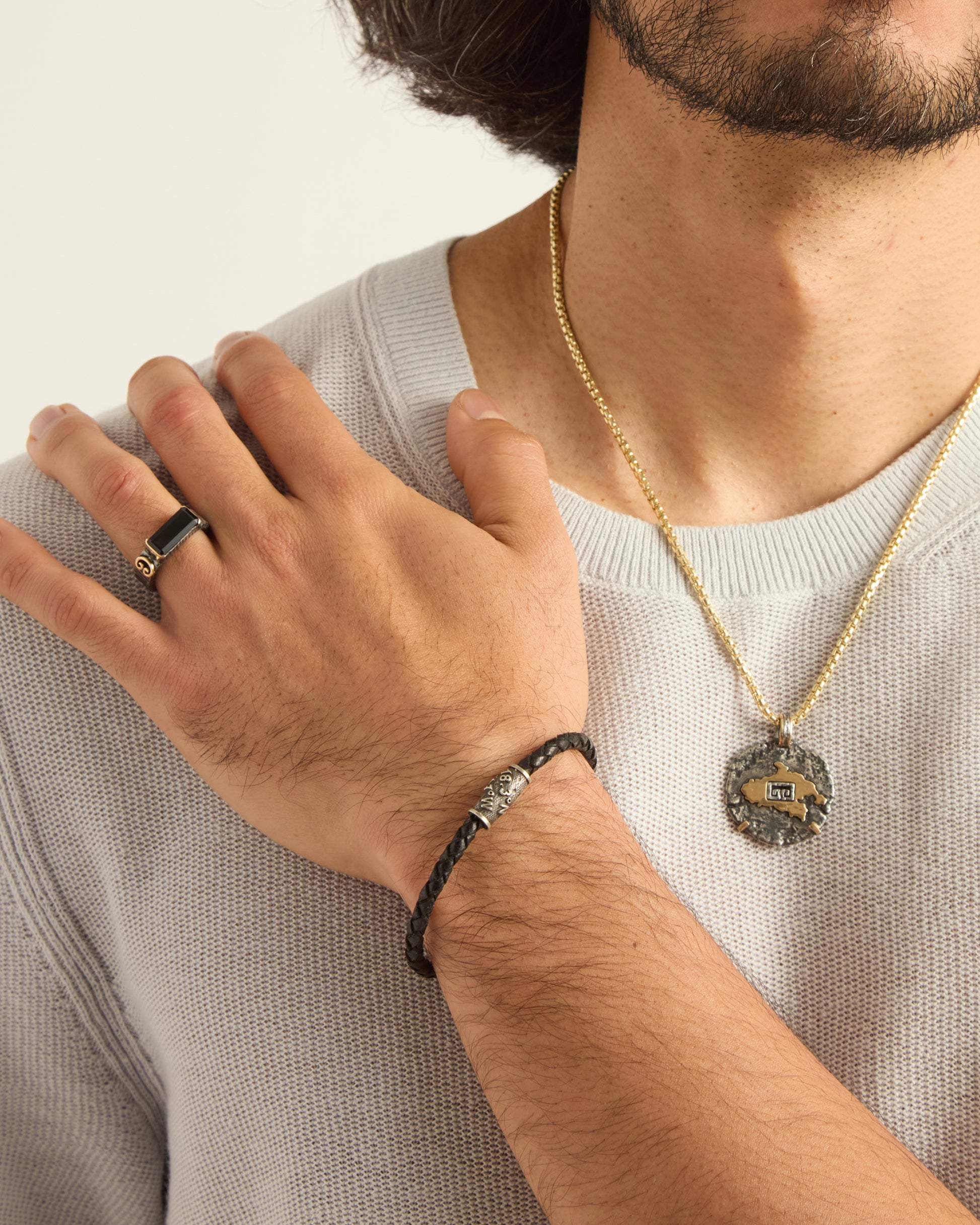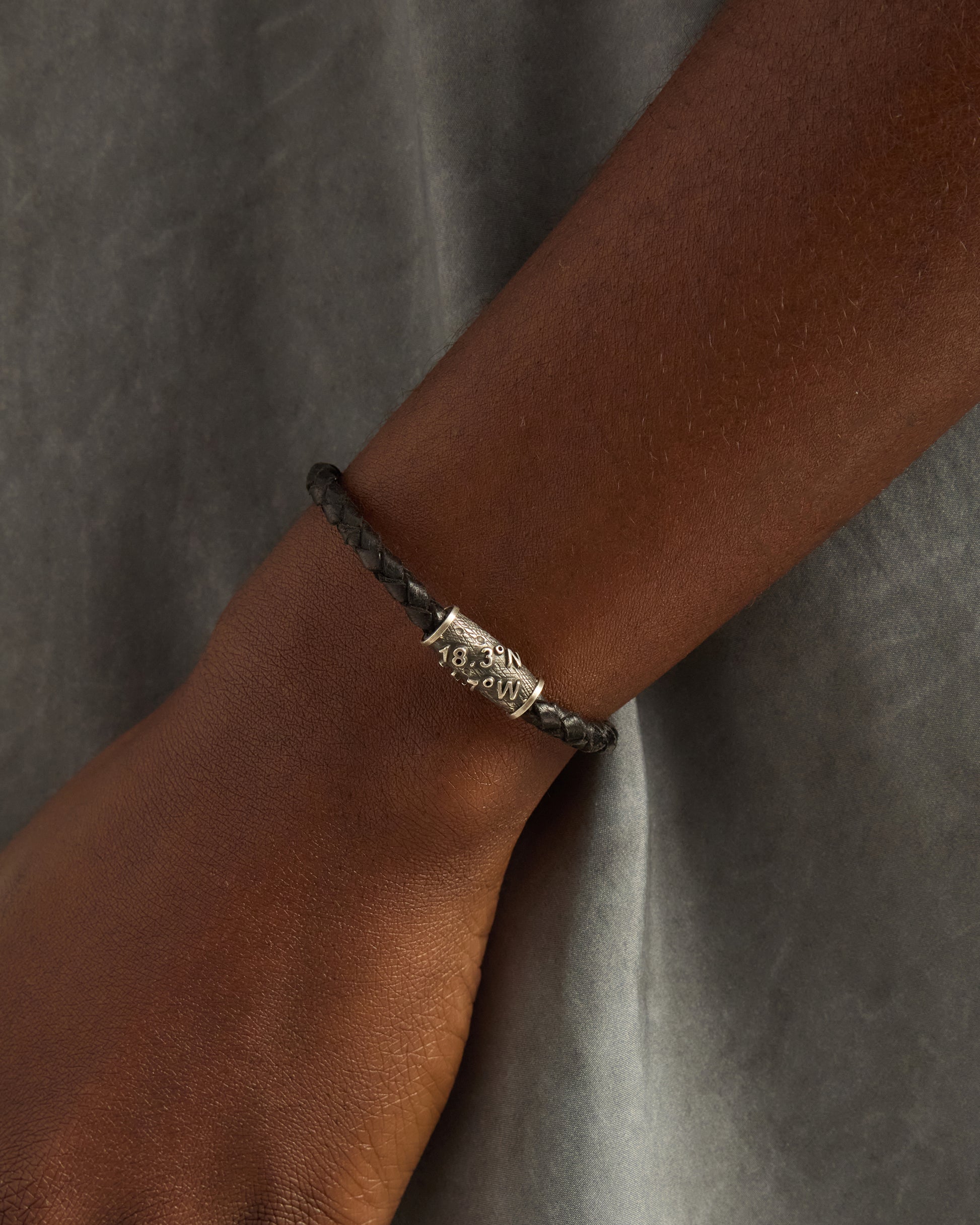 The Braided Leather Coordinates Bracelet features a sleek black hand-braided leather band and an oxidized silver center bead etched with the coordinates of St. John. Detailed with marine texture and finished with a streamlined clasp built for daily wear.