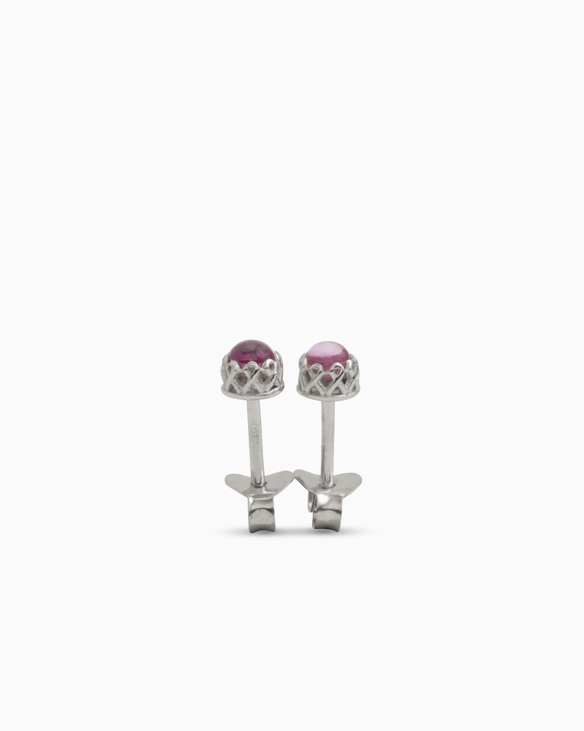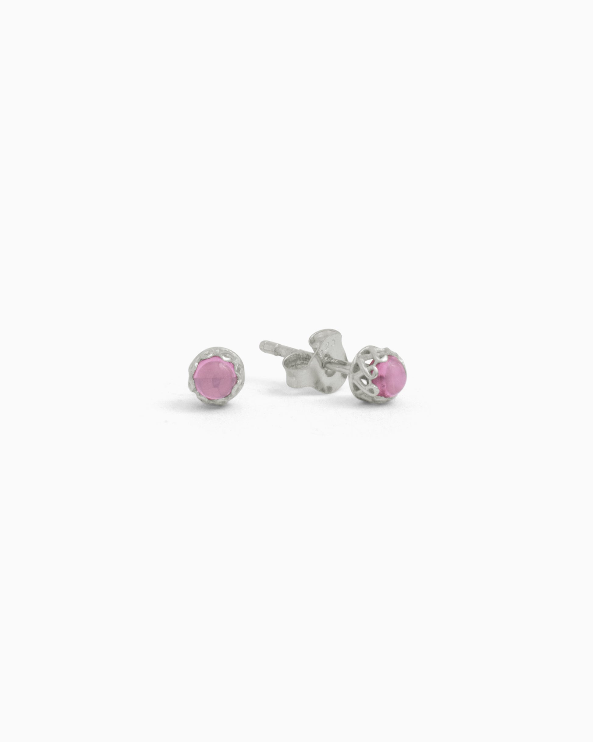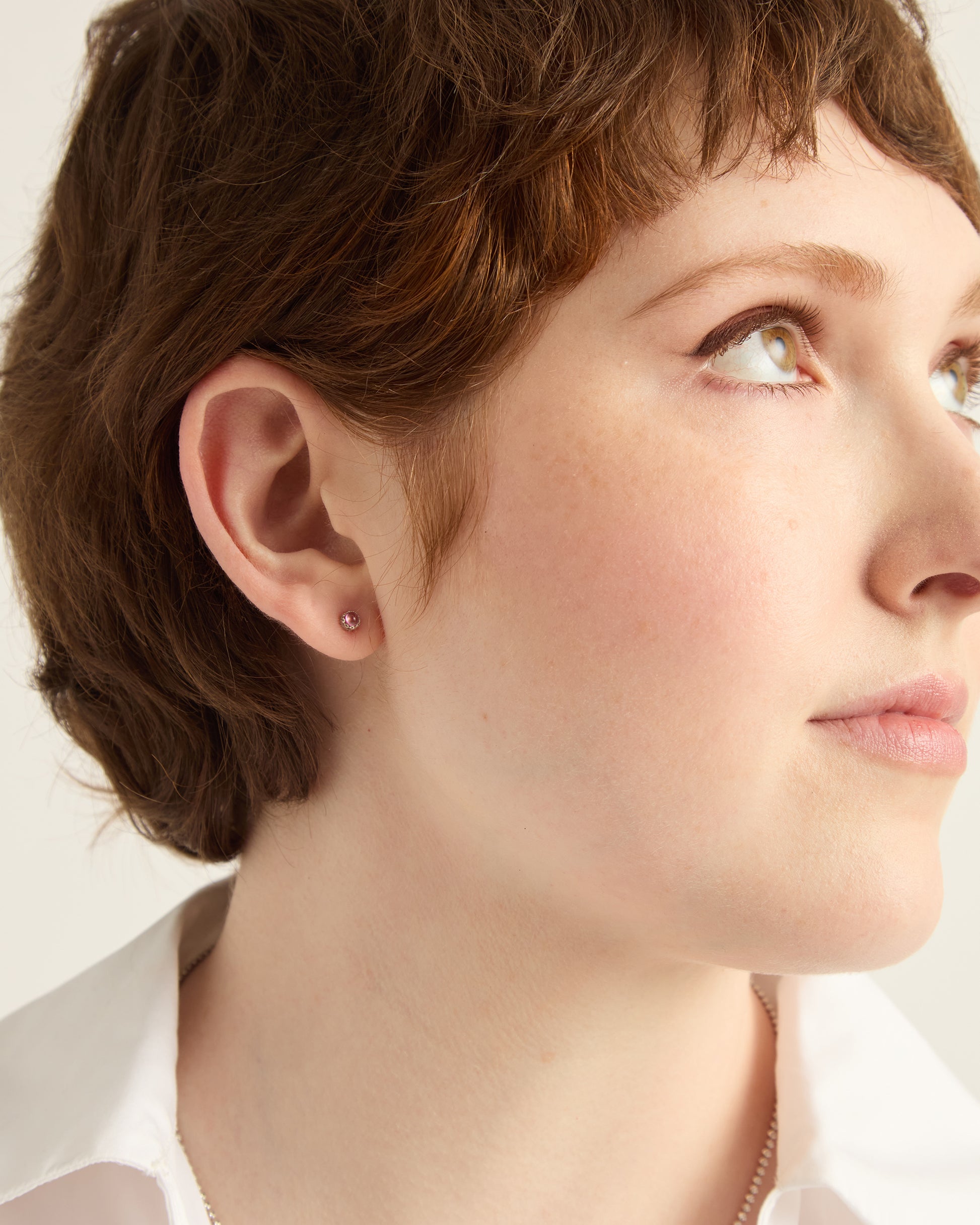 The Breast Cancer Awareness Stud Earrings are handcrafted in sterling silver and feature pink zircon cabochons, encircled in a setting of interwoven awareness ribbons. A quiet tribute to resilience, hope, and love—petite enough for everyday wear, with just the right touch of shimmer.
