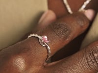 The Pink Ribbon Twisted Stone Ring is handcrafted in sterling silver with a twisted, rope-inspired band and featuring a pink zircon cabochon, encircled in a setting of interwoven awareness ribbons. A quiet tribute to resilience, hope, and love—designed in honor of Breast Cancer Awareness and the strength of those impacted by it.