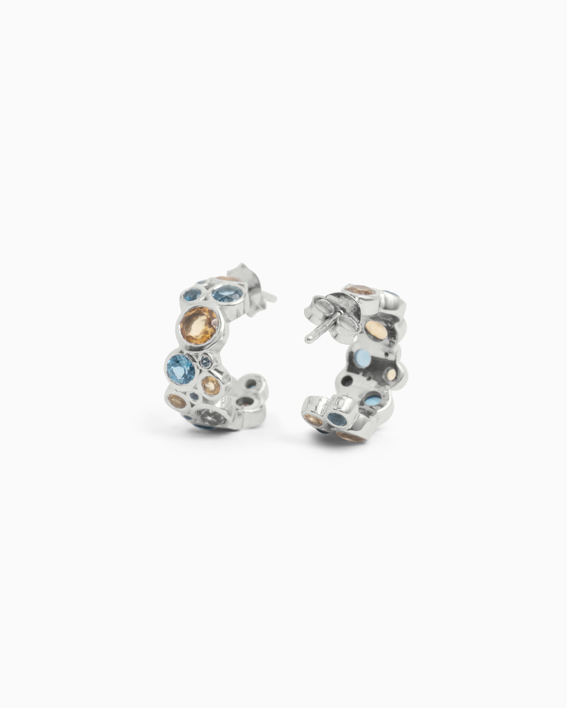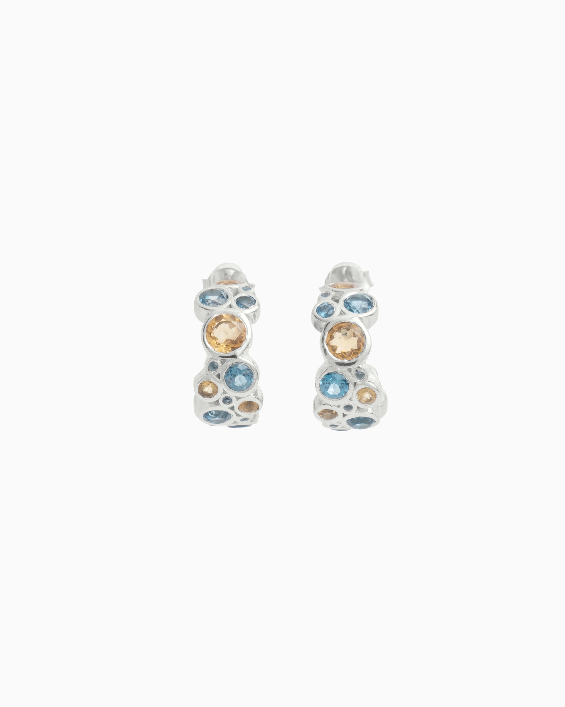 The Bubble Stone Hoops feature allover clusters of London blue topaz and citrine set in sterling silver. These handcrafted earrings are great for an occasion or everyday wear.