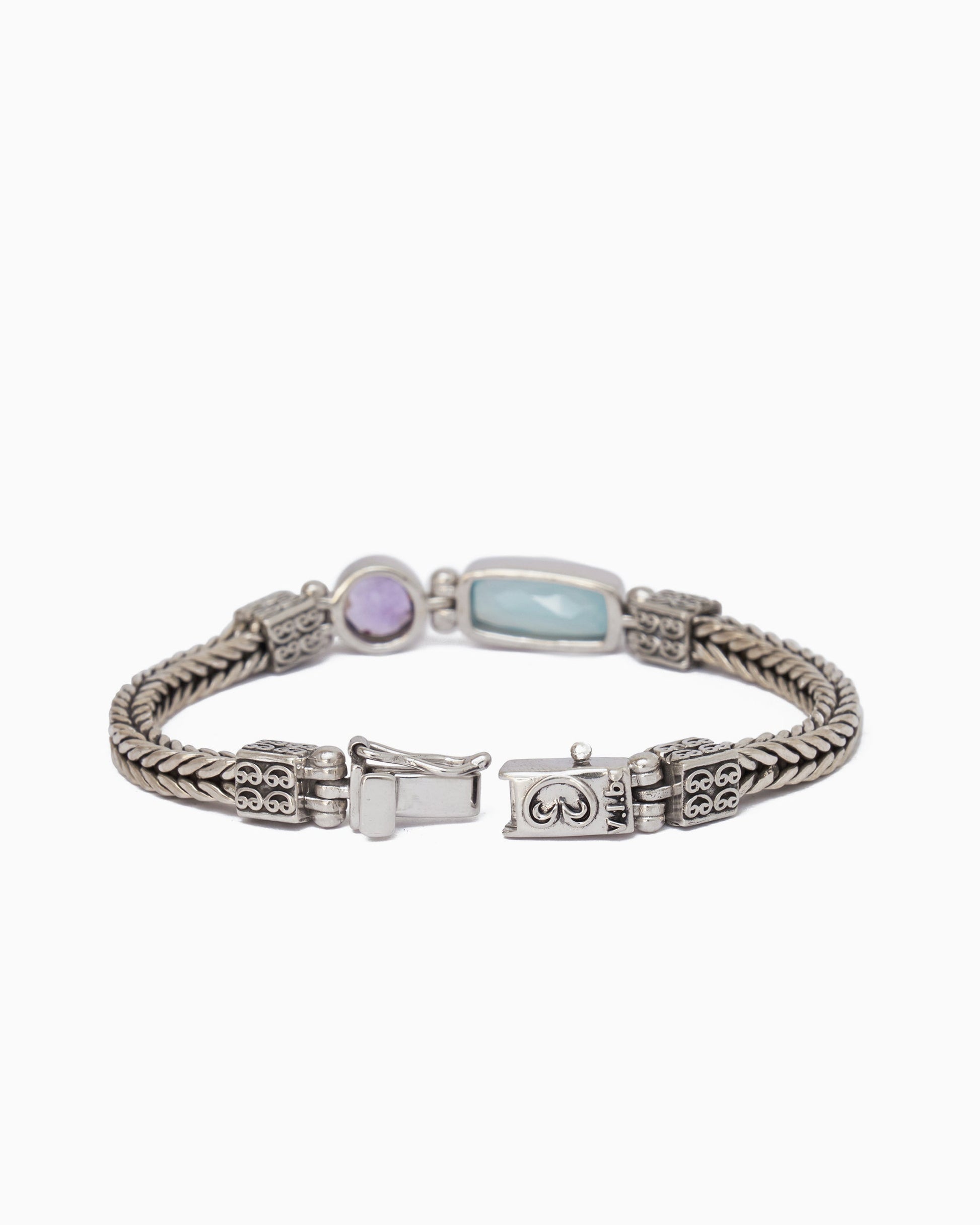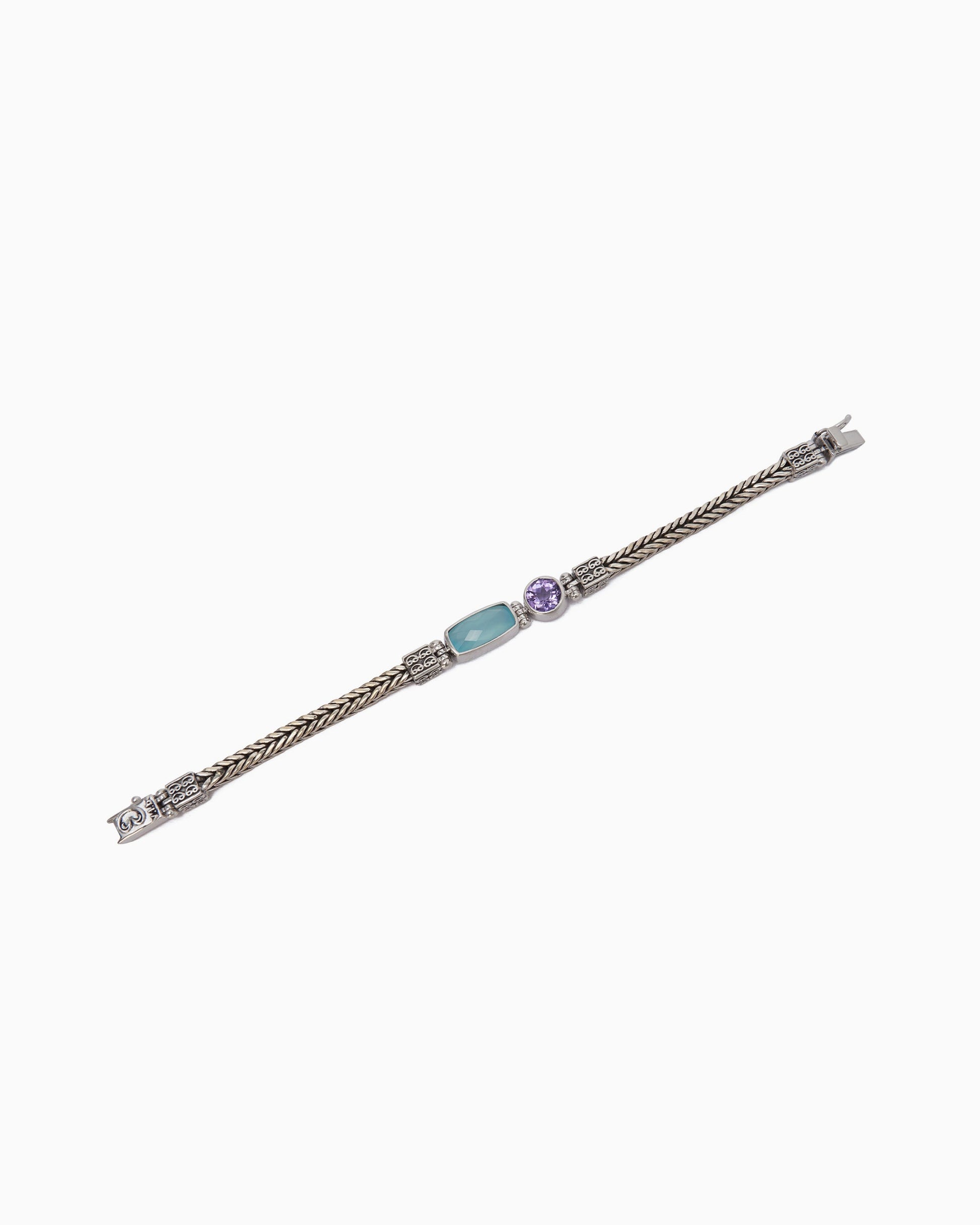 The Bubble Stone Link Bracelet is handcrafted from sterling silver and features a braided band with two luminous stones: an elongated faceted chalcedony stone and round cushion-cut amethyst stone. Pair with any hook bracelet for extra flair.