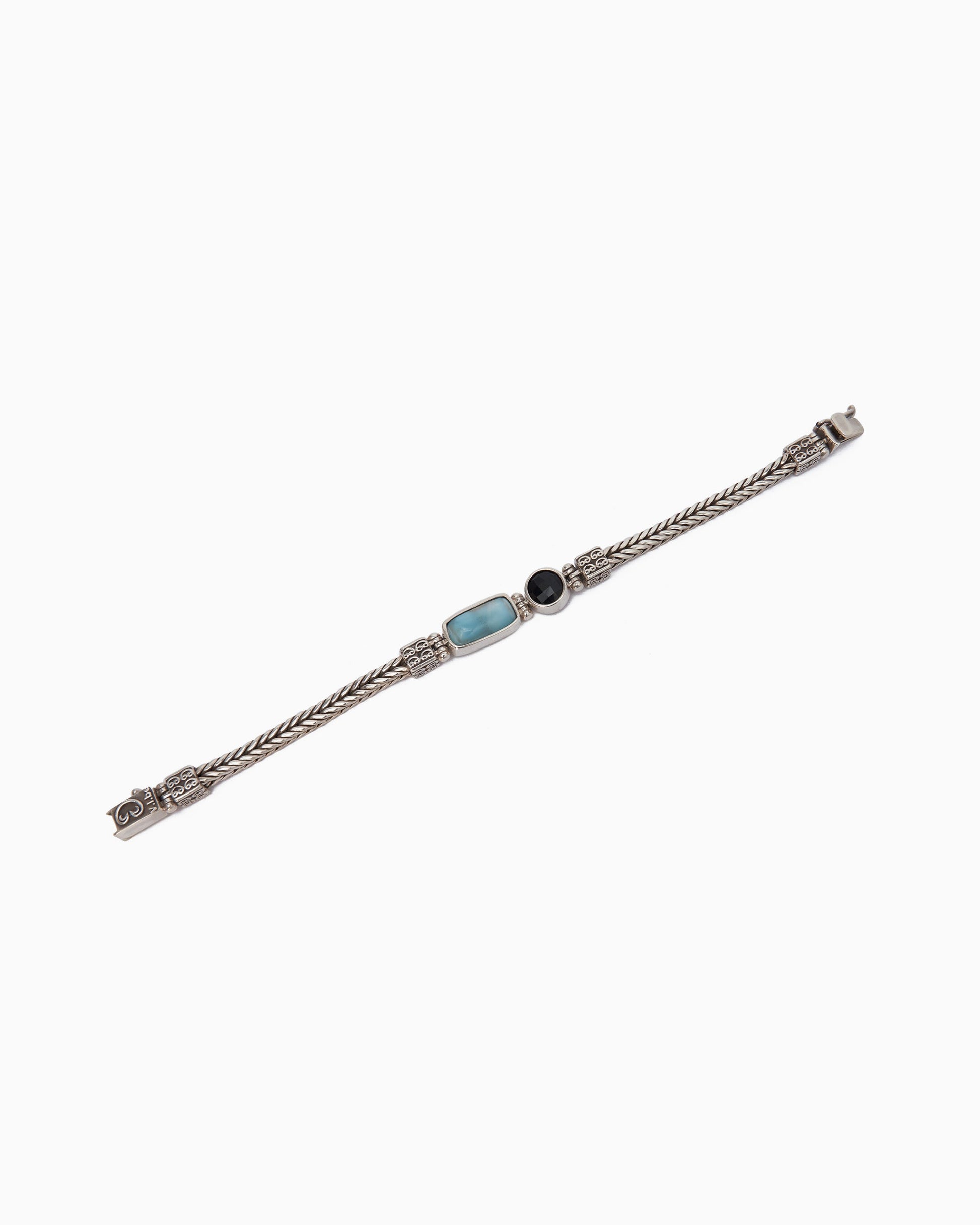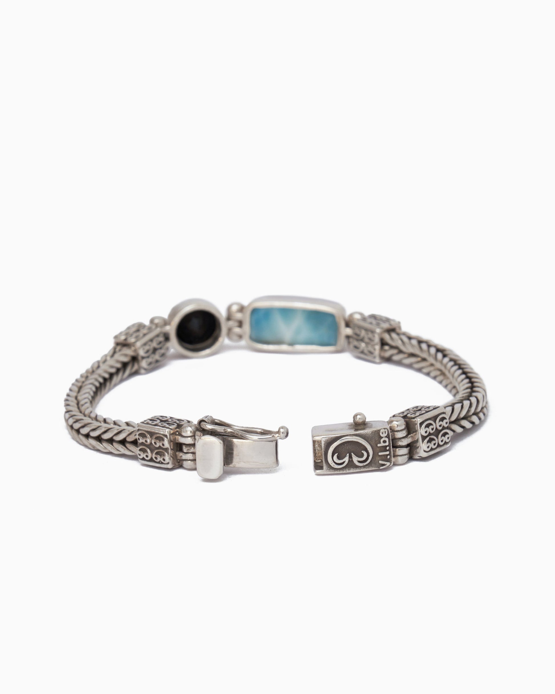 The Bubble Stone Link Bracelet is handcrafted from sterling silver and features a braided band with two luminous stones: an elongated larimar cabochon and round cushion-cut black onyx stone. Pair with any hook bracelet for extra flair.