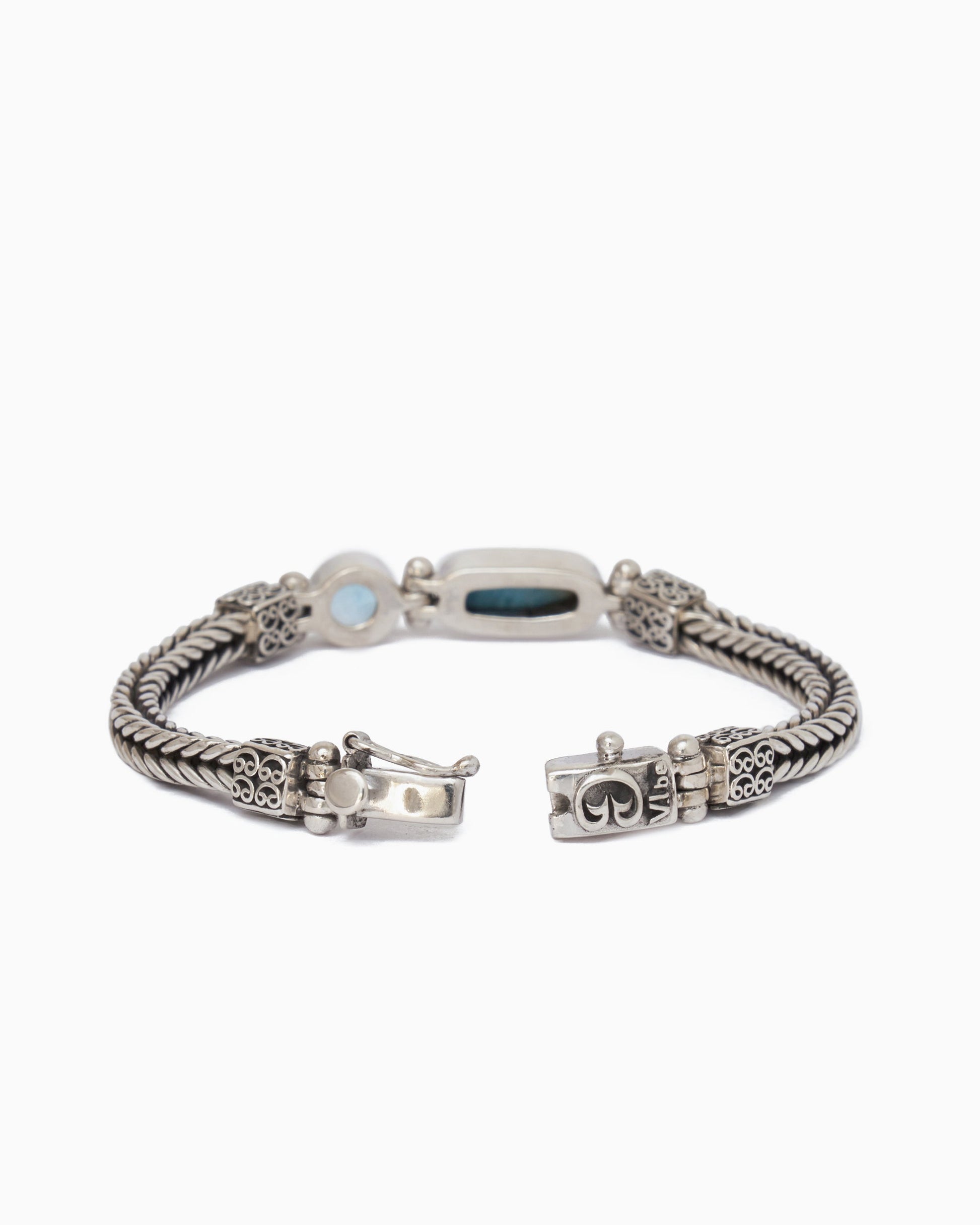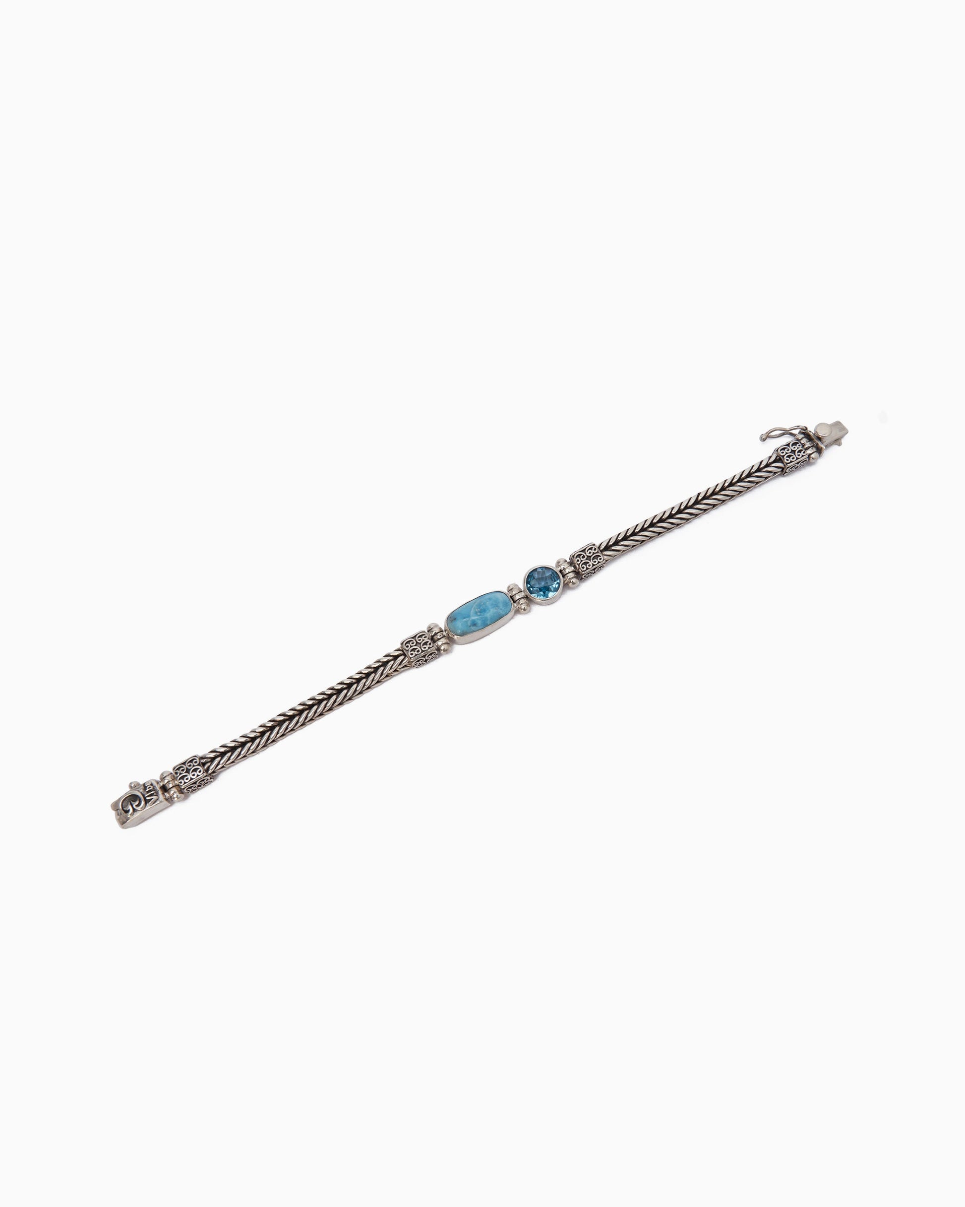 The Bubble Stone Link Bracelet is handcrafted from sterling silver and features a braided band with two luminous stones: an elongated larimar cabochon and round cushion-cut Hampton blue topaz stone. Pair with any hook bracelet for extra flair.