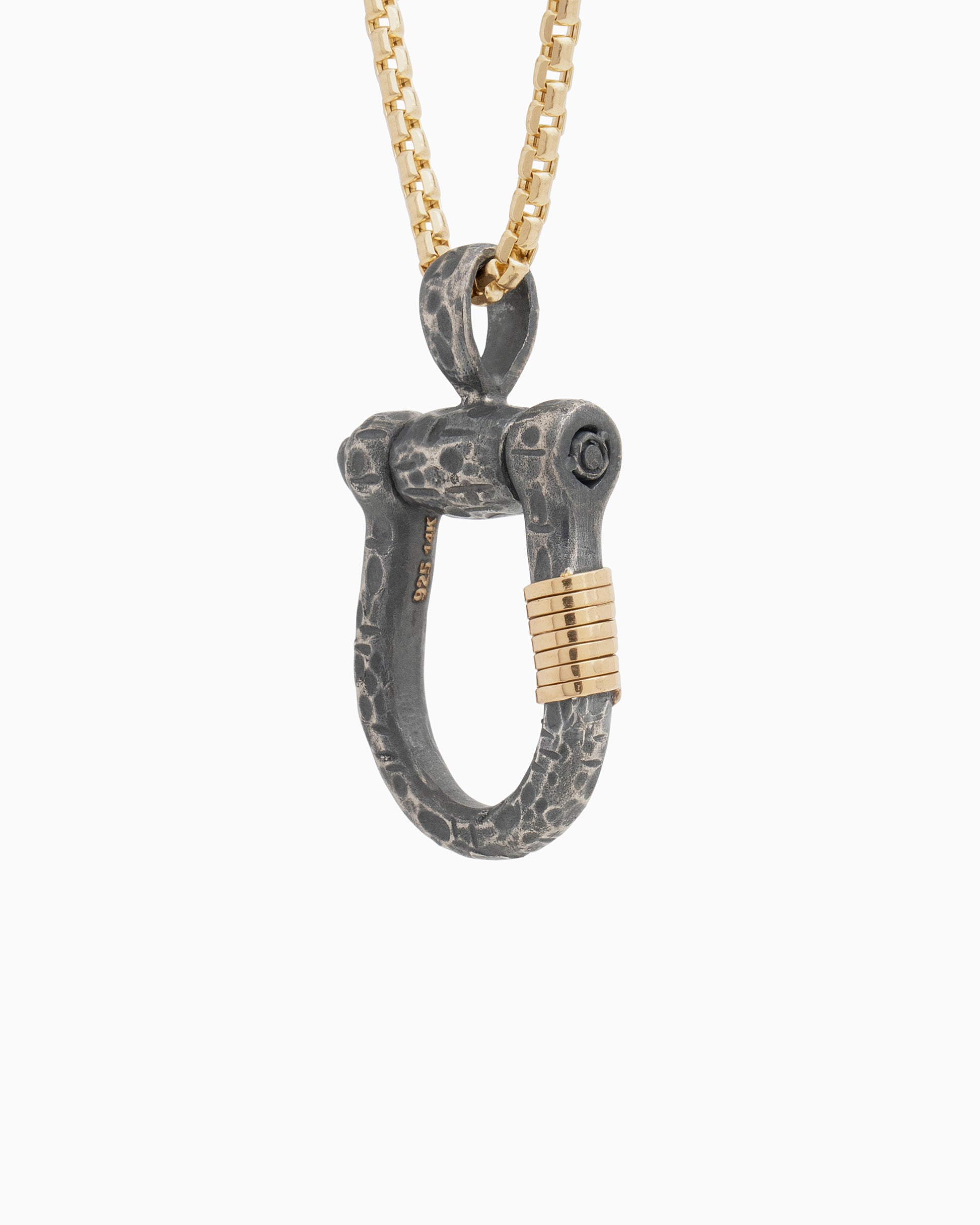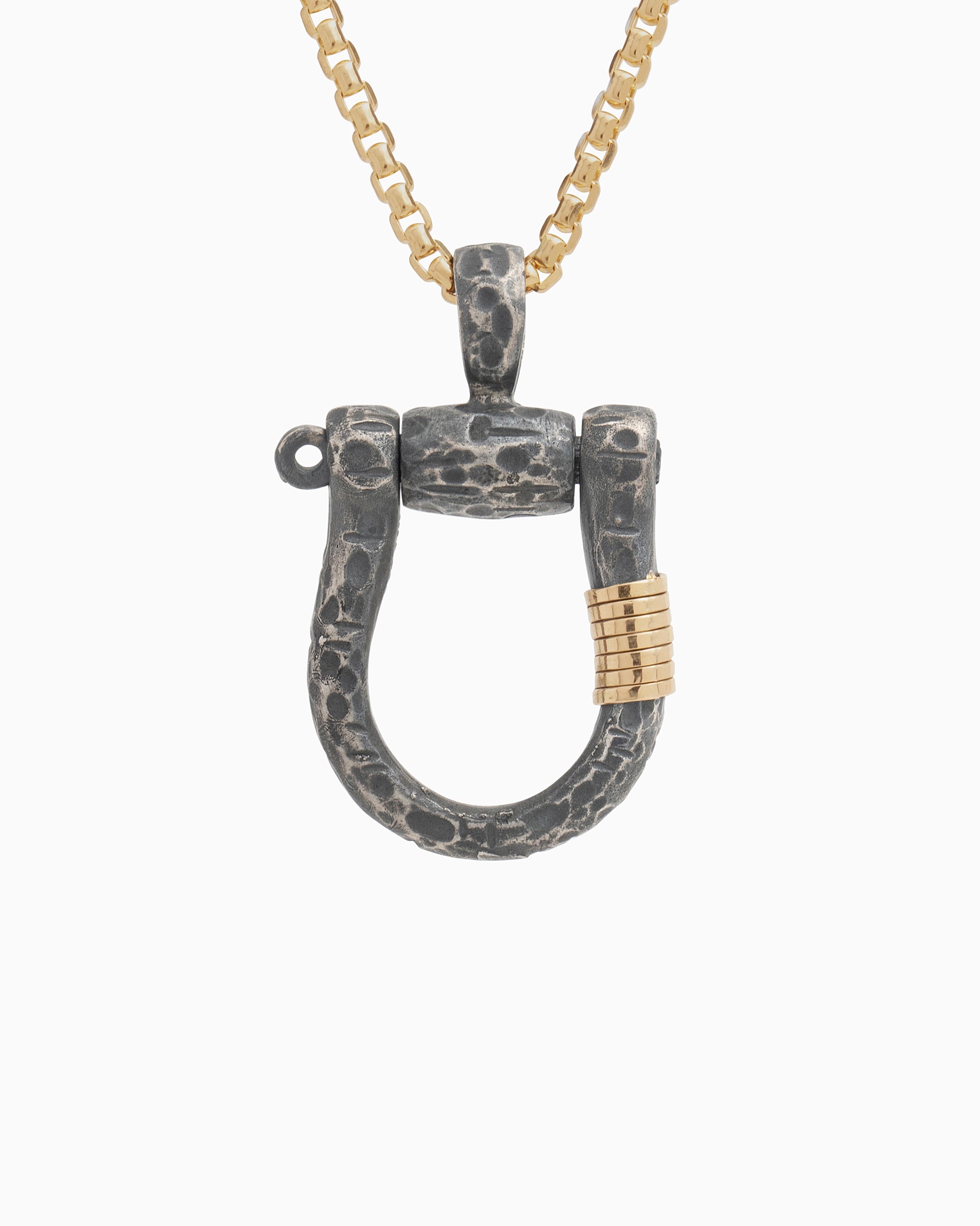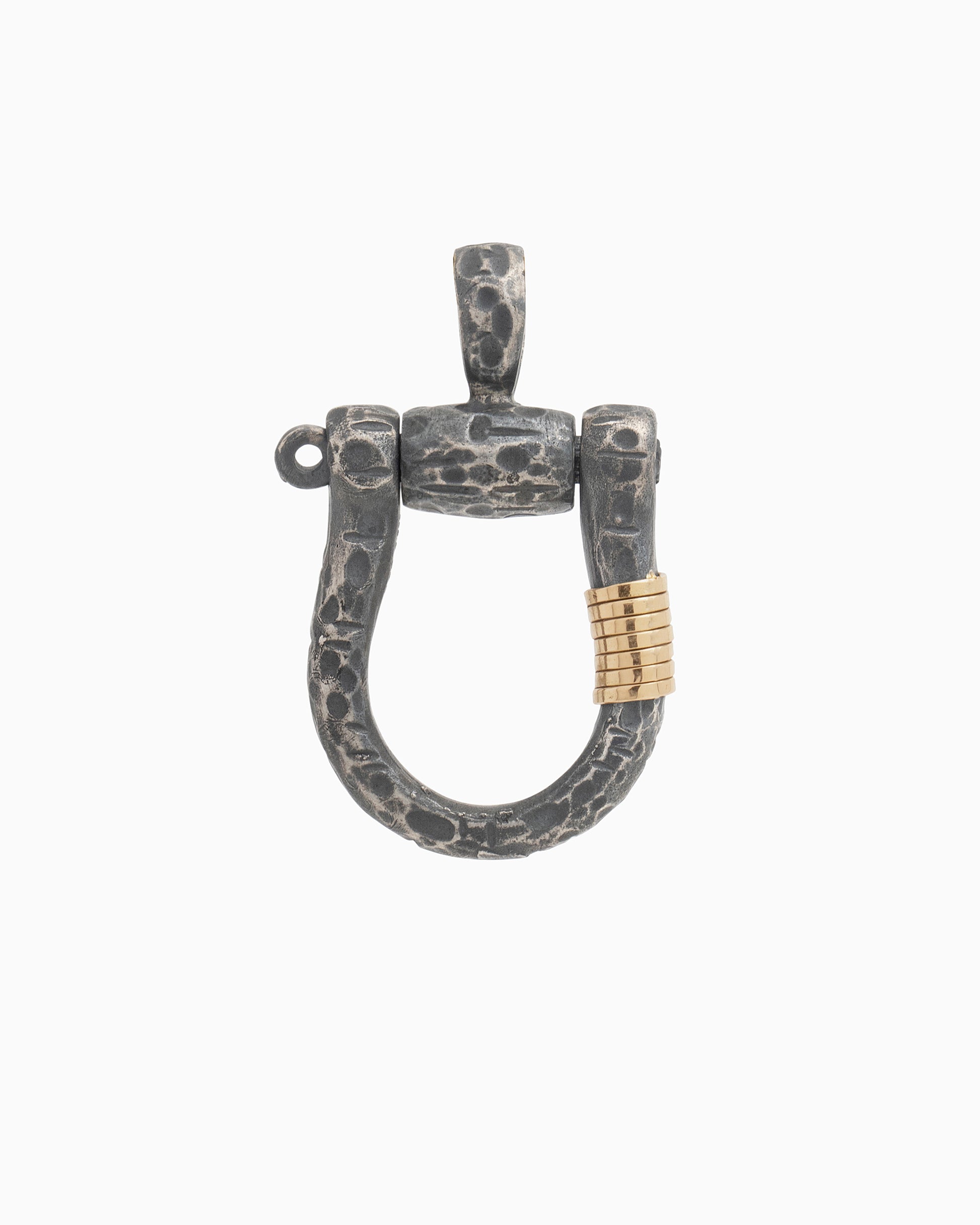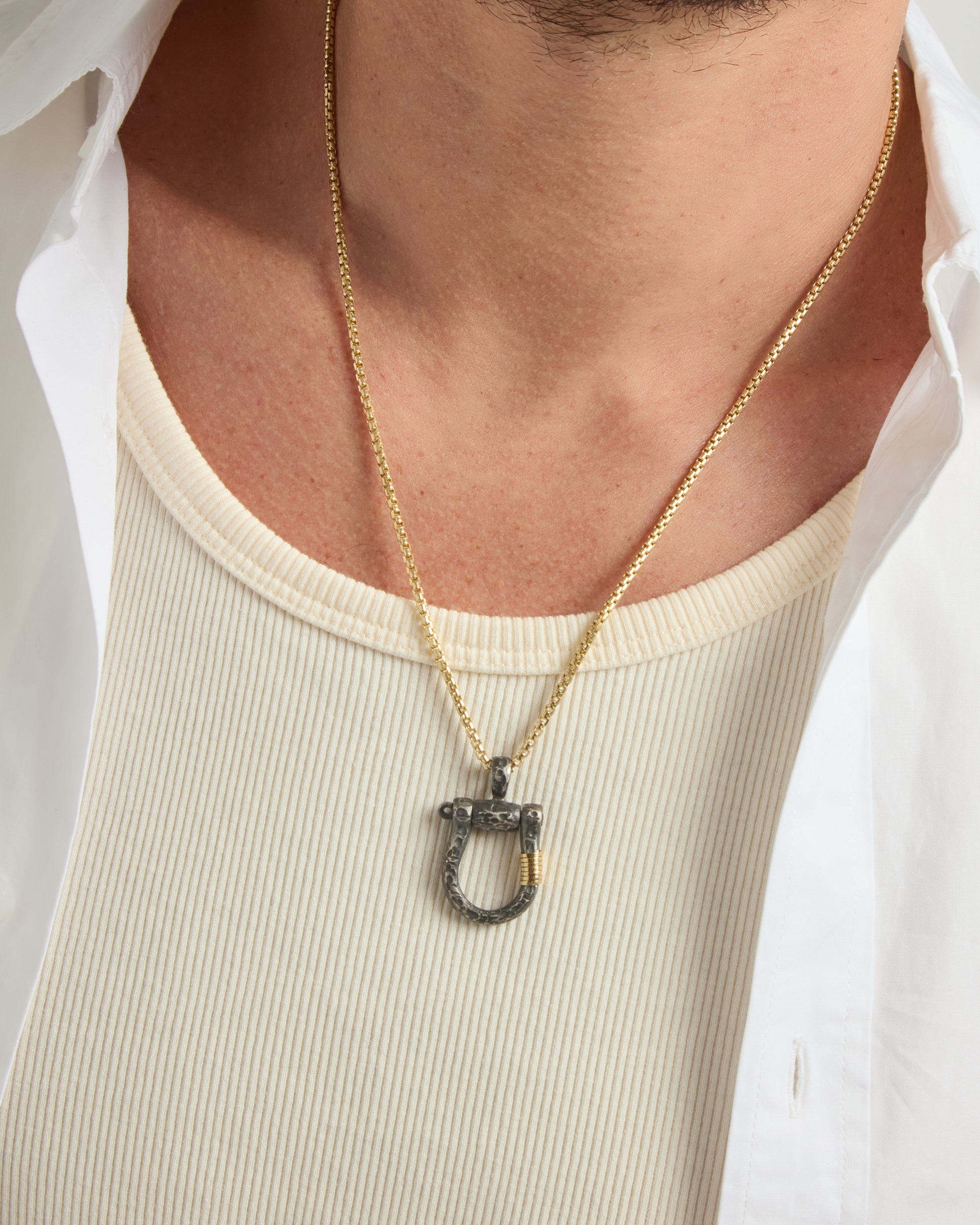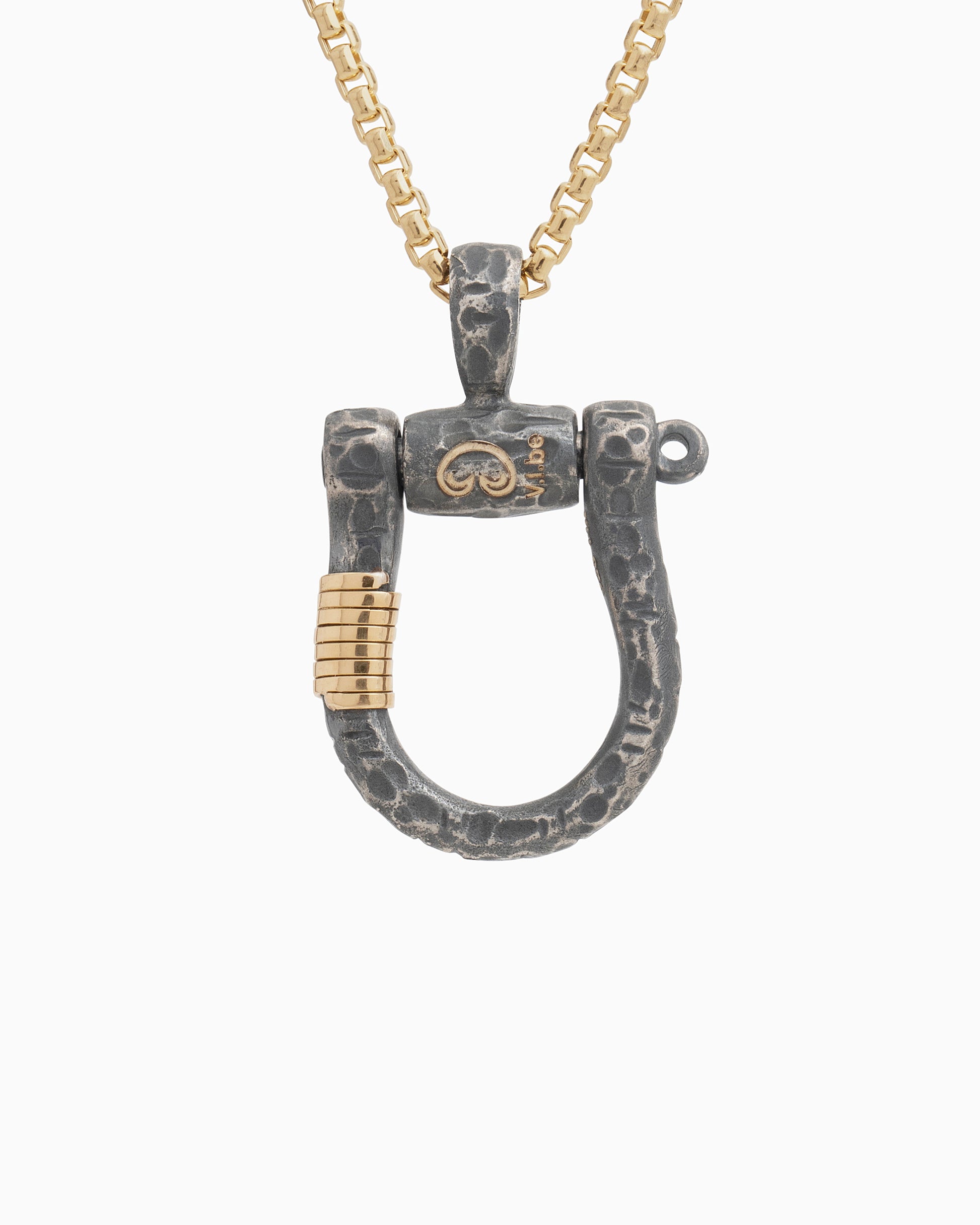 The Buckle Pendant is handcrafted in oxidized sterling silver featuring our signature pirate texture. This nautical piece is accentuated with Vibe’s seven 14K gold good luck wraps representing love, laughter, happiness, good fortune, health, unity, and peace. Pair with your favorite chain, sold separately.