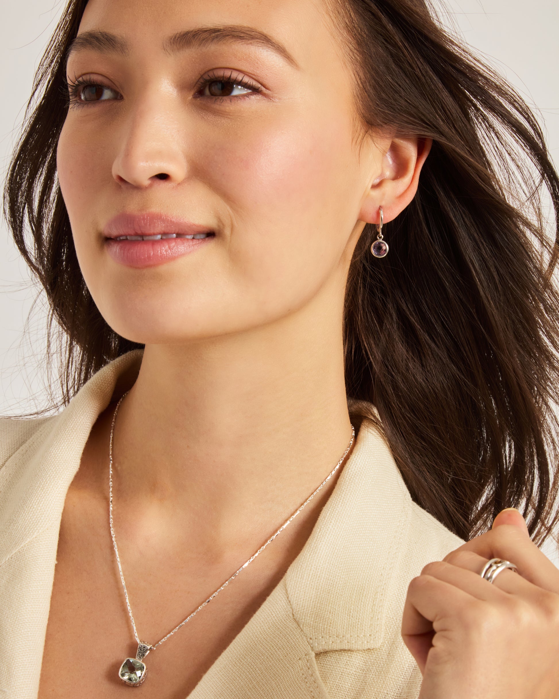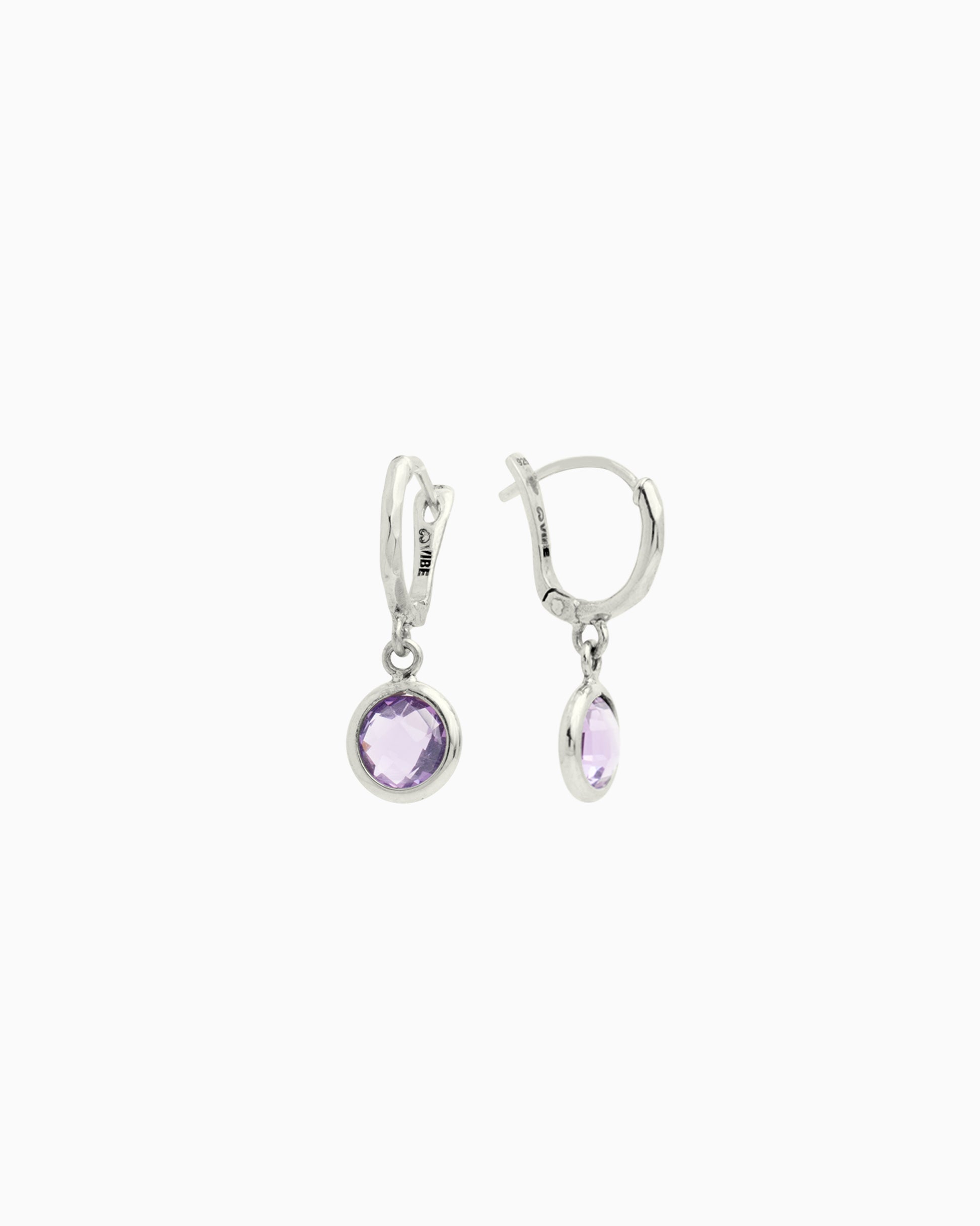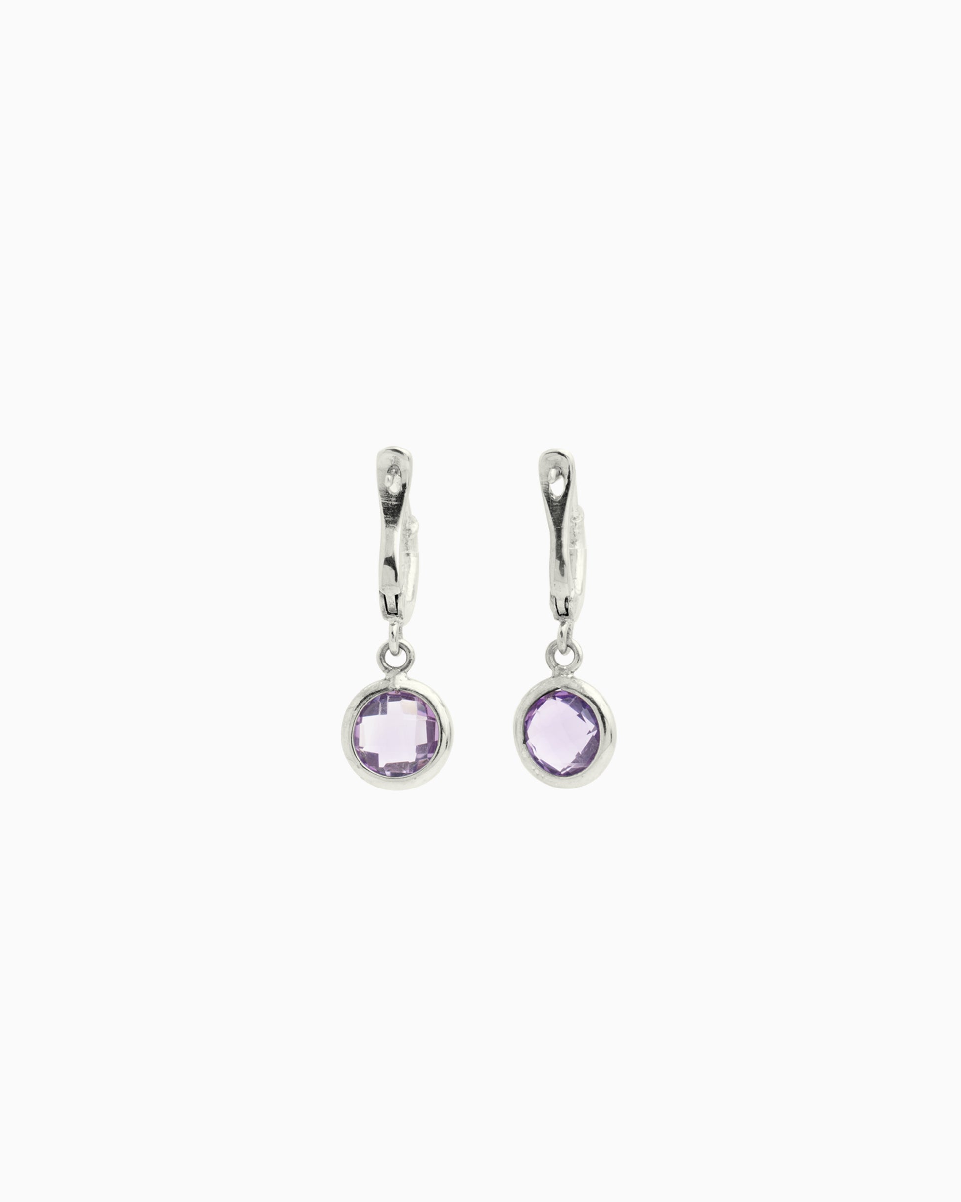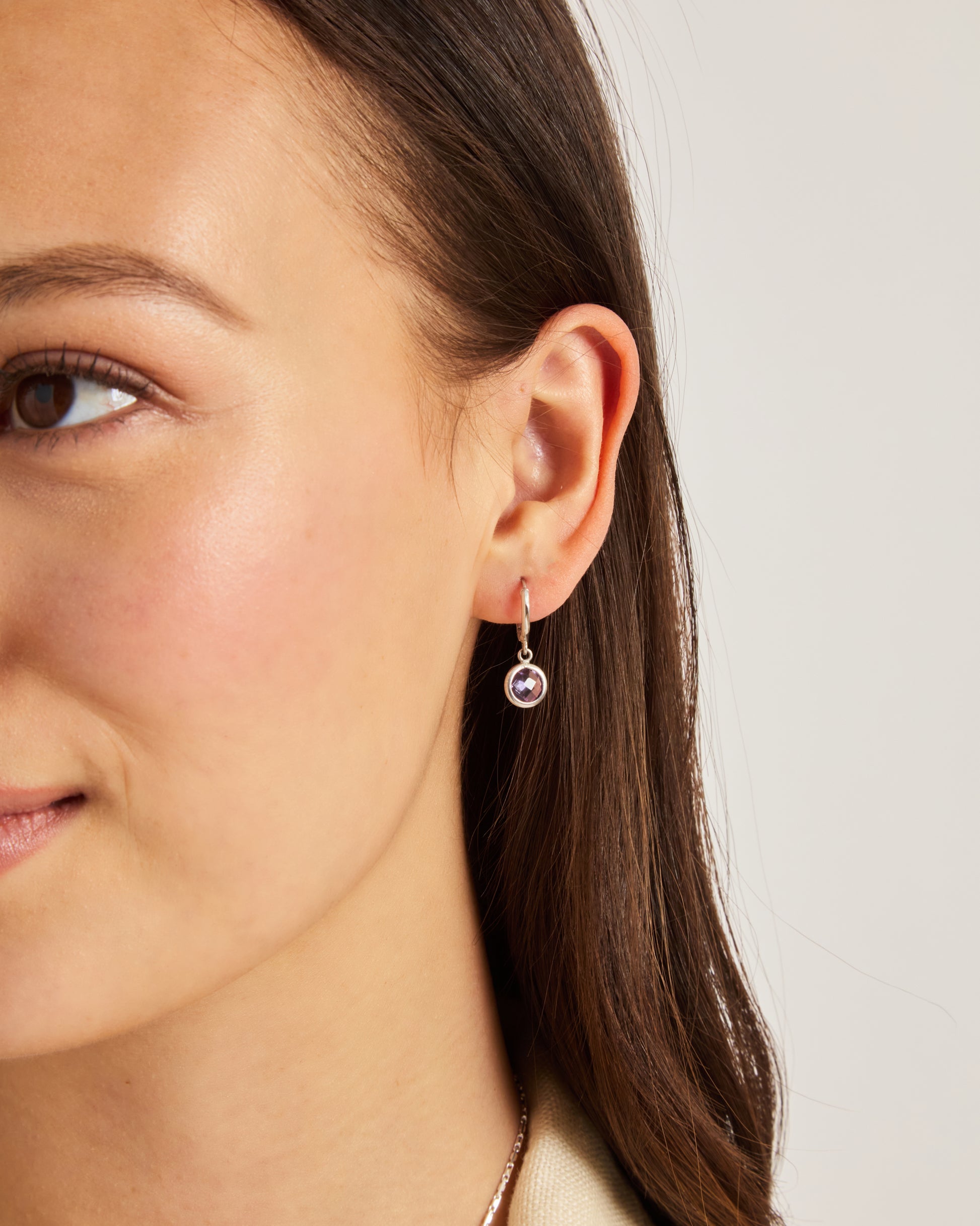 The Circle Stone Huggie showcases a circle faceted amethyst stone dangling from a huggie hoop earring. Handcrafted in sterling silver, these stunning earrings are the perfect style to add to your collection that can be worn everyday or for a more special occasion.