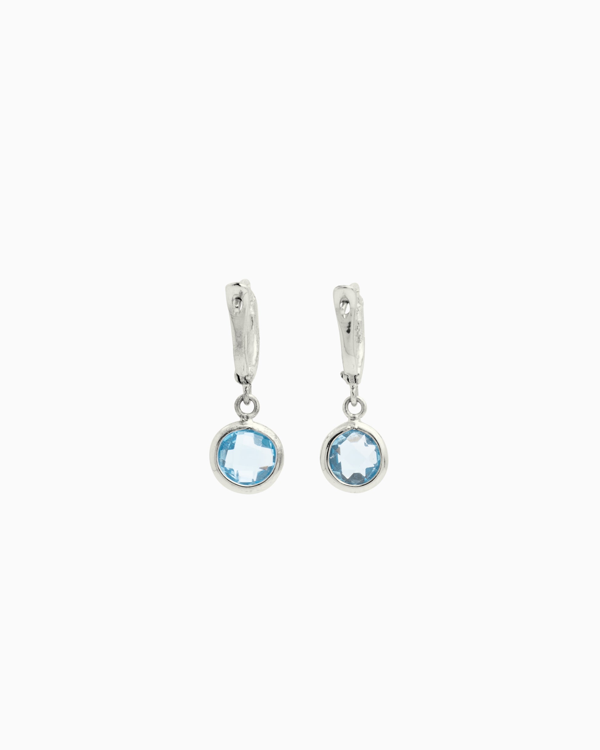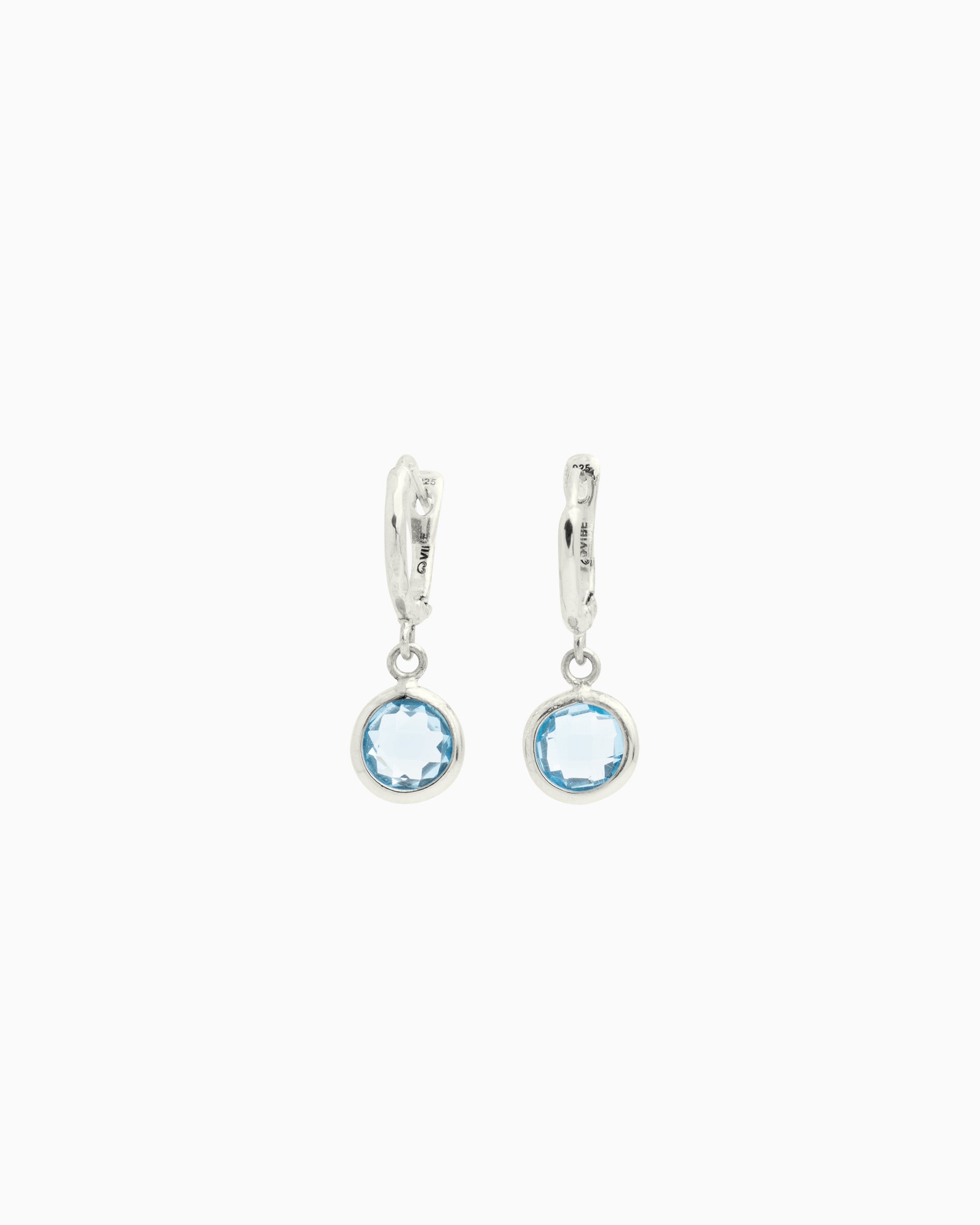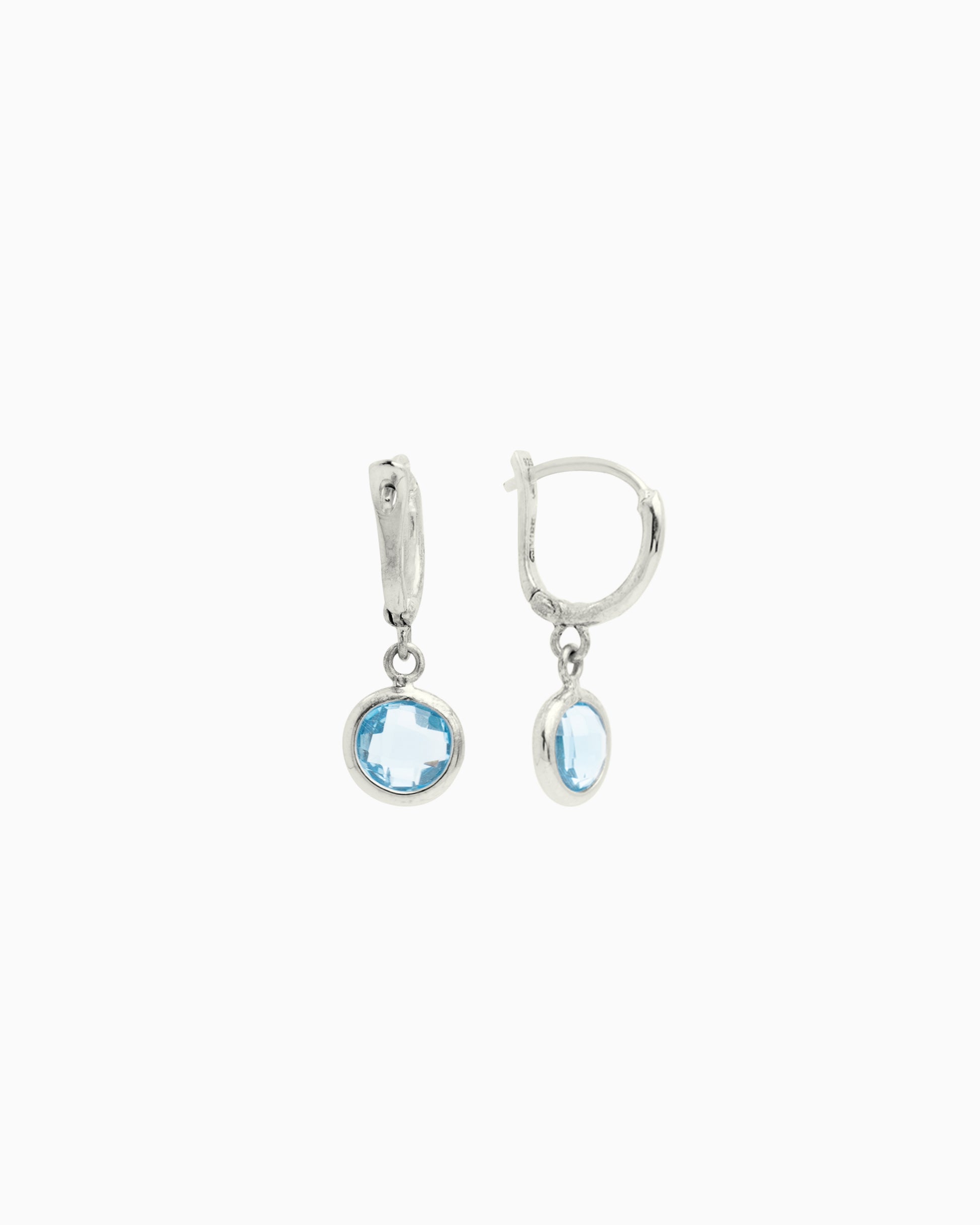 The Circle Stone Huggie showcases a circle faceted Hampton blue topaz stone dangling from a huggie hoop earring. Handcrafted in sterling silver, these stunning earrings are the perfect style to add to your collection that can be worn everyday or for a more special occasion.