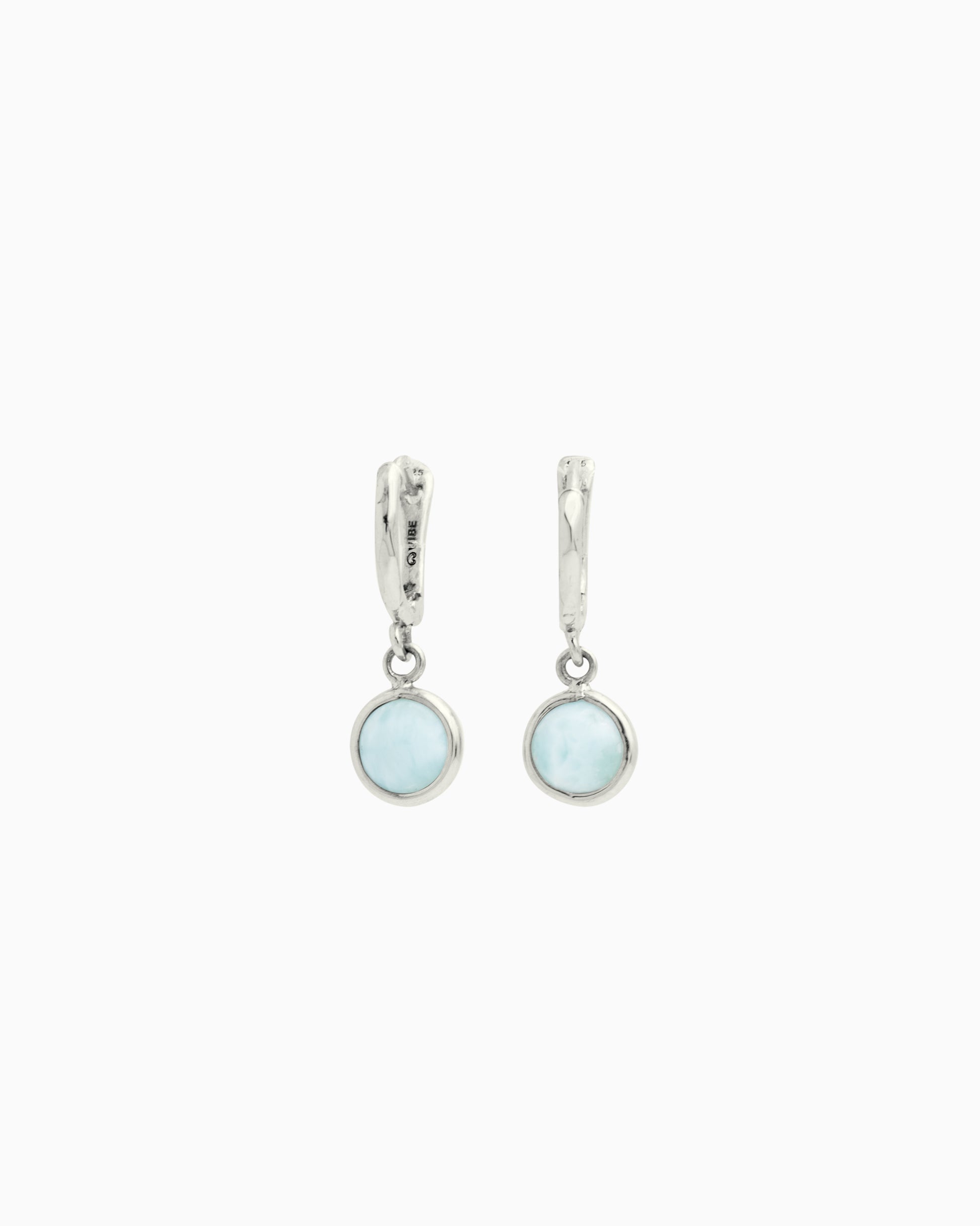The Circle Stone Huggie showcases a circle cabochon larimar stone dangling from a huggie hoop earring. Handcrafted in sterling silver, these stunning earrings are the perfect style to add to your collection that can be worn everyday or for a more special occasion.