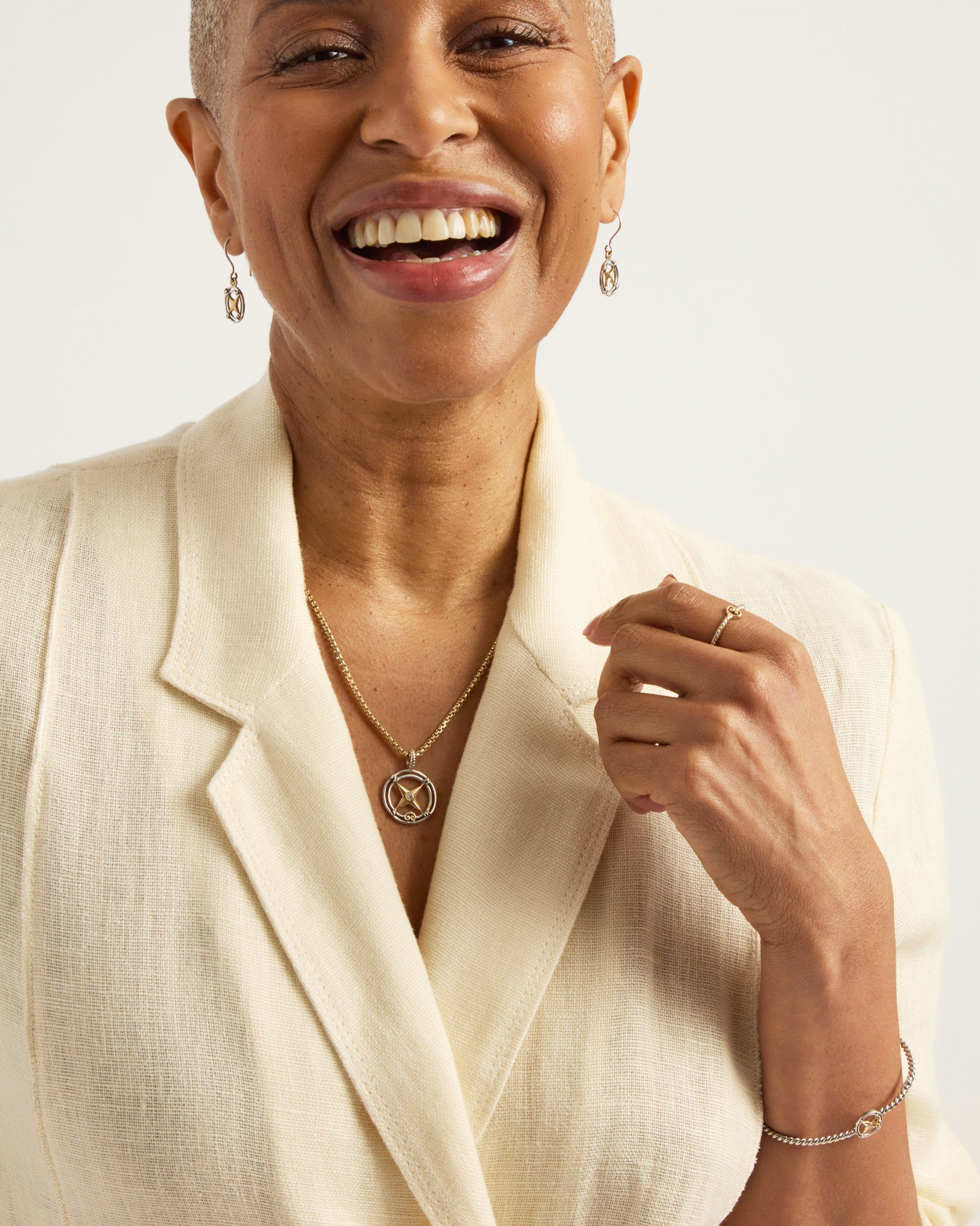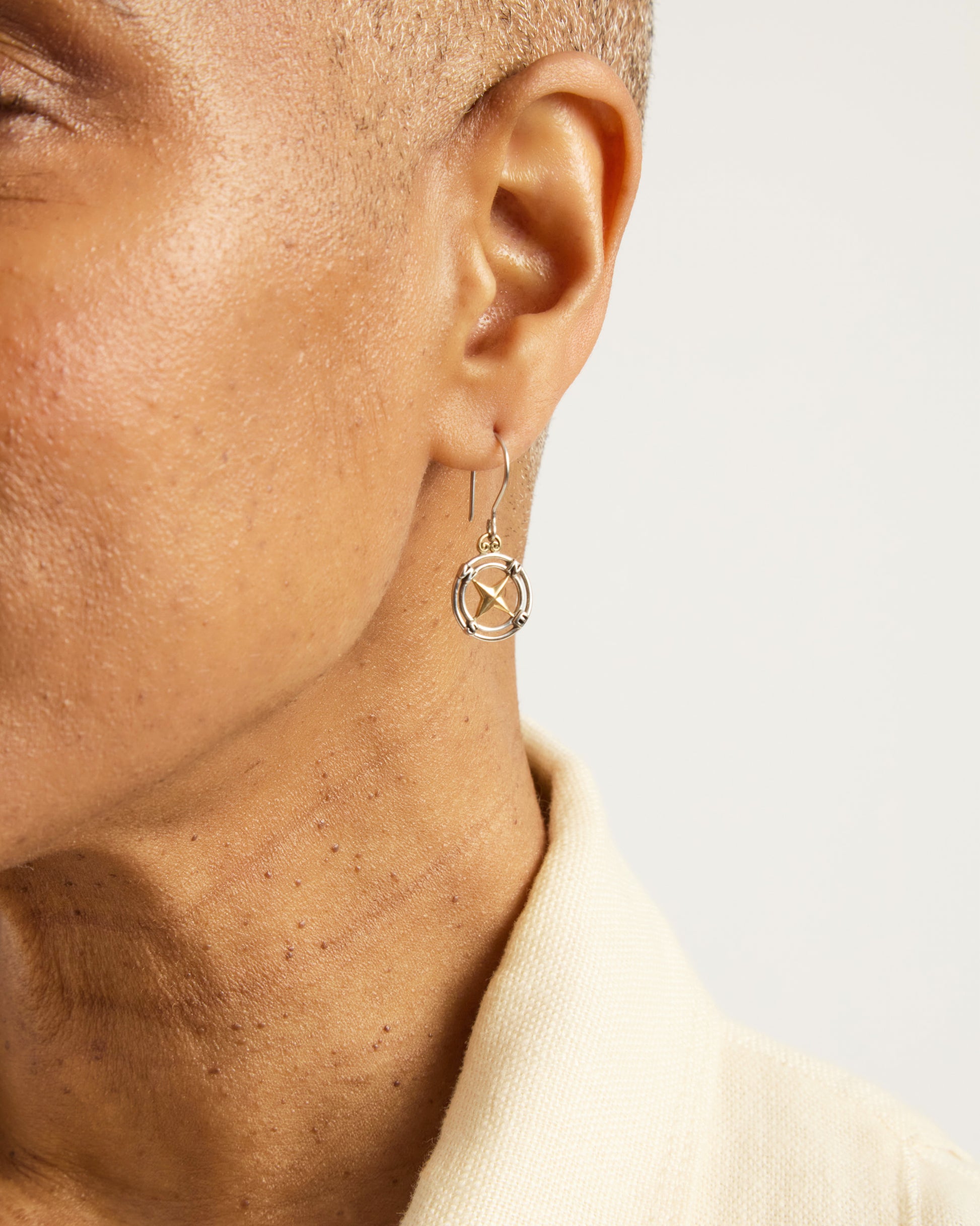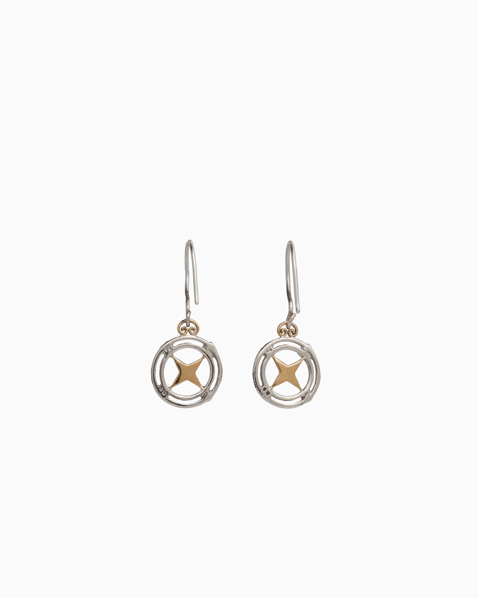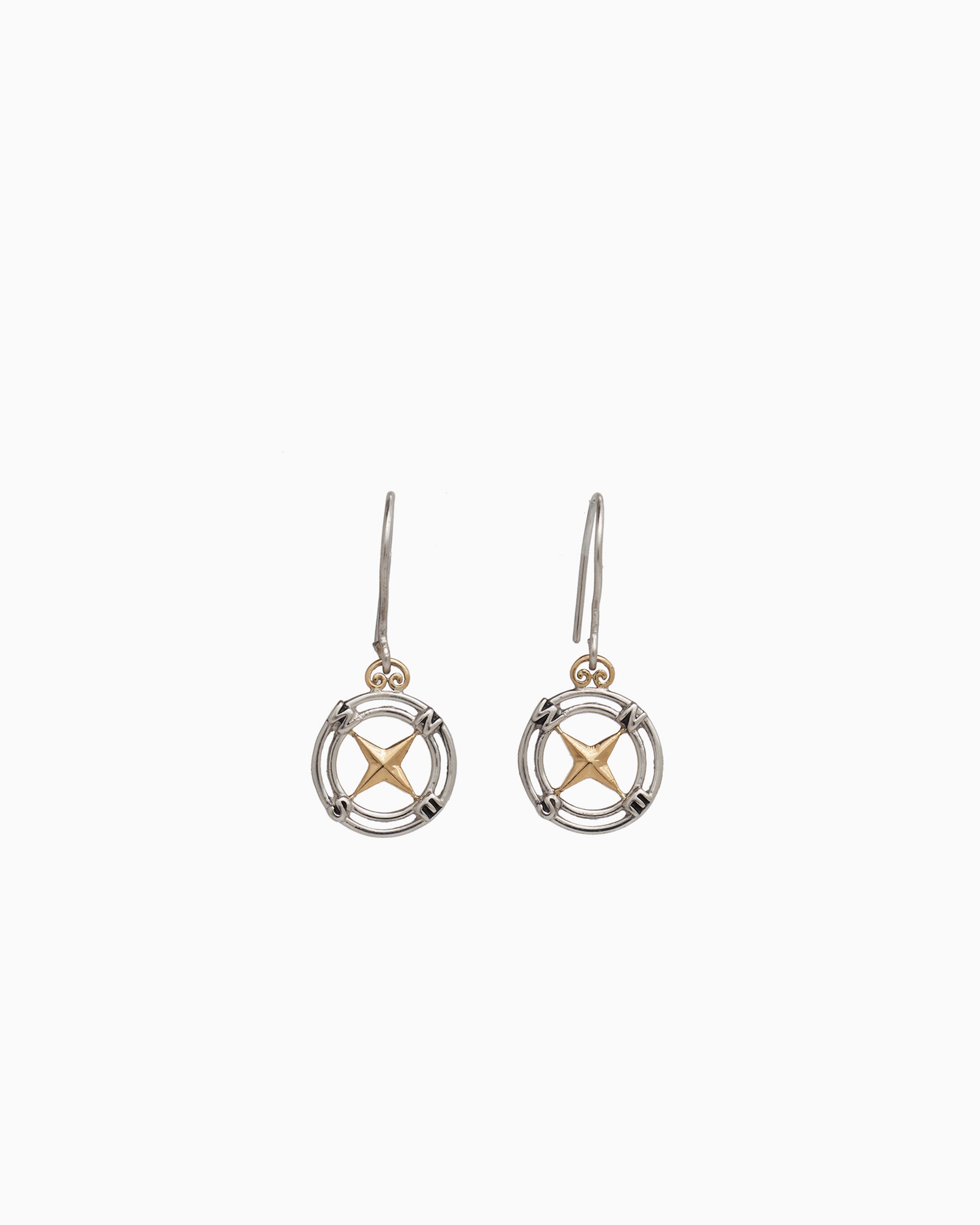 Stand out with the distinctive design of the Compass Drop Earrings, guaranteed to leave a lasting impression. Handcrafted from sterling silver, these earrings boast a 14K solid gold center and petroglyph motif. Wearing these earrings is a captivating symbol of adventure, serving as a constant reminder of your unique journey.