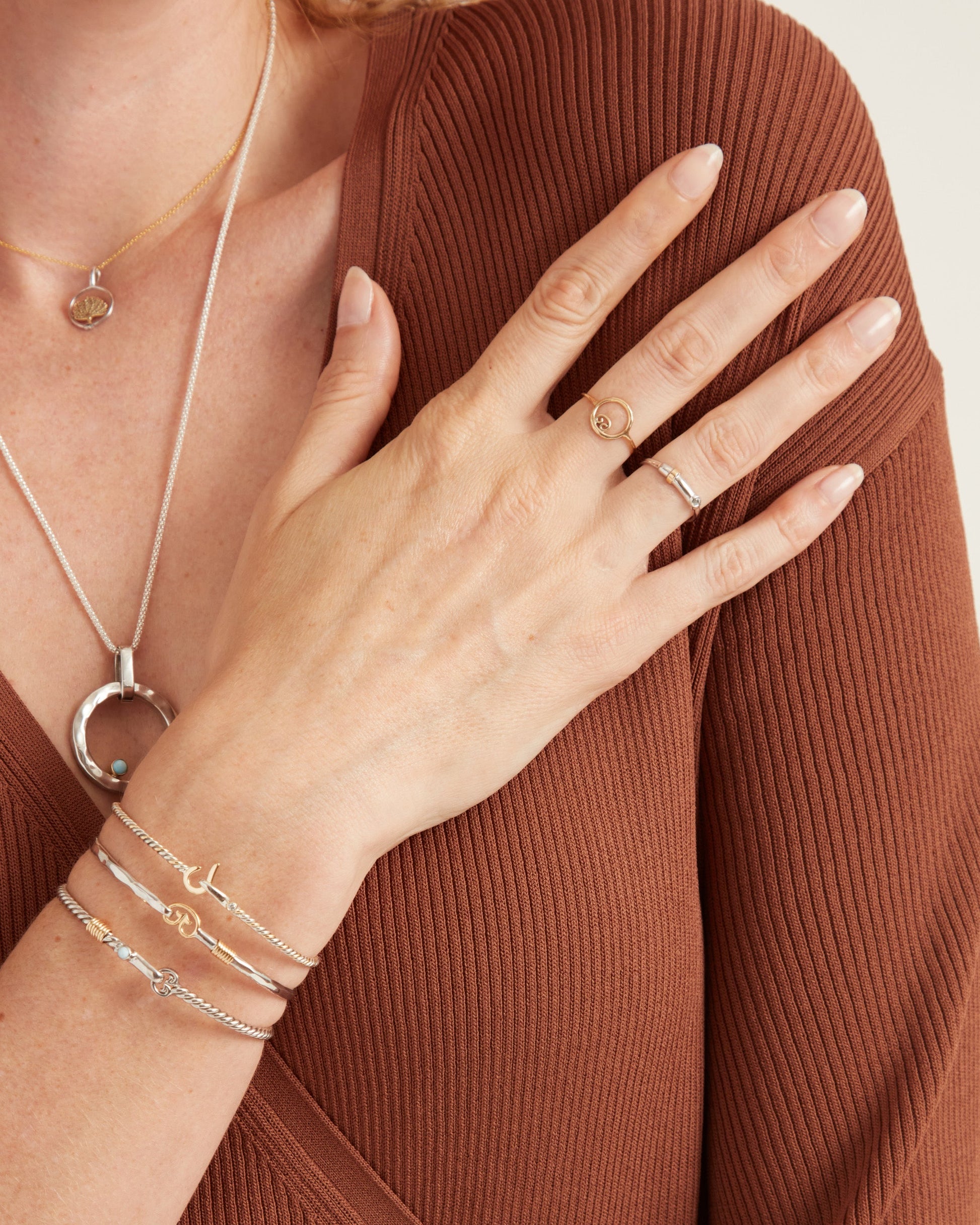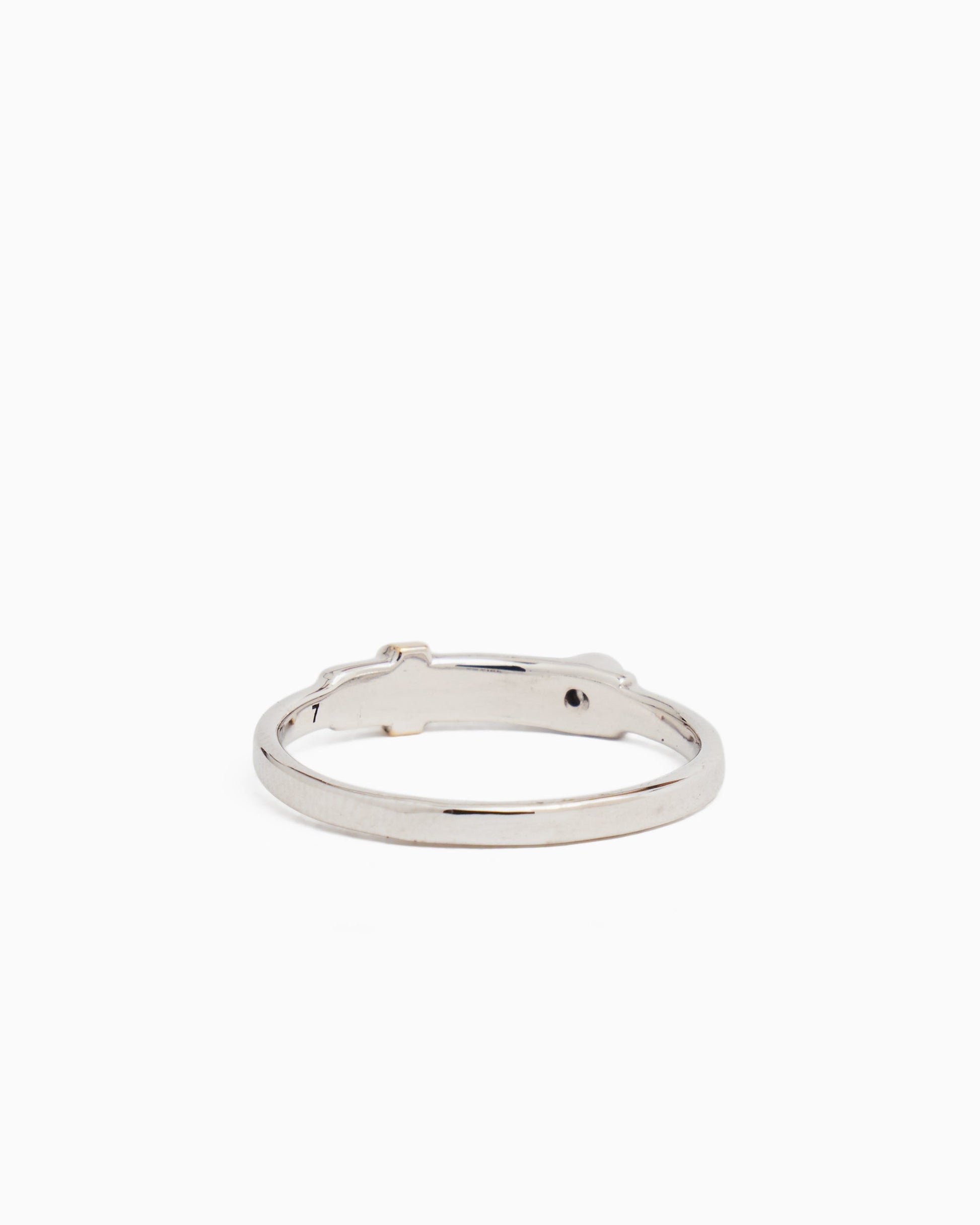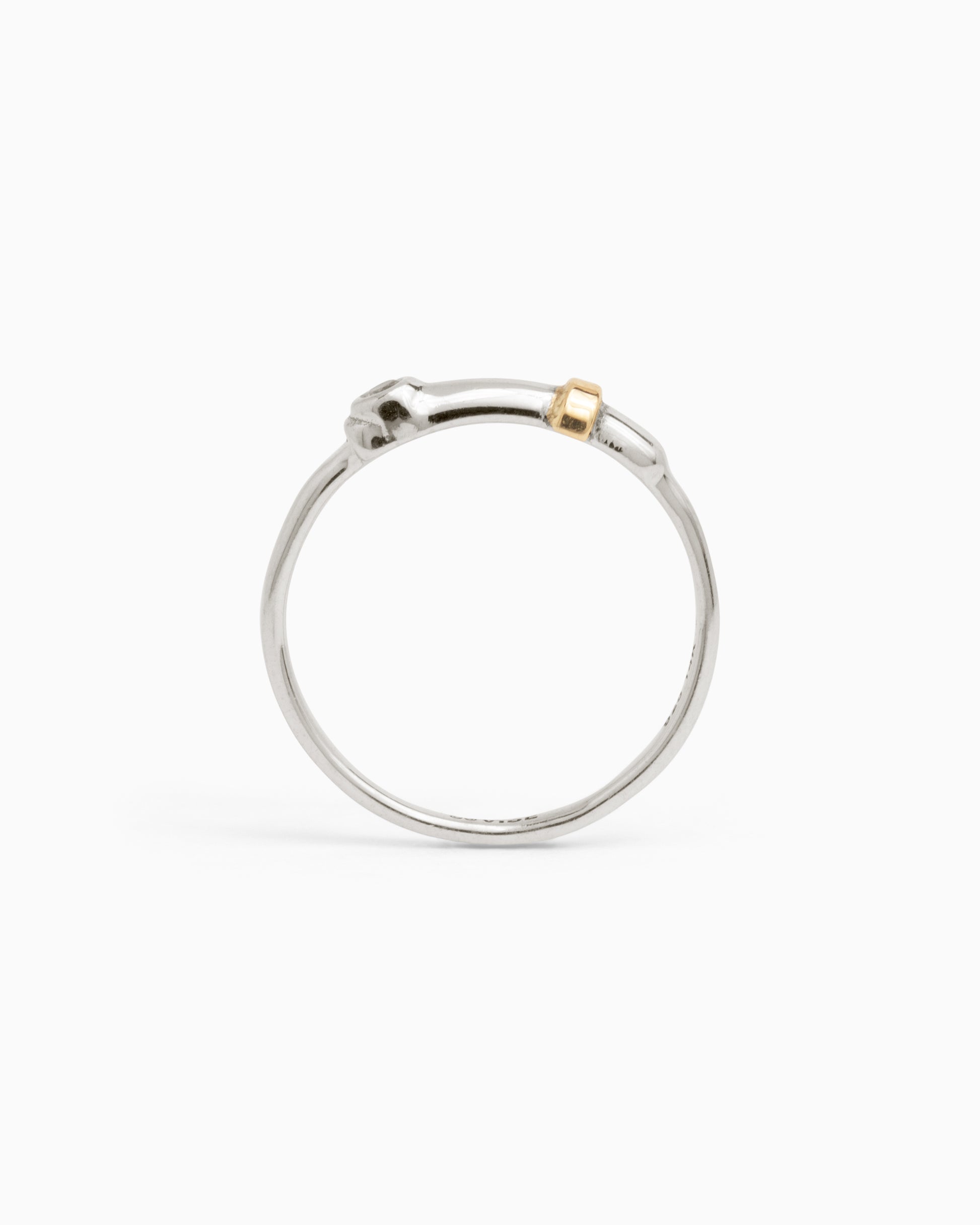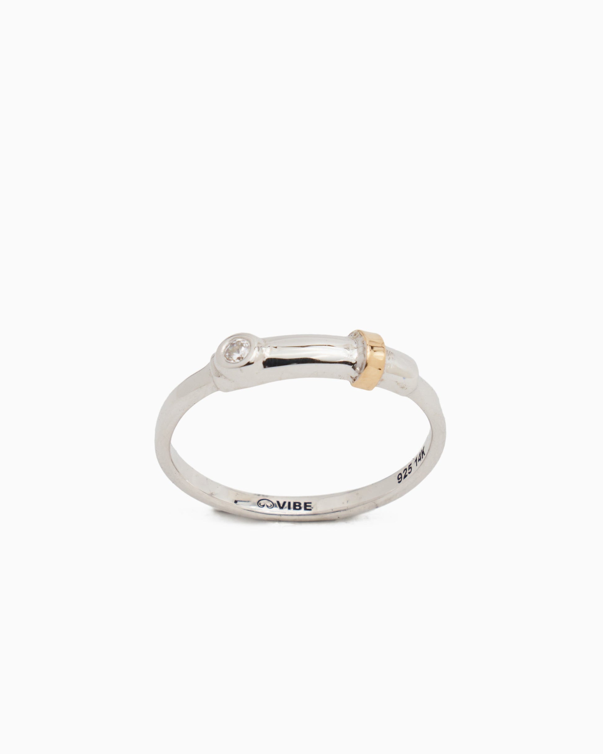 The Crossover Ring is a simple band with elegant touches. Handcrafted in sterling silver, this ring features a faceted white zircon stone and a 14K gold wrap. This piece is versatile enough to be worn alone or stacked with others.