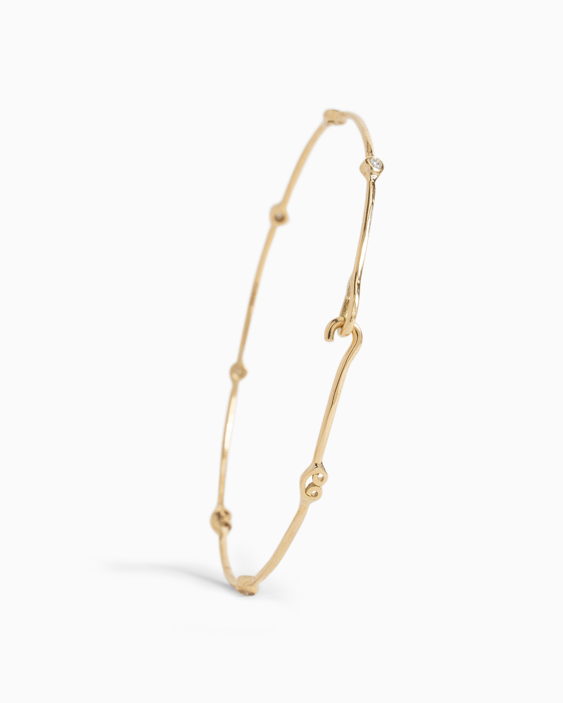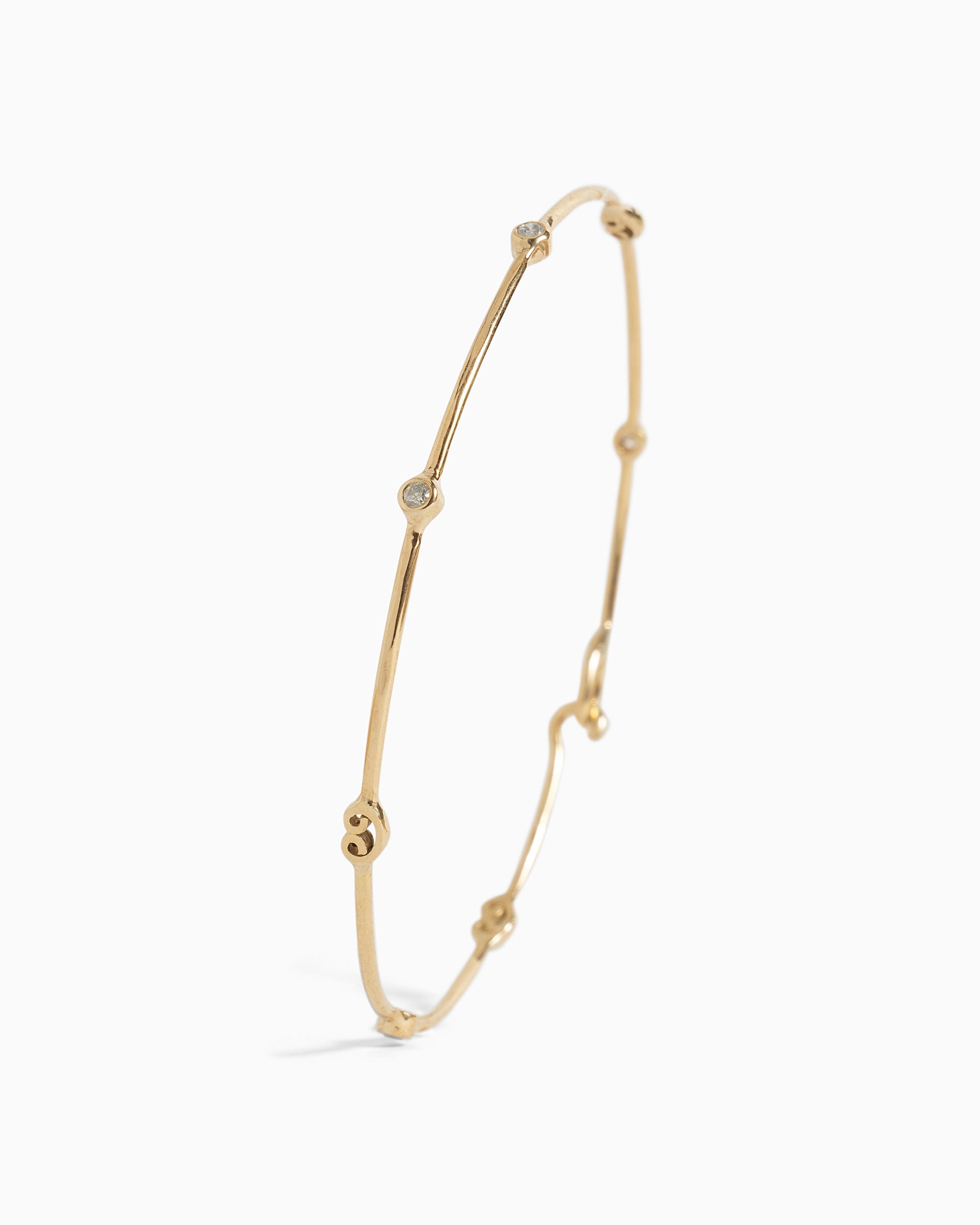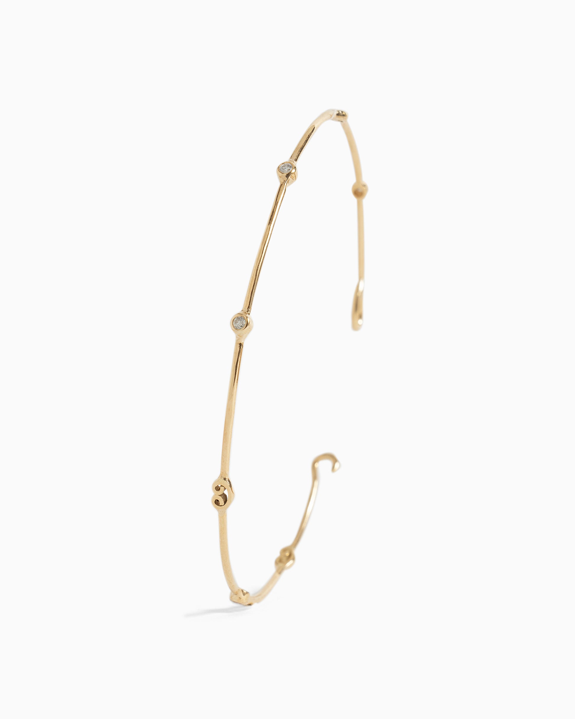 The Dainty Diamond & Petroglyph Hook Bracelet, handcrafted in gently hammered 14K solid gold, showcases tiny replicas of the iconic St. John petroglyph and faceted diamonds along the band. Secured with a dainty hook clasp, this bracelet seamlessly blends versatility and style, making it the perfect choice to wear solo or stacked with other favorites.