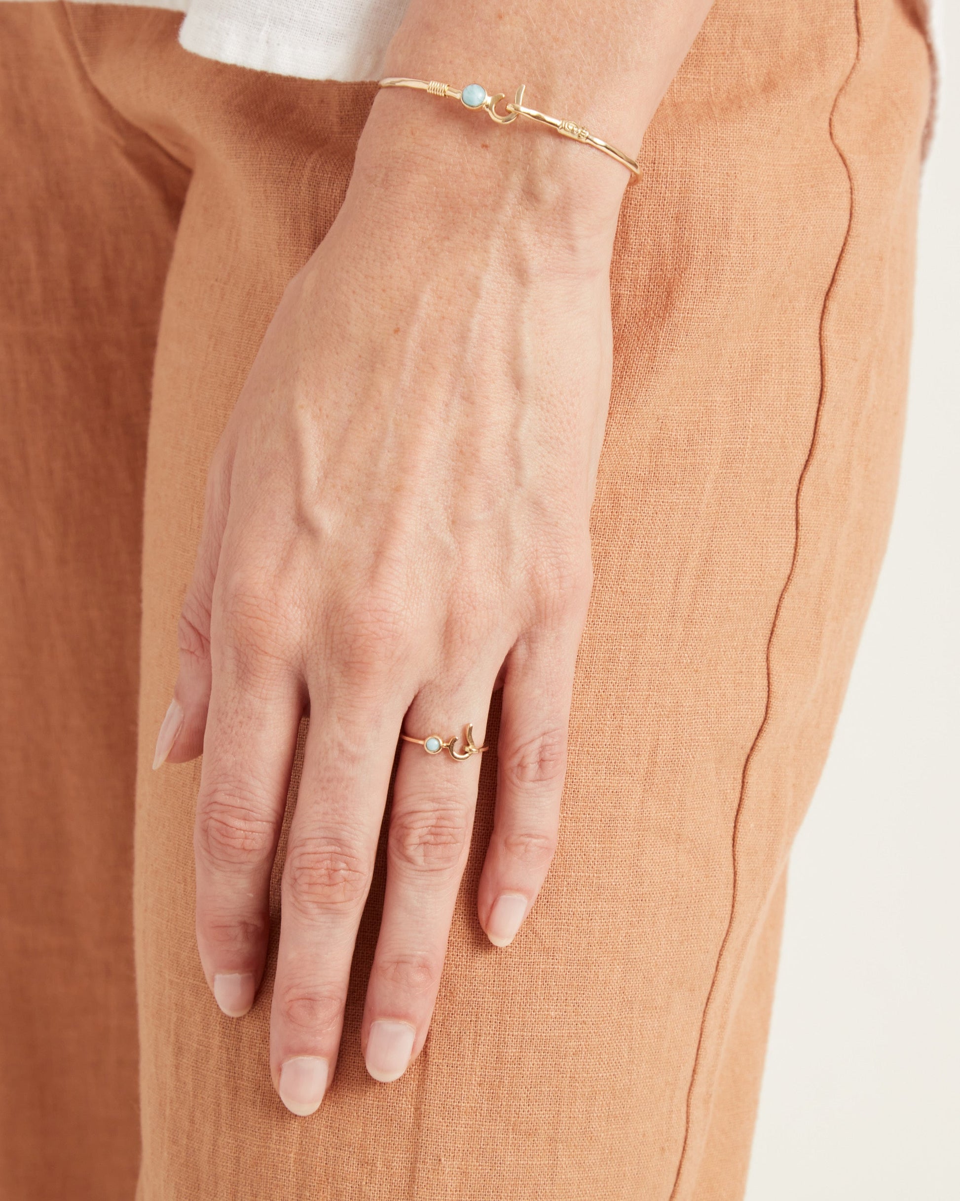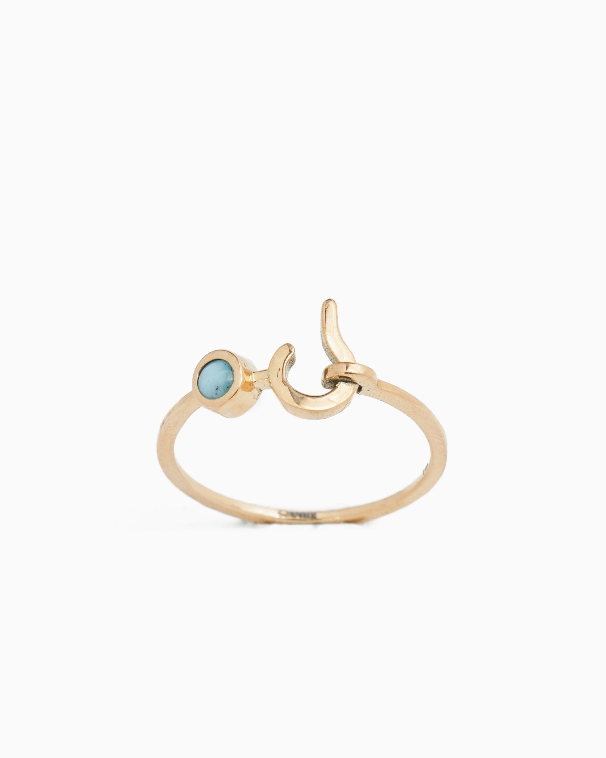 A Vibe signature, the Dainty St. John Hook Ring with Stone is fashioned in gently hammered 14K gold with a larimar cabochon and a 14K gold "J" hook. Featuring a replica of the St. John petroglyph, it is sure to be a favorite piece. In the Caribbean tradition, wear your hook facing in to keep love close to your heart, and facing out if you are open to a new love in your life.