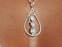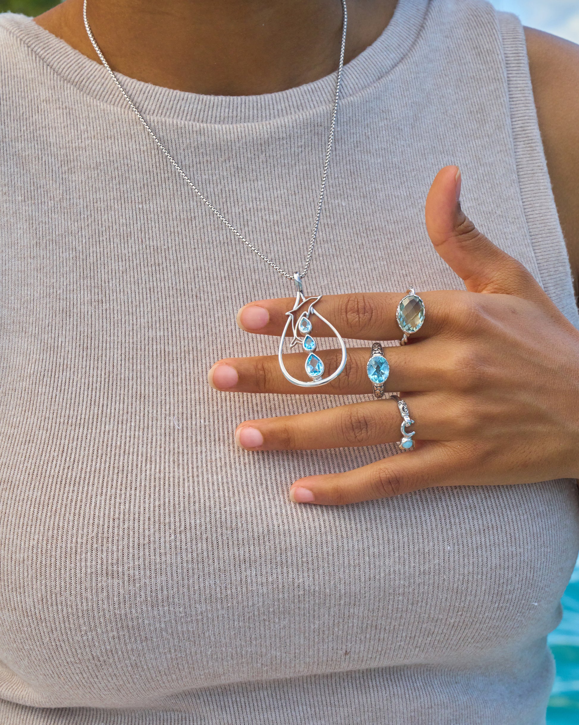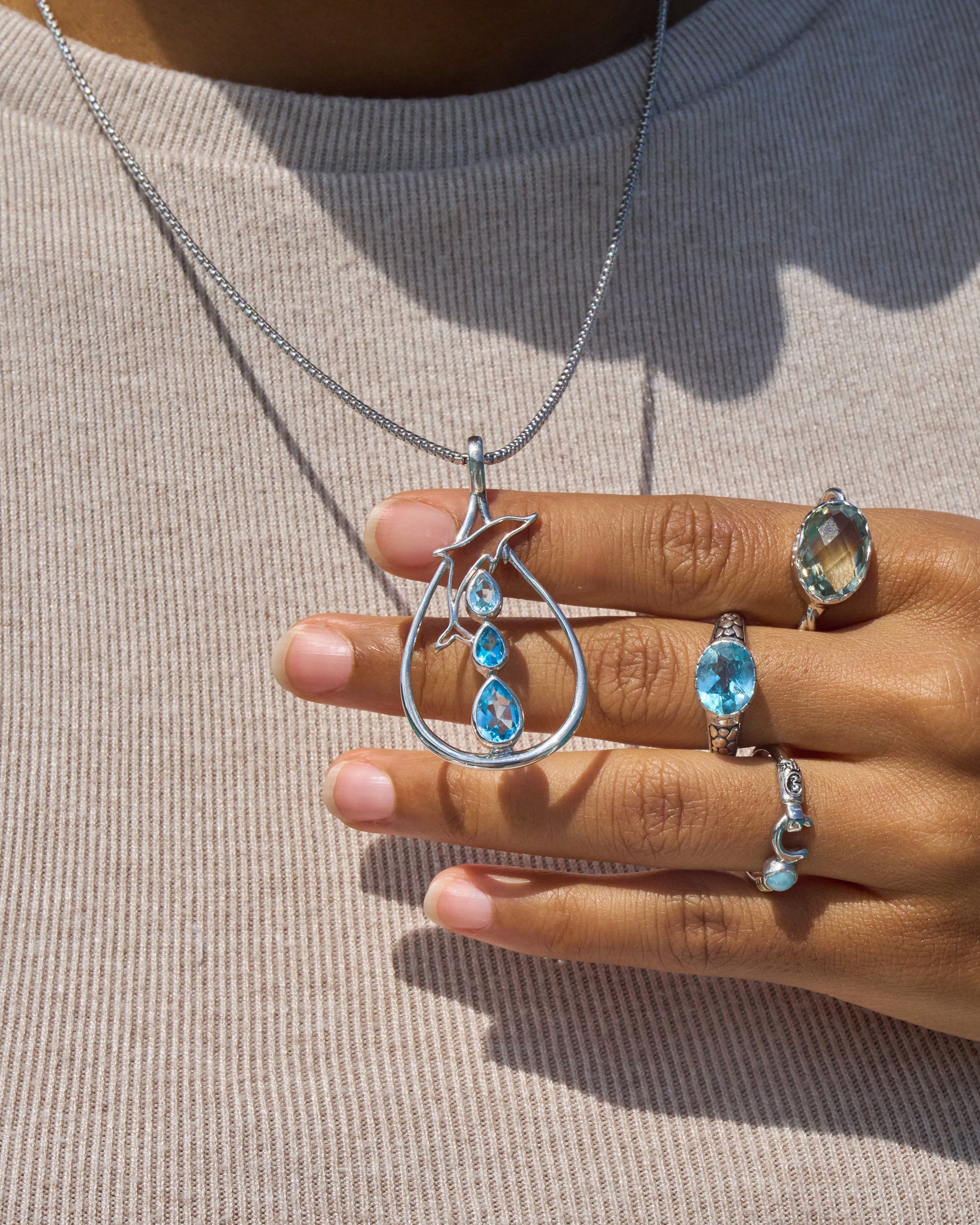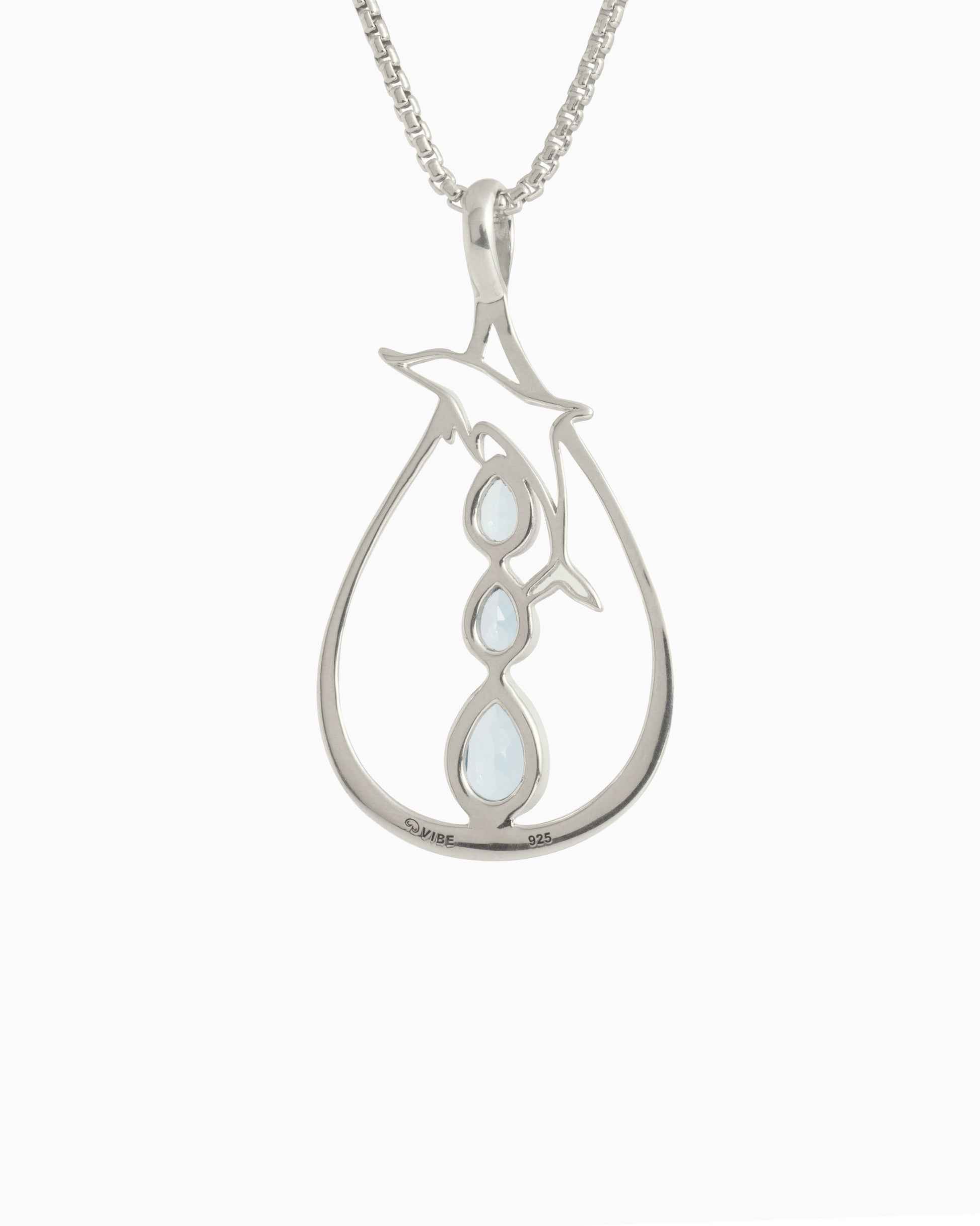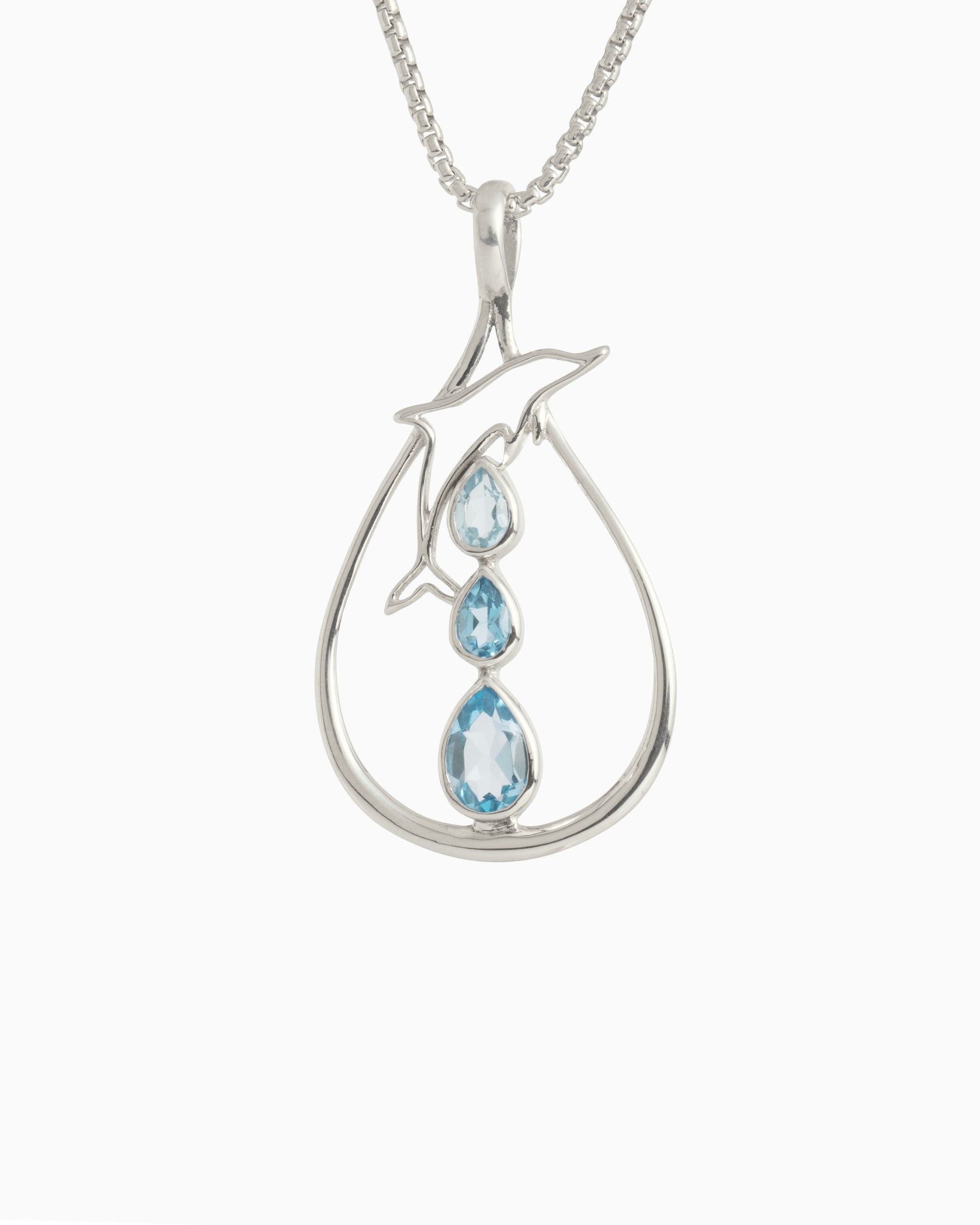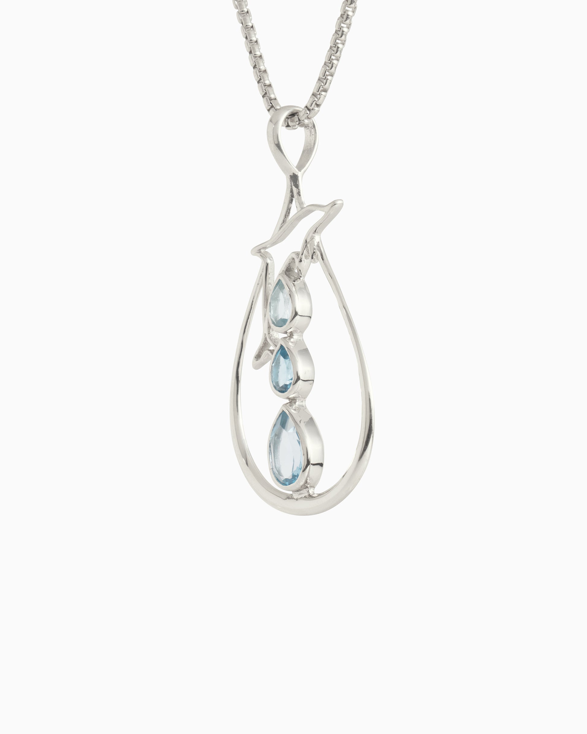The Dancing Dolphin Pendant is handcrafted in sterling silver, featuring a teardrop-shaped outline with a graceful dolphin silhouette leaping at the center. Below, three faceted teardrop stones—Hampton blue topaz and sky blue topaz—cascade downwards like drops of water. A tribute to the beauty and energy of marine life, this pendant bring a touch of the sea wherever you go.