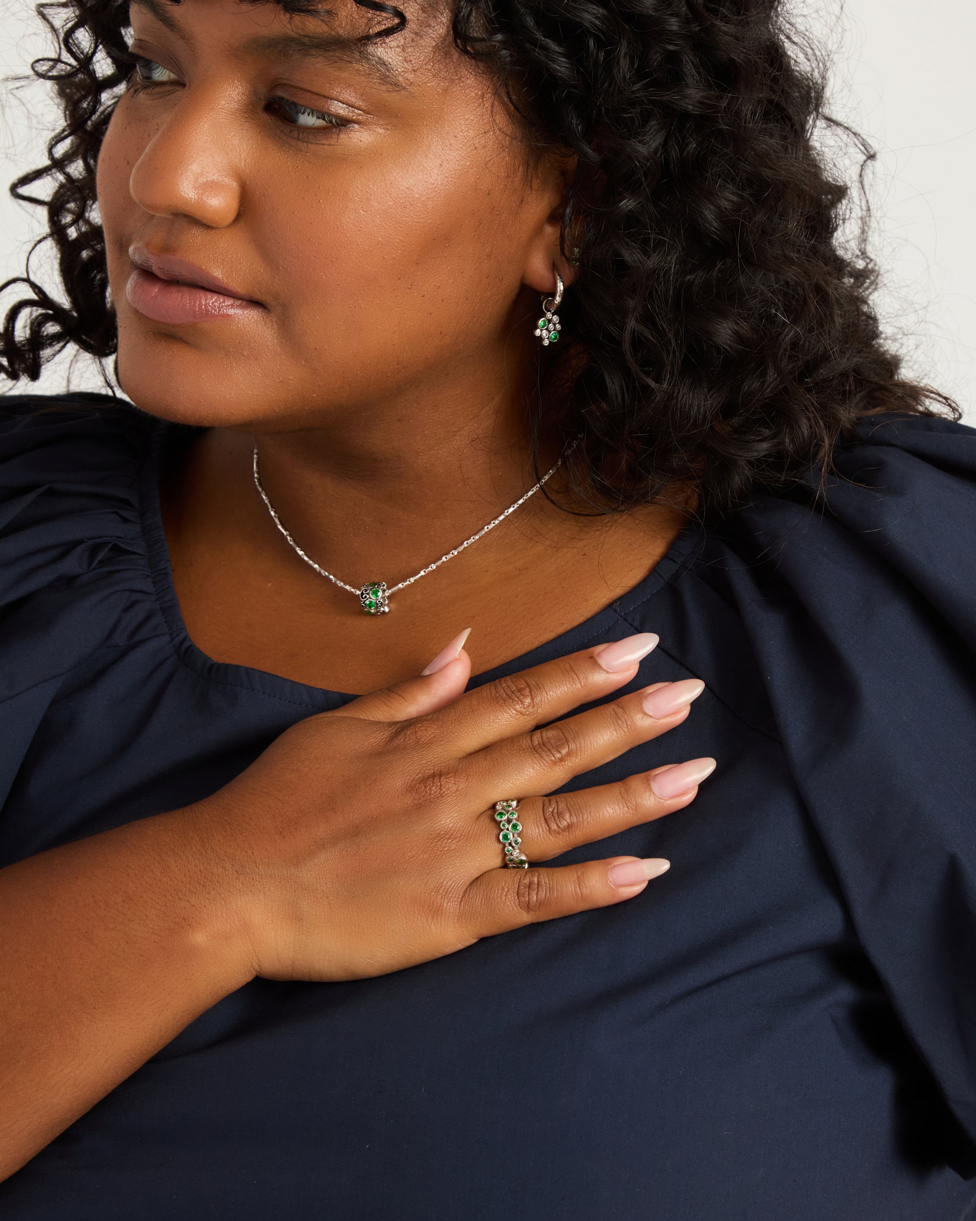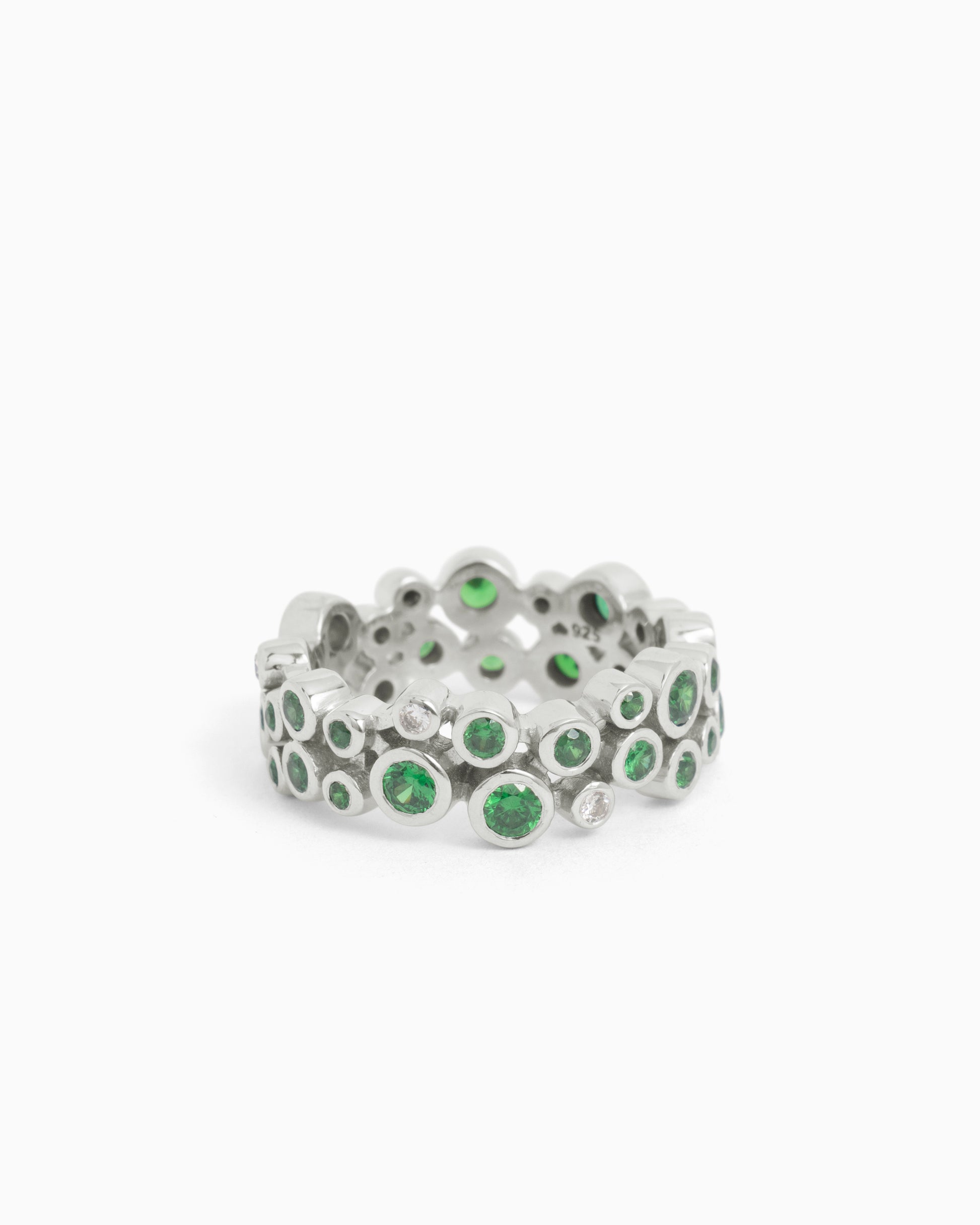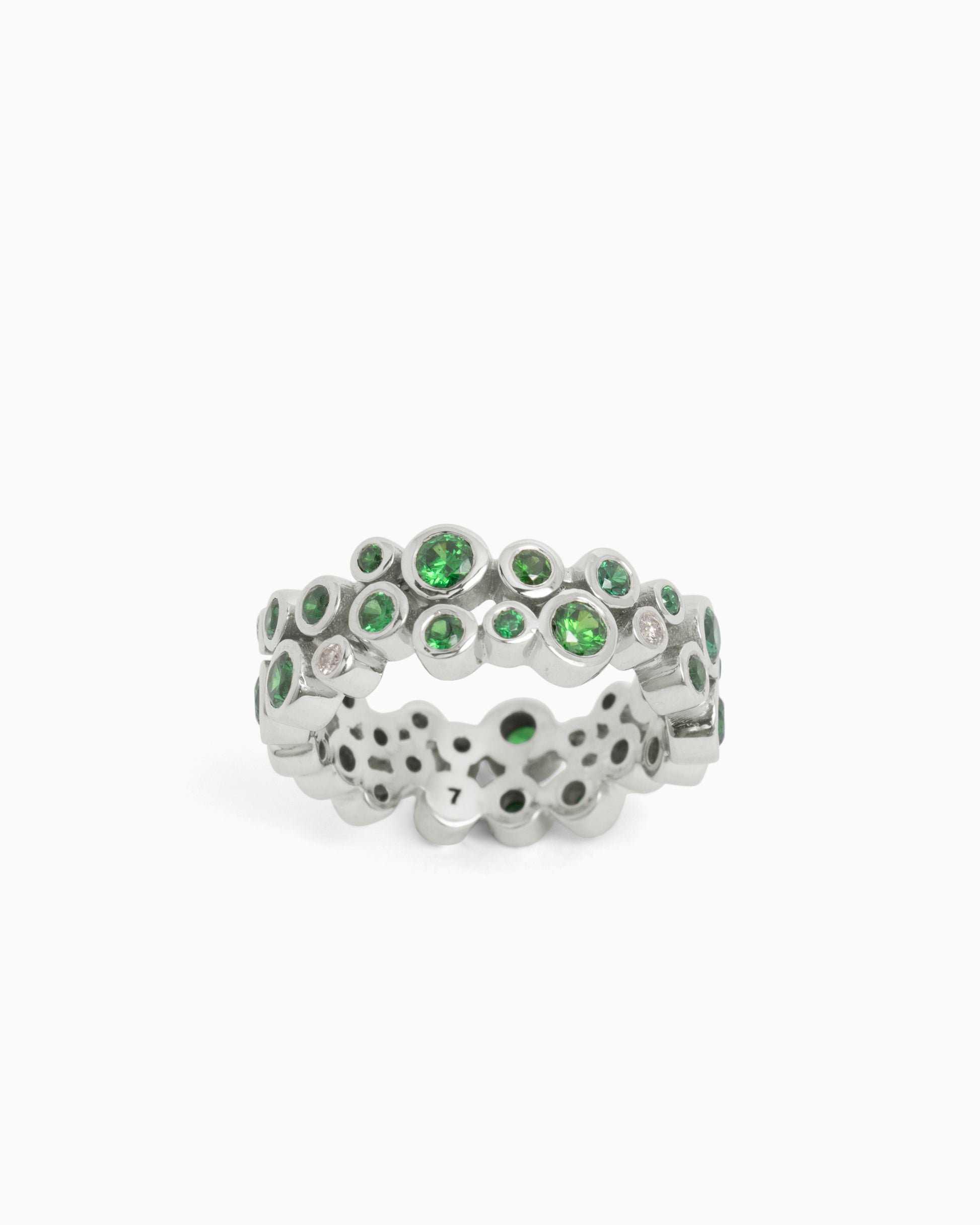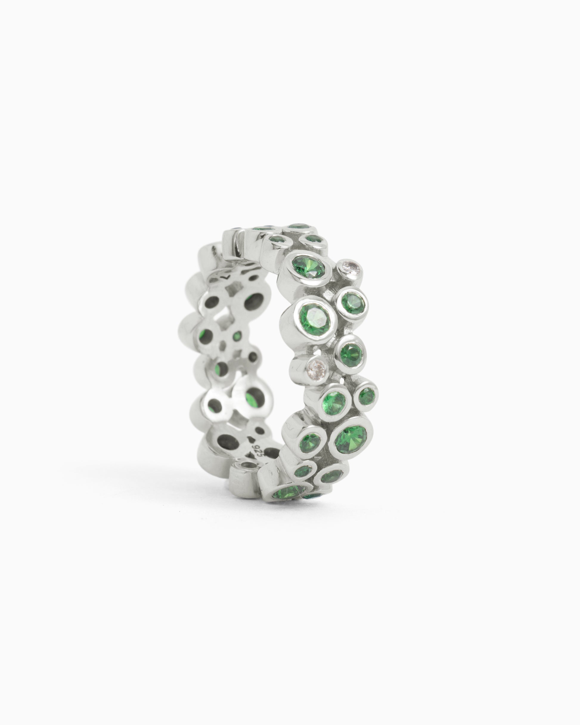 The Diamond & Gemstone Bubble Ring features a unique mix of precious faceted diamonds and green zircon stones in a 'bubbly' setting. Handcrafted in sterling silver, this playful yet refined design is versatile enough to be worn individually or layered with other pieces.