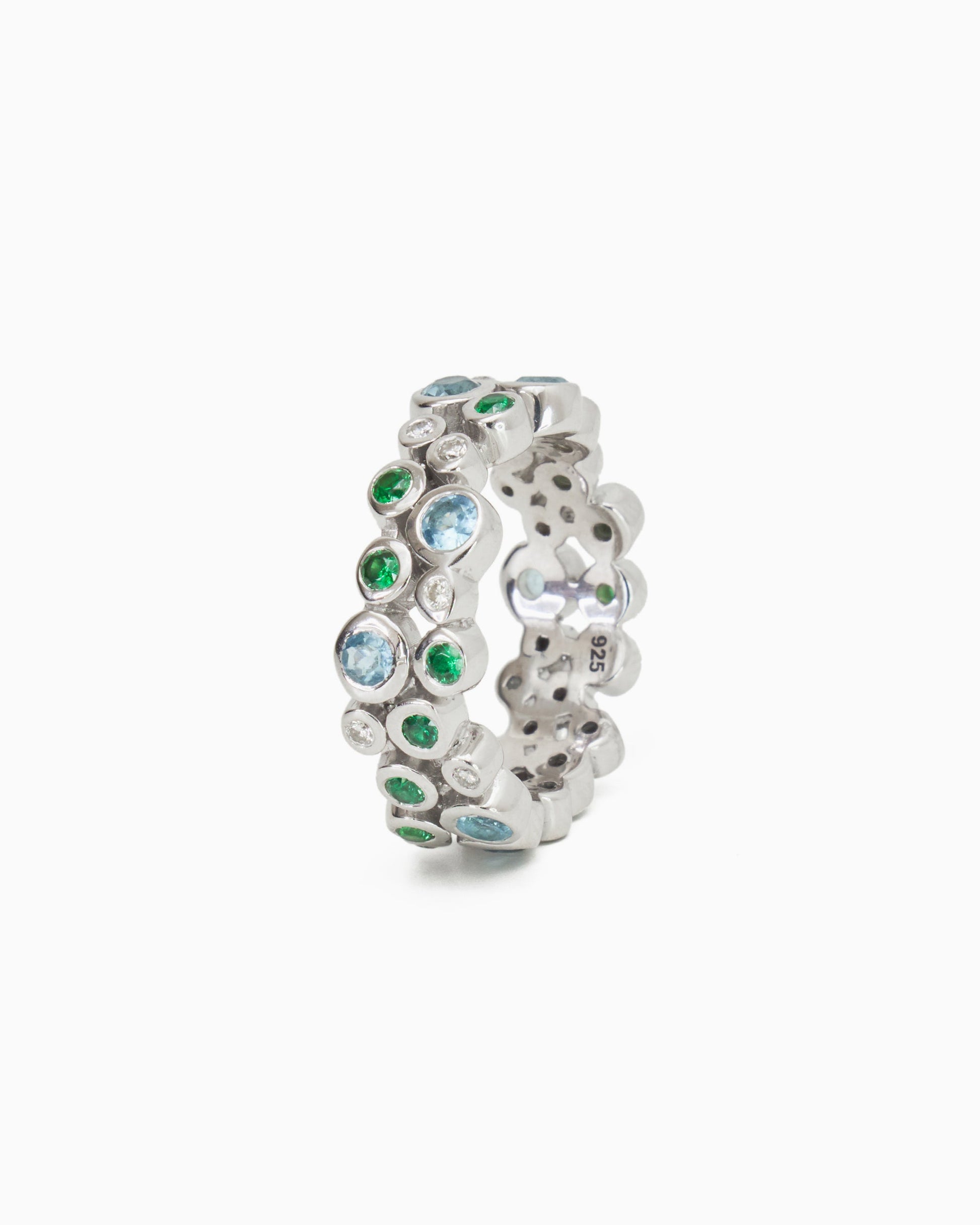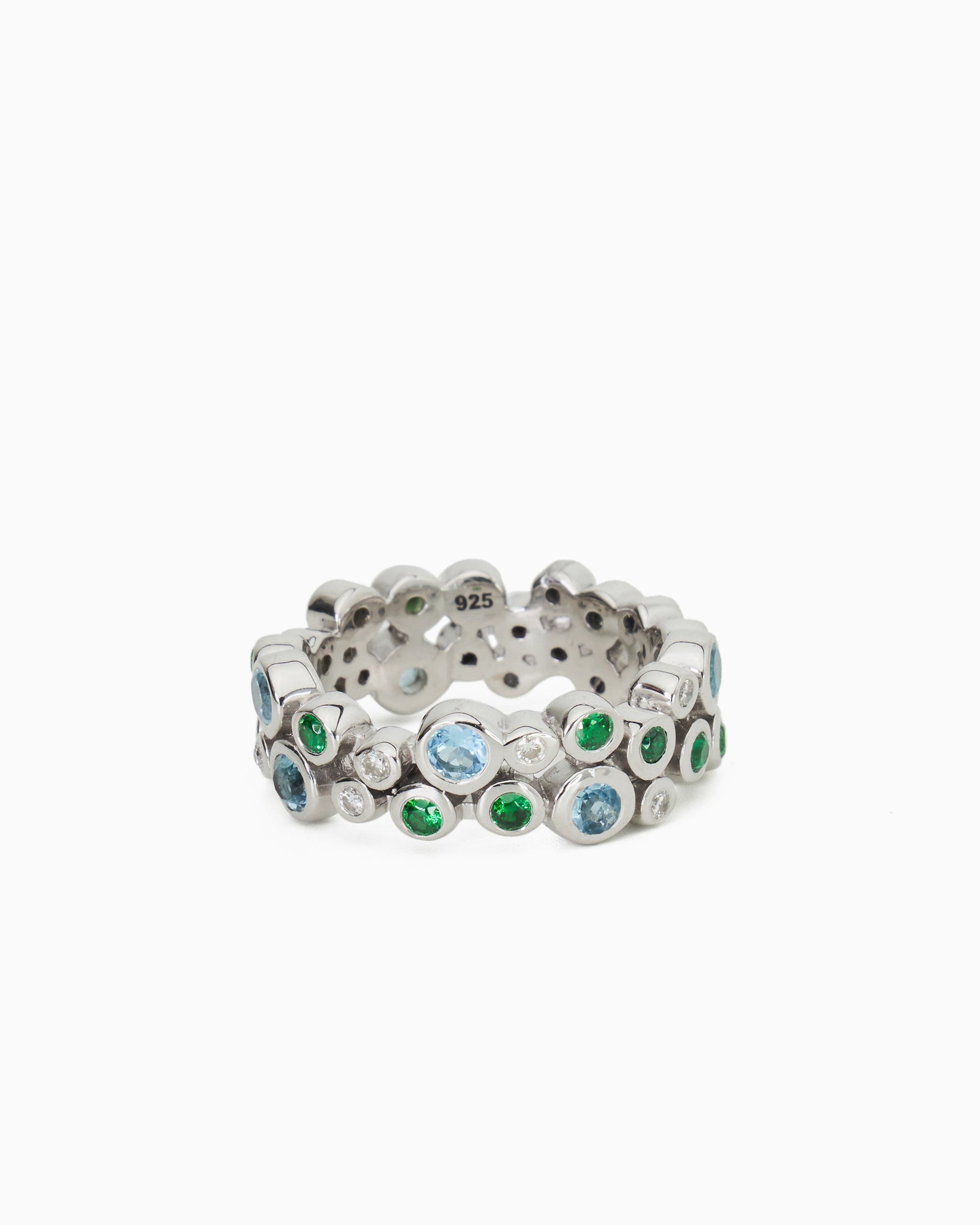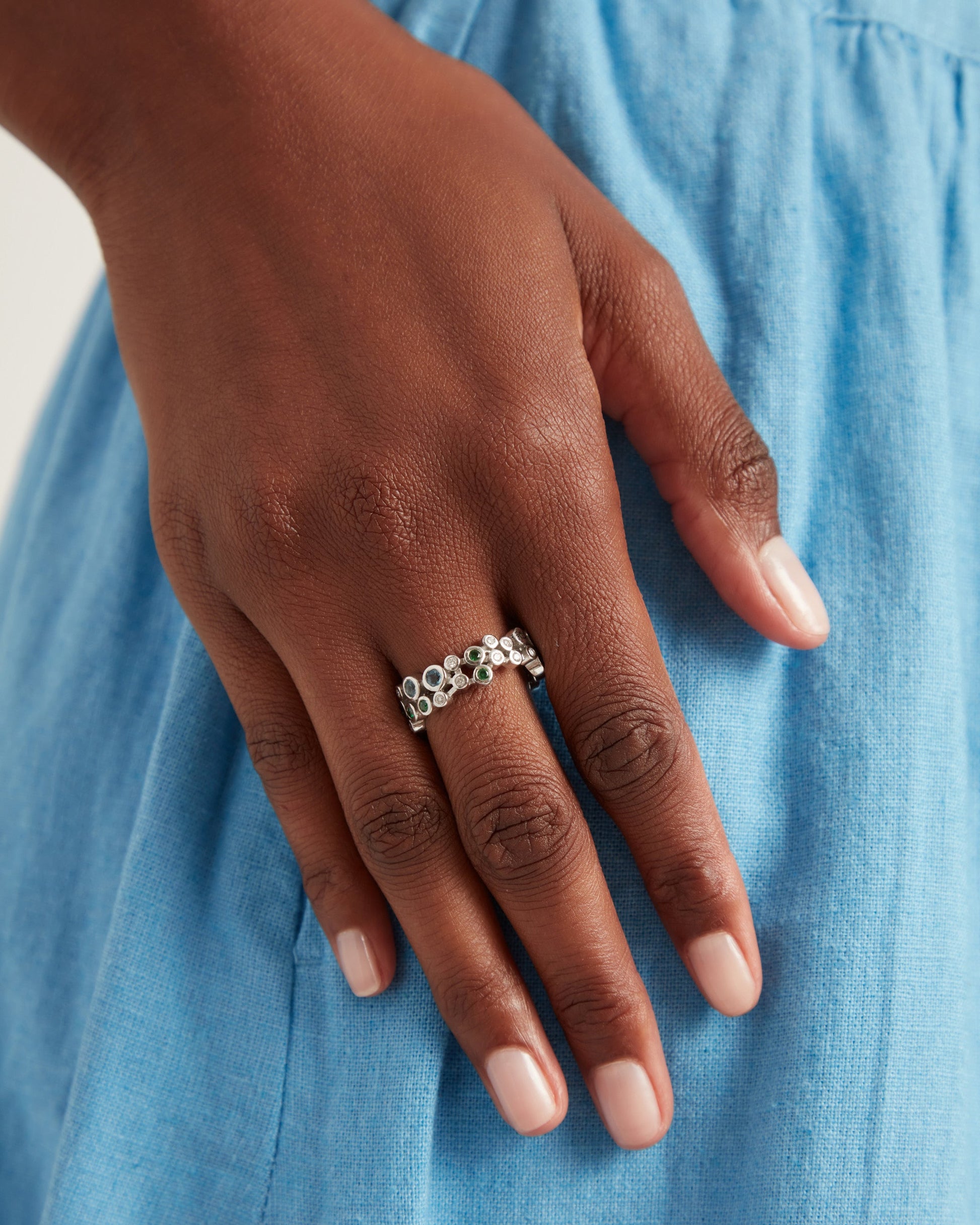 The Diamond & Gemstone Bubble Ring features a unique mix of precious faceted diamonds, Hampton blue topaz, and green zircon stones in a 'bubbly' setting. Handcrafted in sterling silver, this playful yet refined design is versatile enough to be worn individually or layered with other pieces.