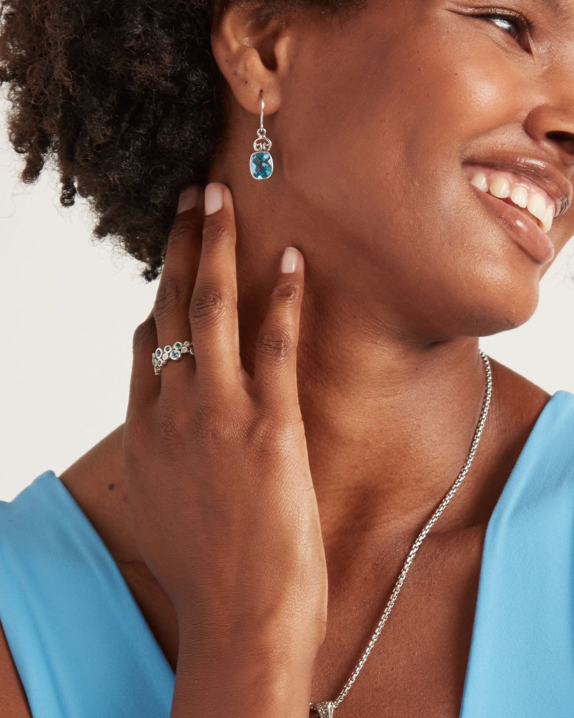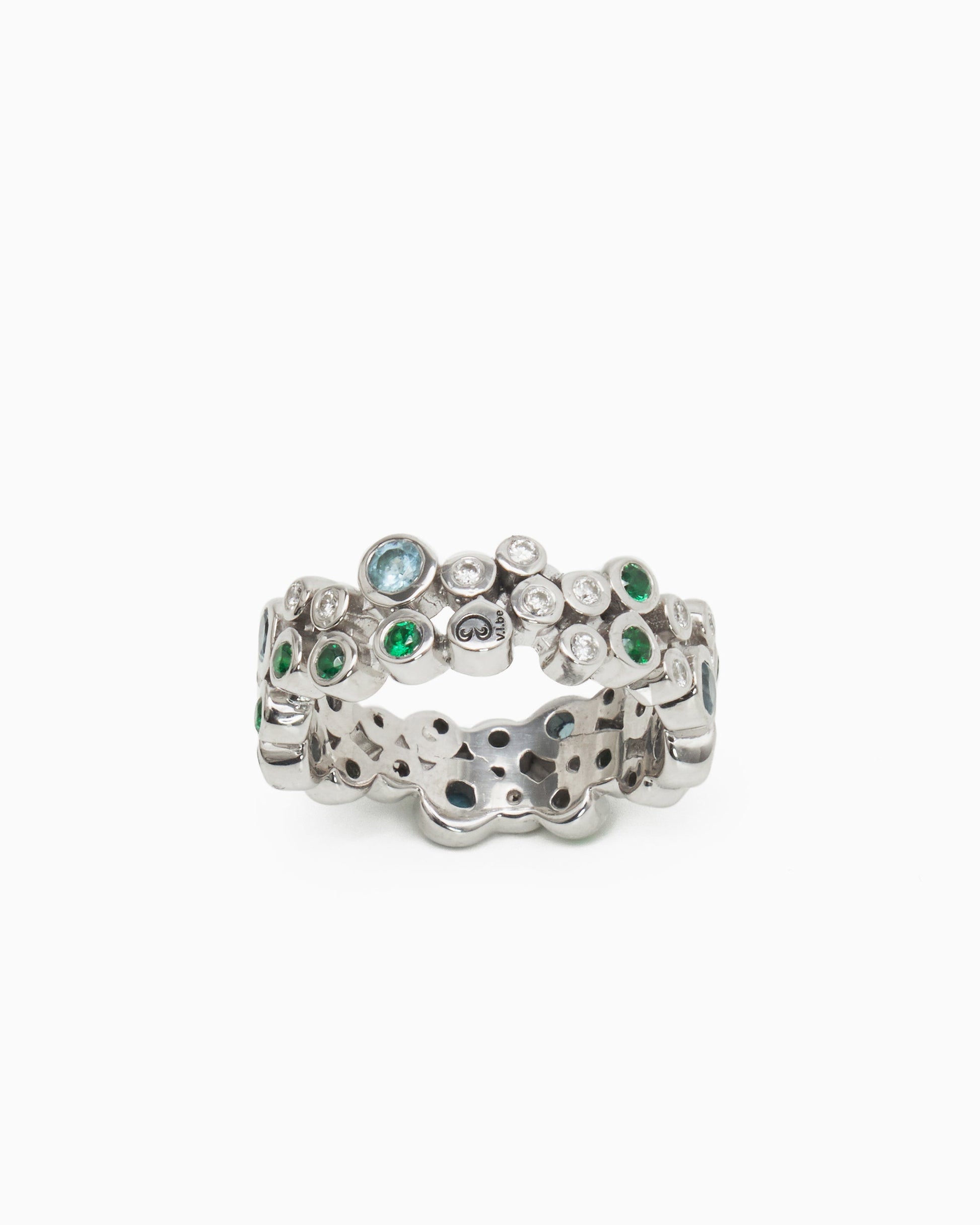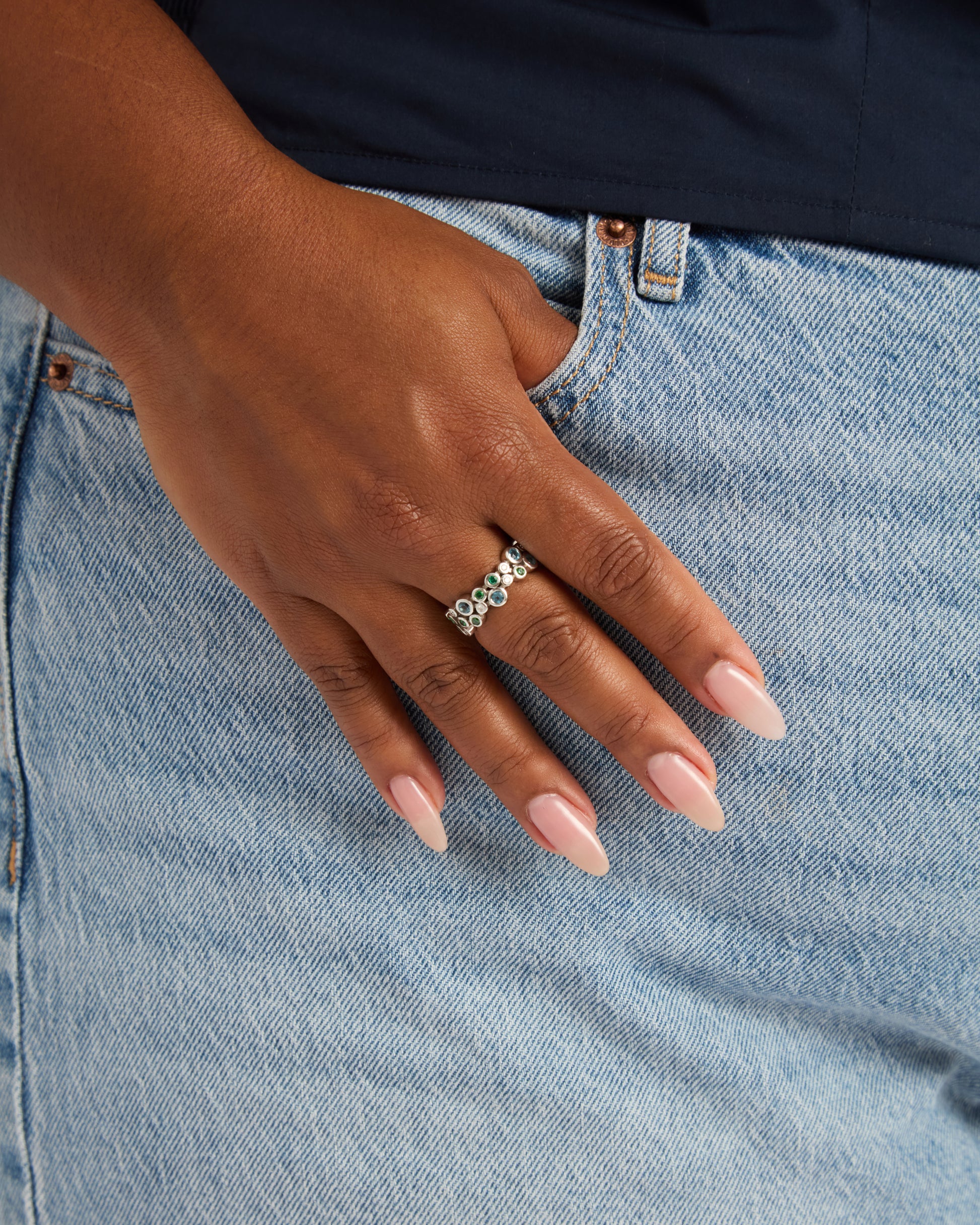 The Diamond & Gemstone Bubble Ring features a unique mix of precious faceted diamonds, Hampton blue topaz, and green zircon stones in a 'bubbly' setting. Handcrafted in sterling silver, this playful yet refined design is versatile enough to be worn individually or layered with other pieces.