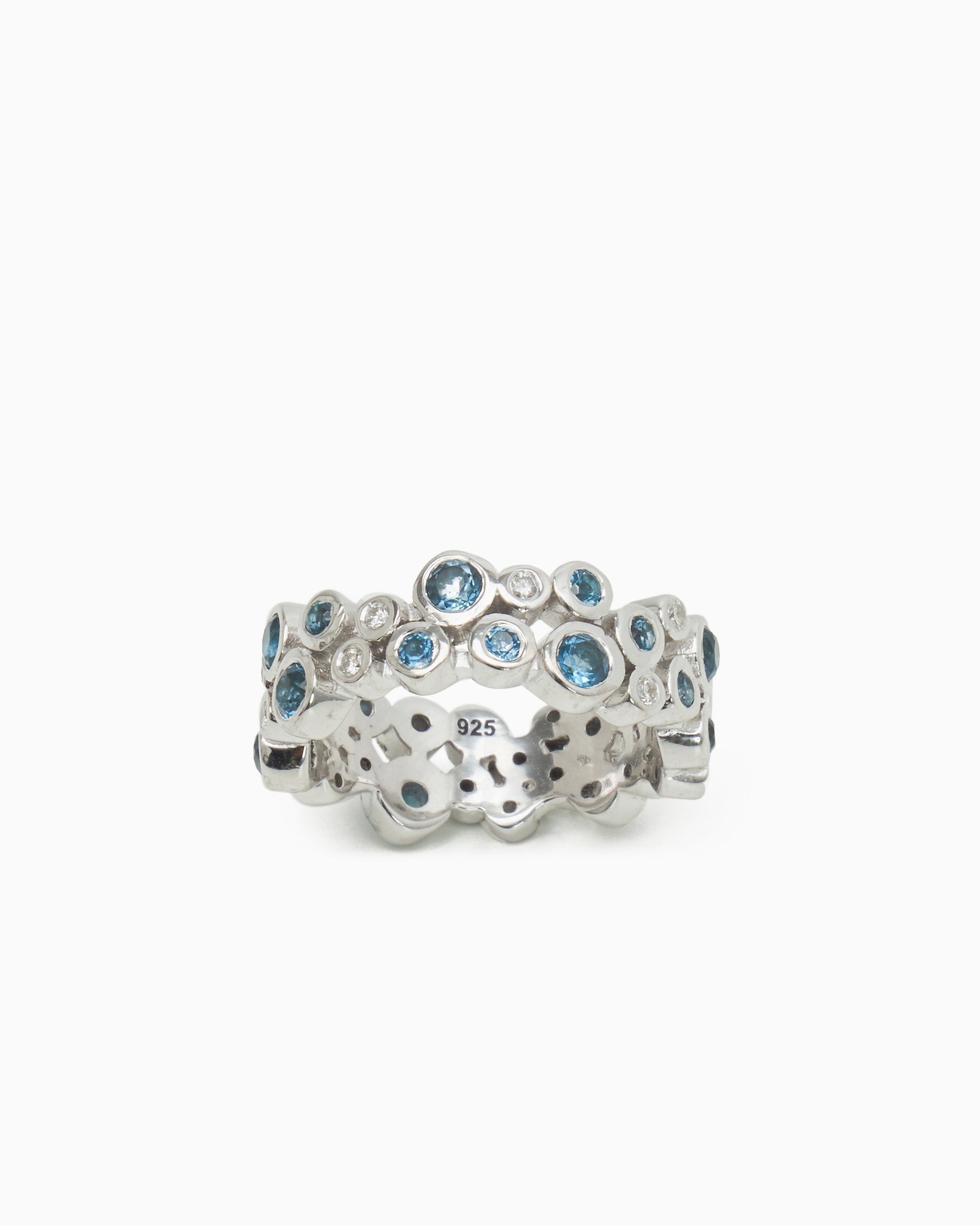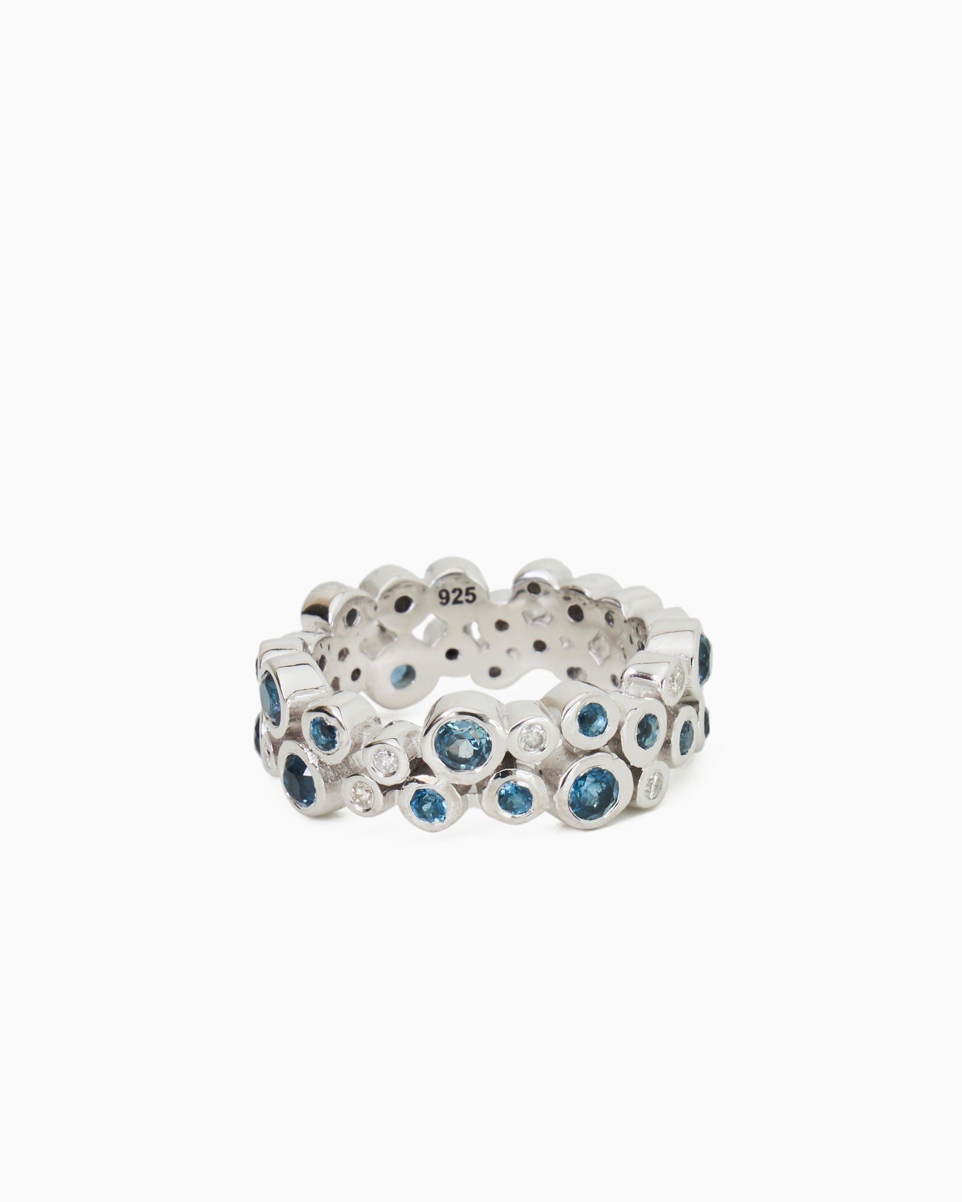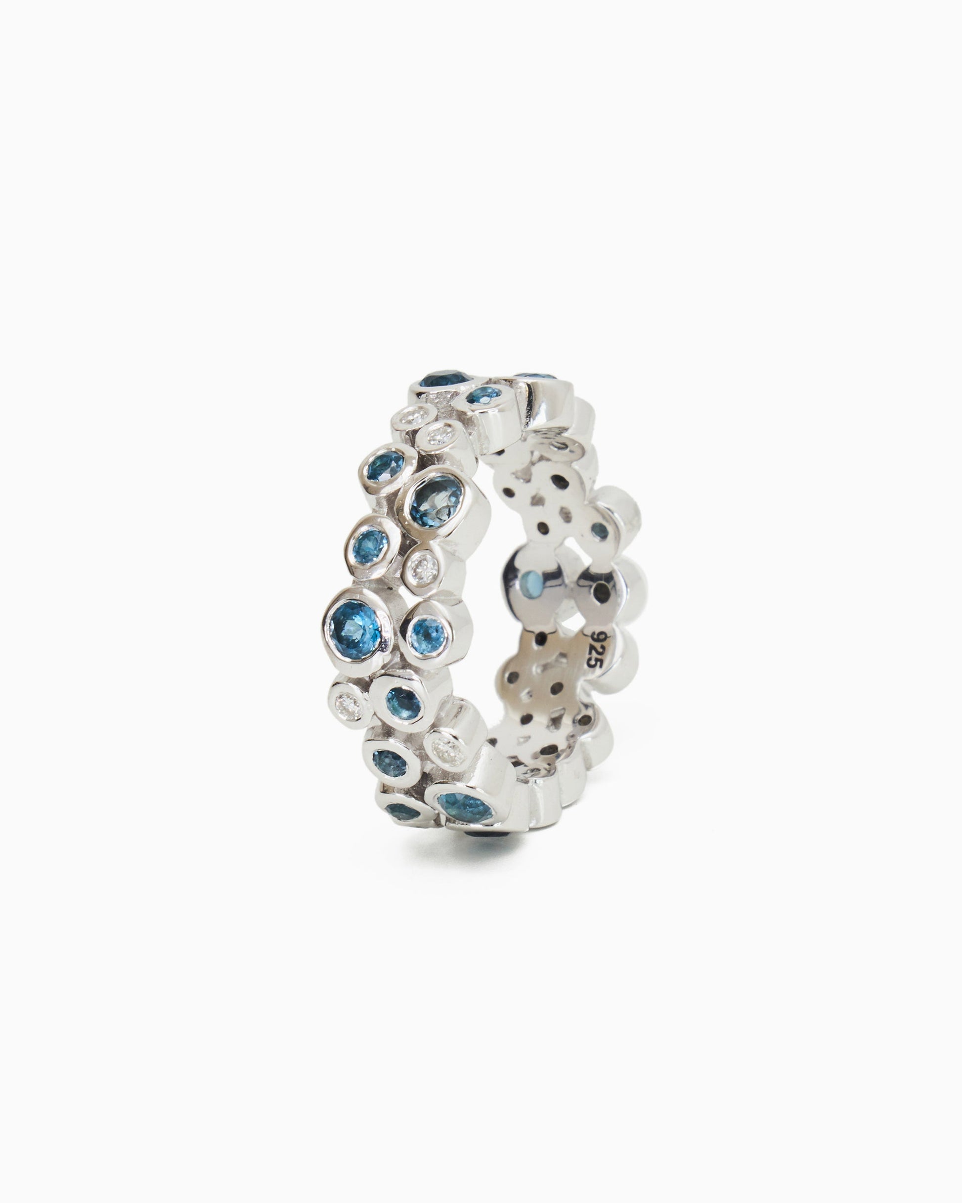 The Diamond & Gemstone Bubble Ring features a unique mix of precious faceted diamonds and London blue topaz stones in a 'bubbly' setting. Handcrafted in sterling silver, this playful yet refined design is versatile enough to be worn individually or layered with other pieces.