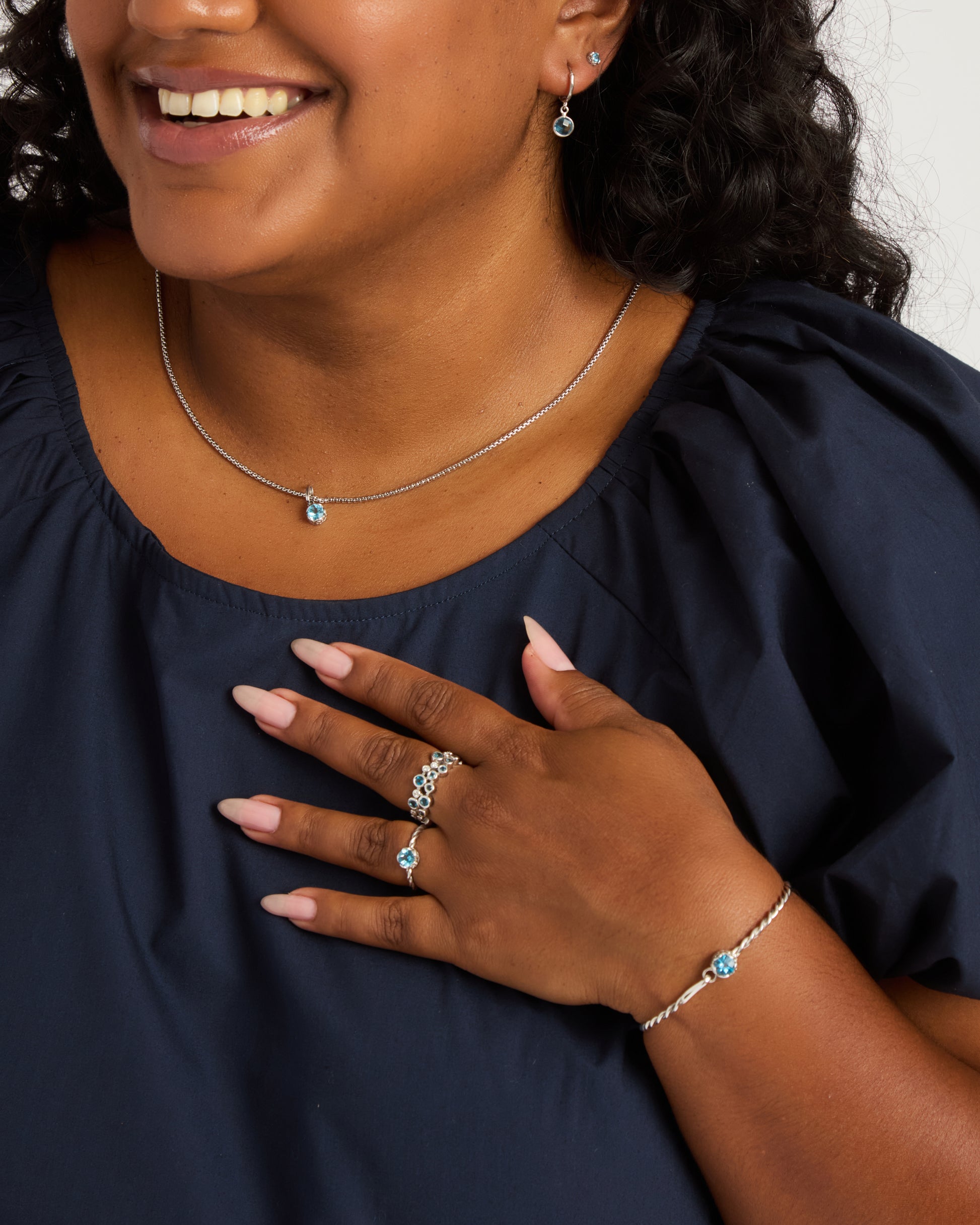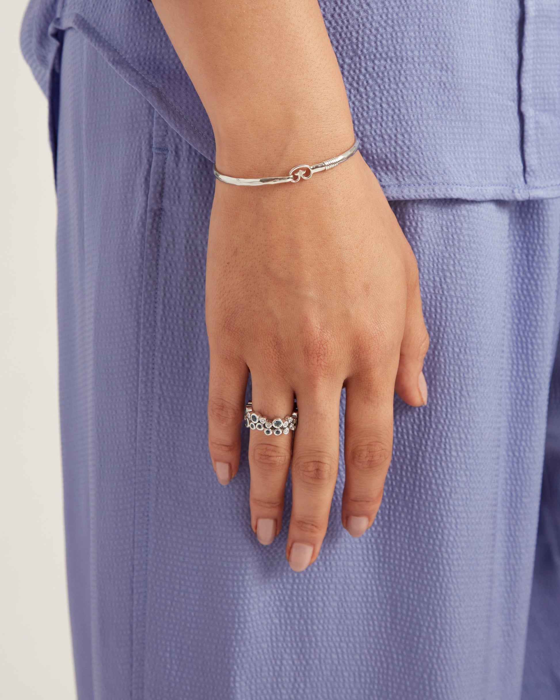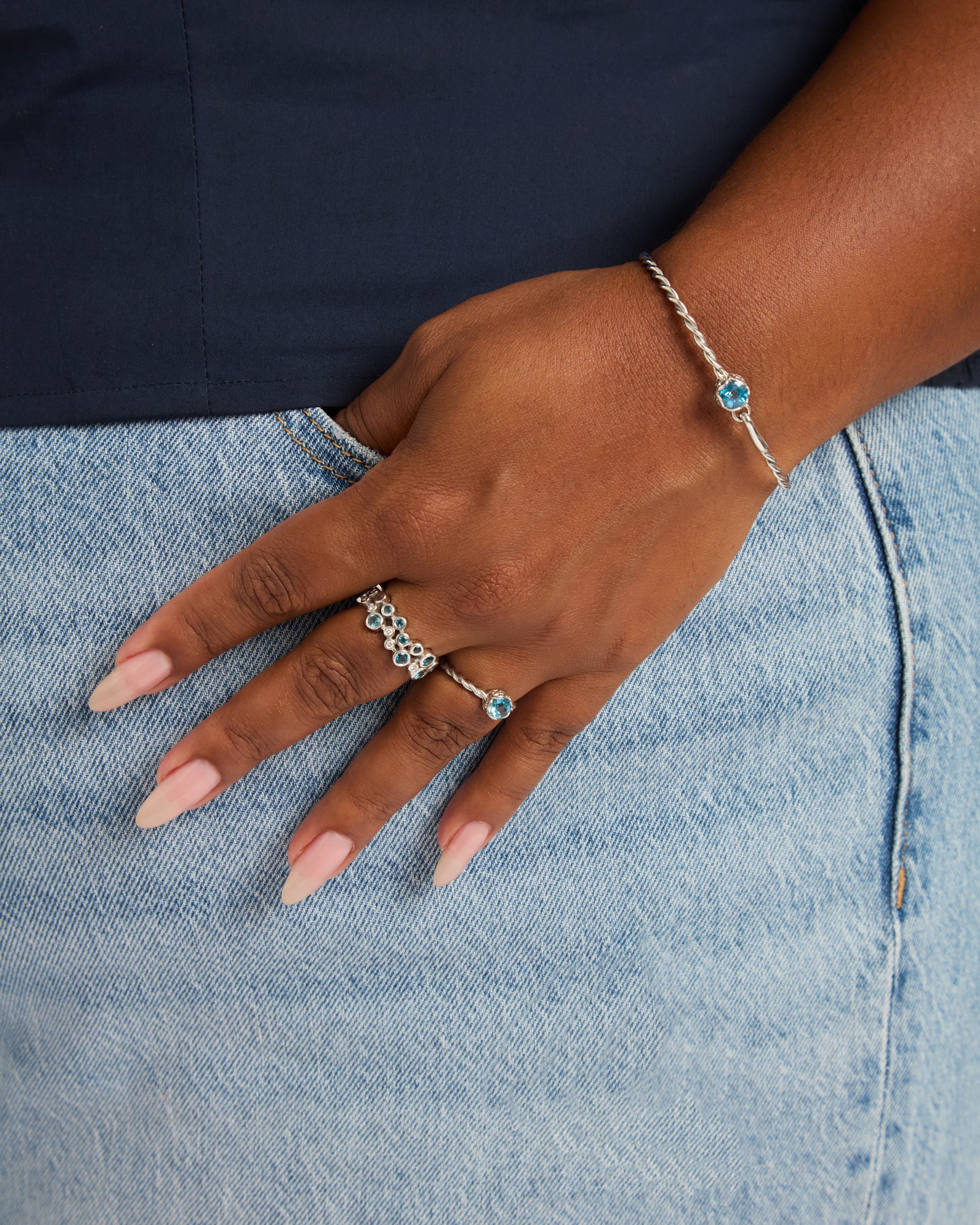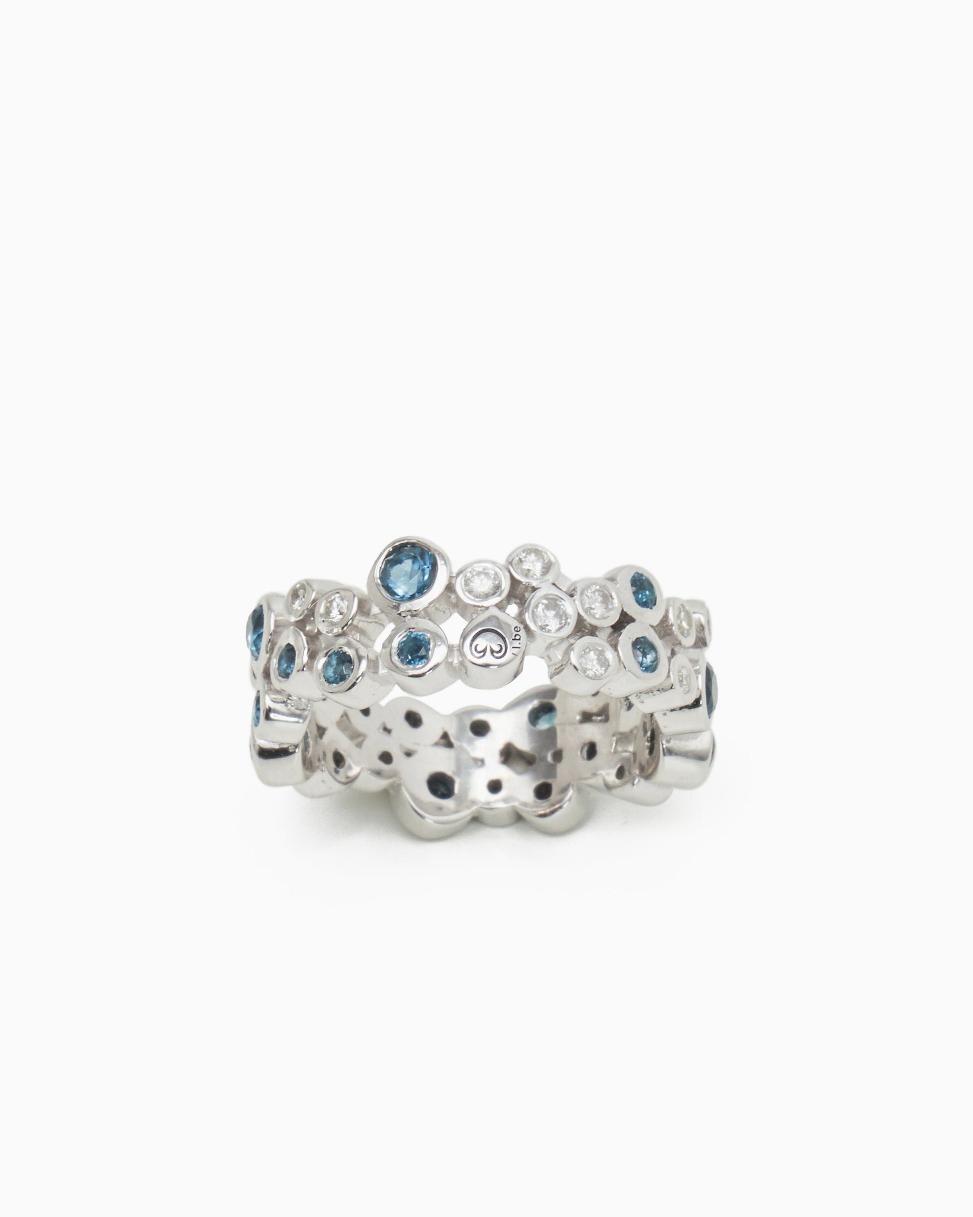 The Diamond & Gemstone Bubble Ring features a unique mix of precious faceted diamonds and London blue topaz stones in a 'bubbly' setting. Handcrafted in sterling silver, this playful yet refined design is versatile enough to be worn individually or layered with other pieces.