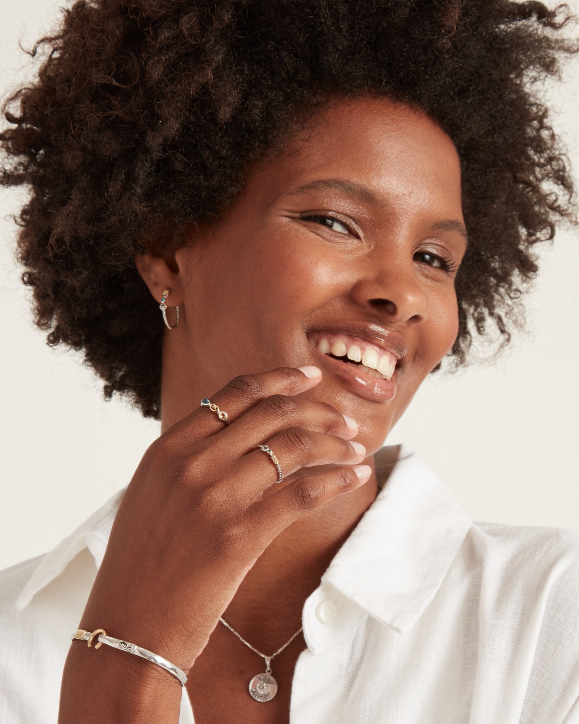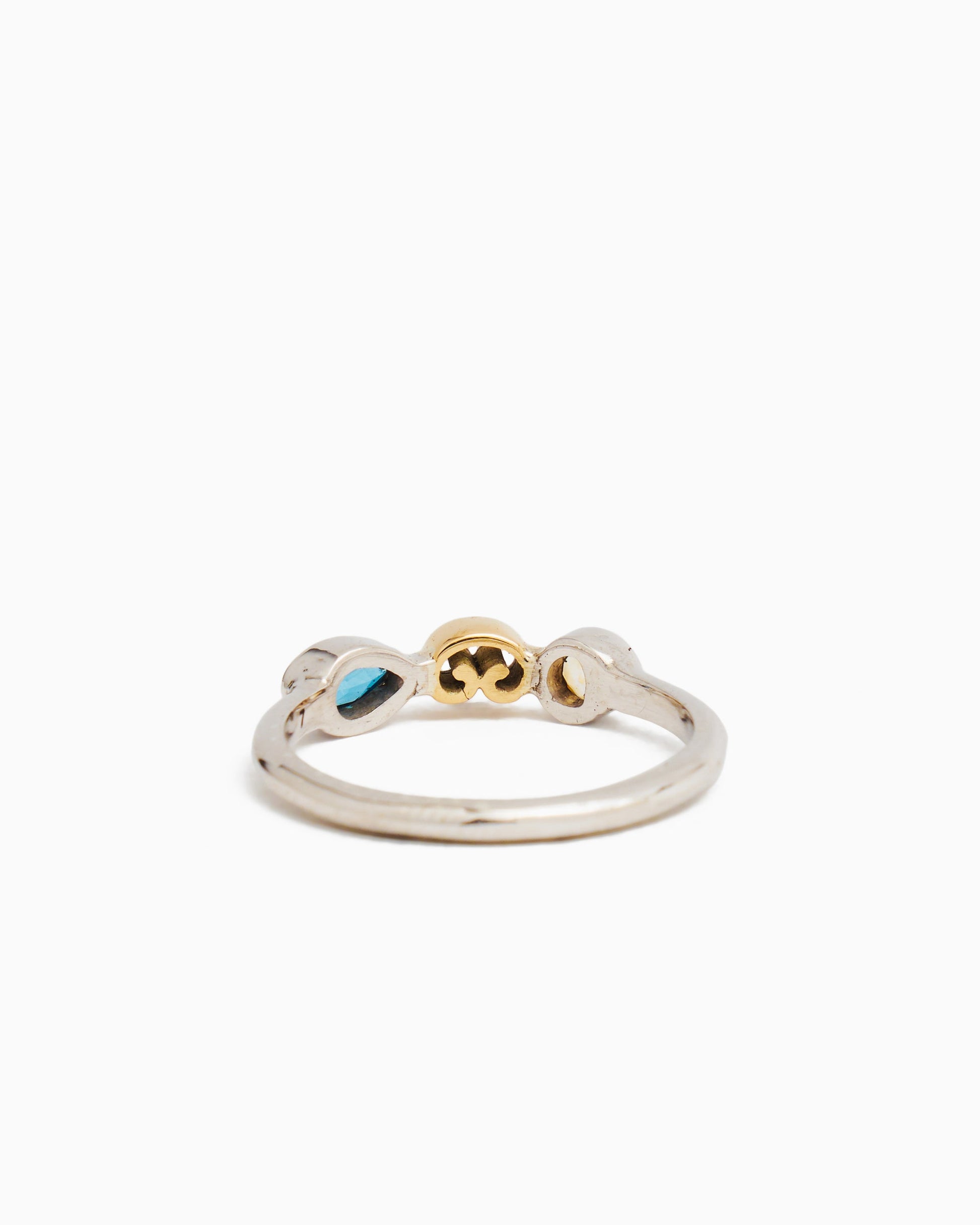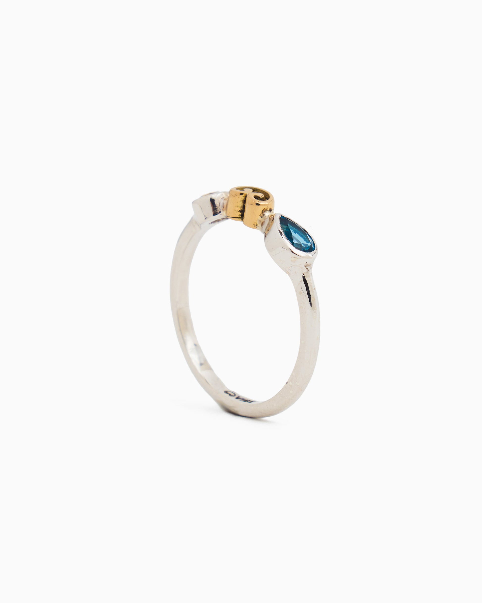 The Double Stone & Petroglyph Ring embodies delicate sophistication with its distinctive features. Handcrafted with a sterling silver band, a faceted citrine and London blue topaz stone, and a 14K solid gold petroglyph, this ring offers a perfect balance of elegance and uniqueness. Its versatility allows you to wear it alone for a subtle statement, or stack it with other rings for a personalized and stylish look.