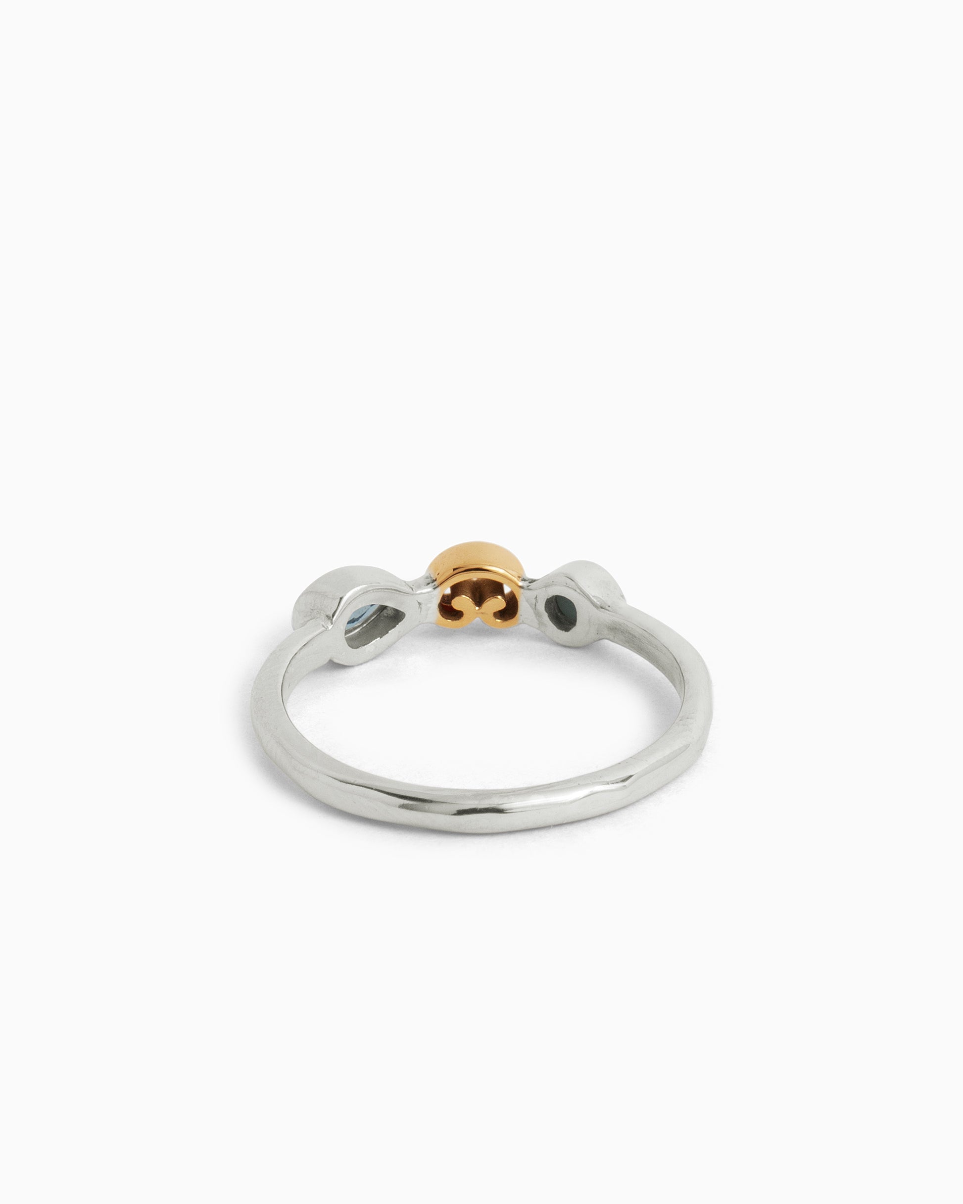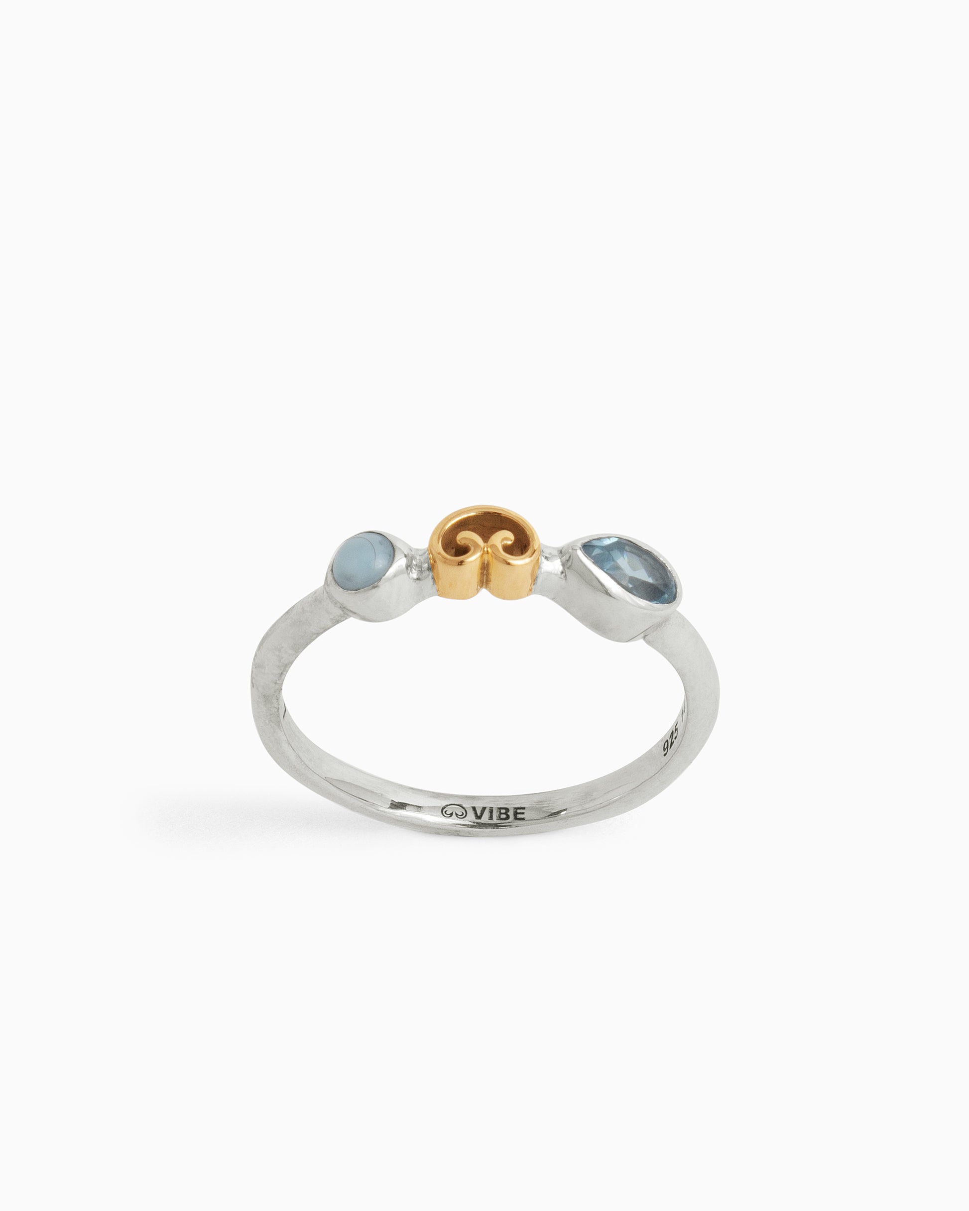 The Double Stone & Petroglyph Ring embodies delicate sophistication with its distinctive features. Handcrafted with a sterling silver band, a larimar cabochon, a faceted Hampton blue topaz stone, and a 14K solid gold petroglyph, this ring offers a perfect balance of elegance and uniqueness. Its versatility allows you to wear it alone for a subtle statement, or stack it with other rings for a personalized and stylish look.