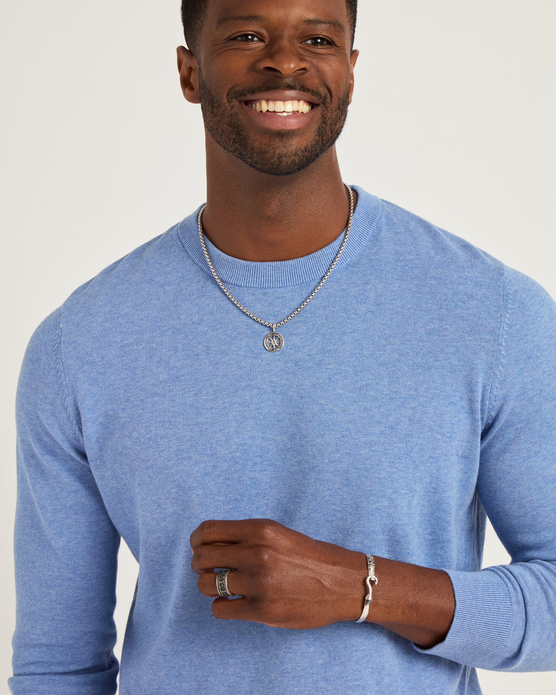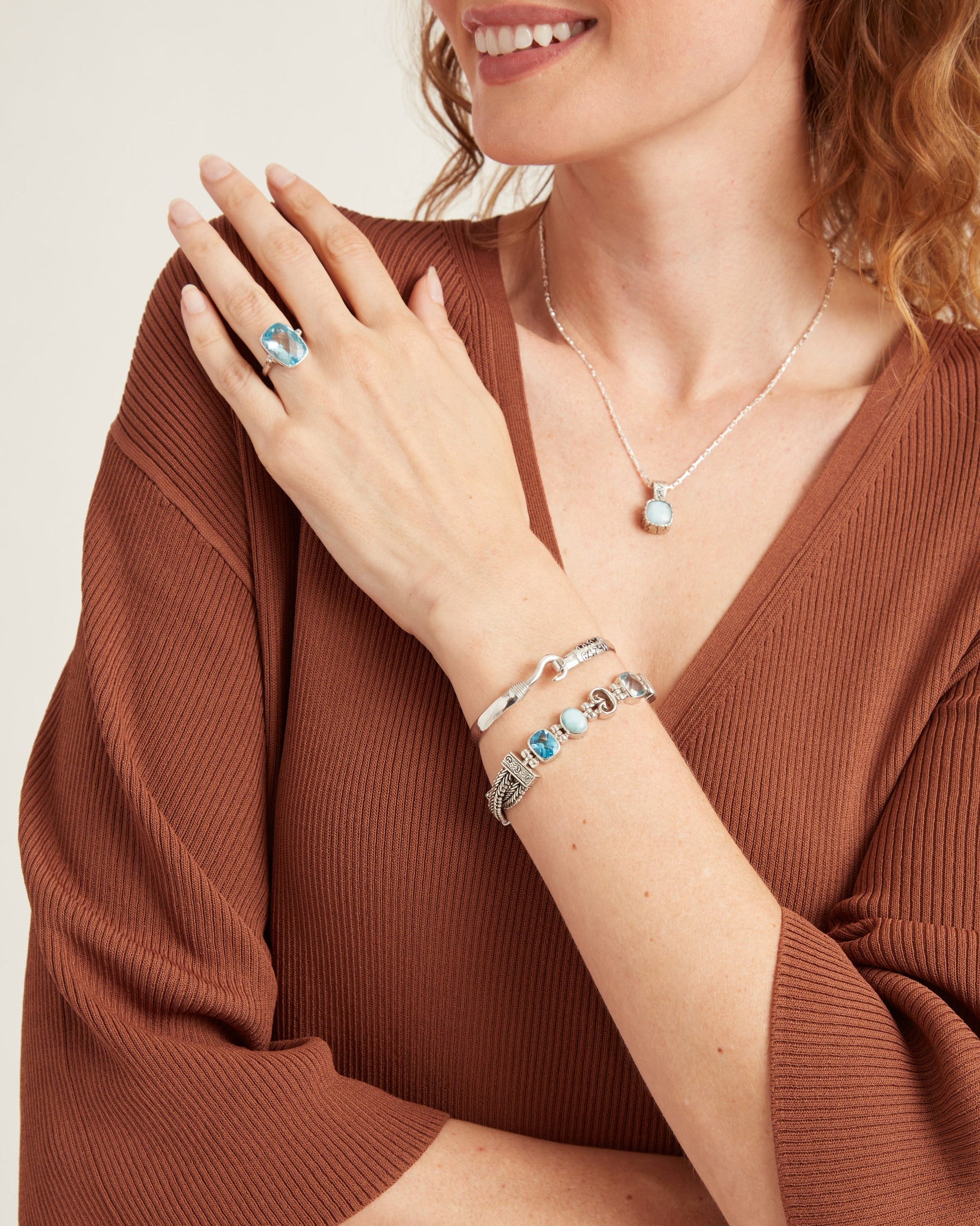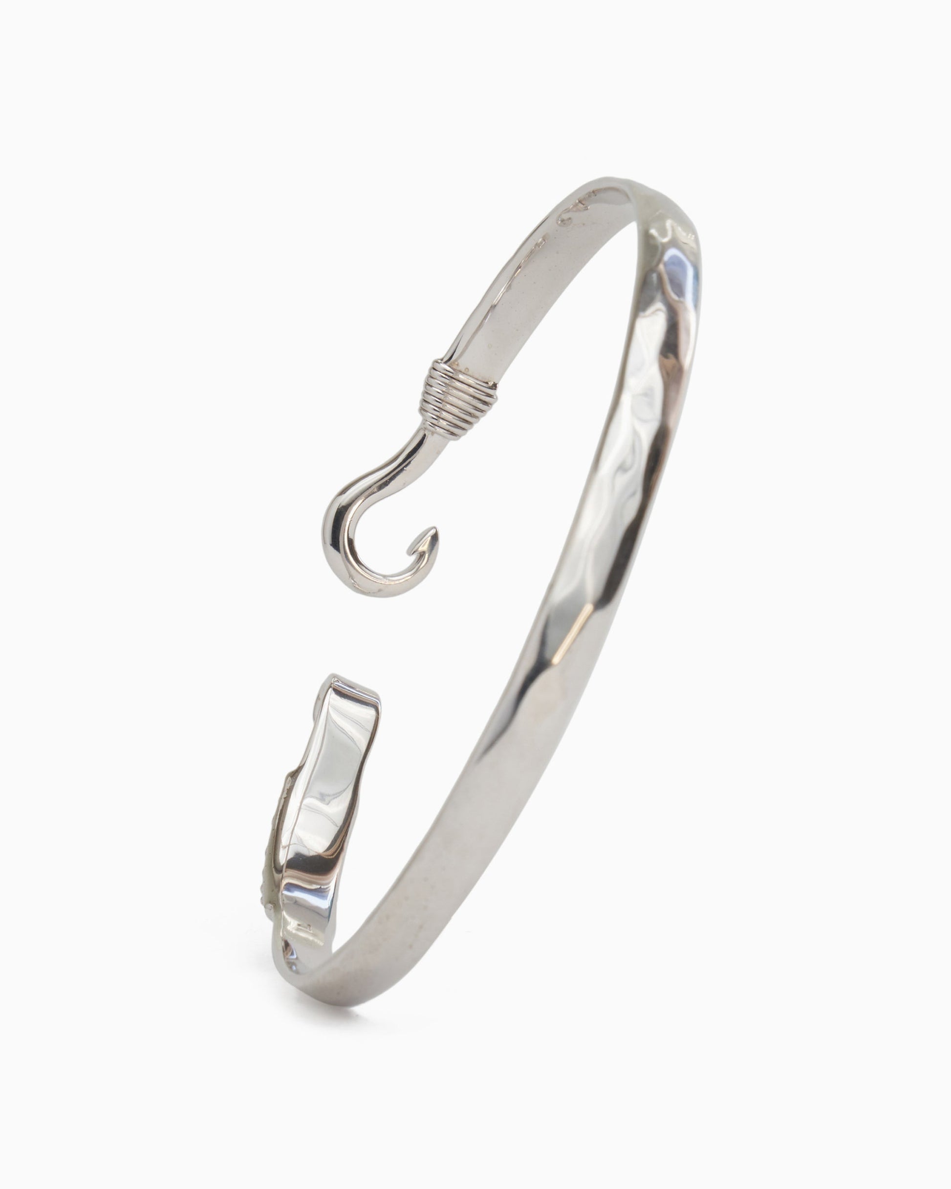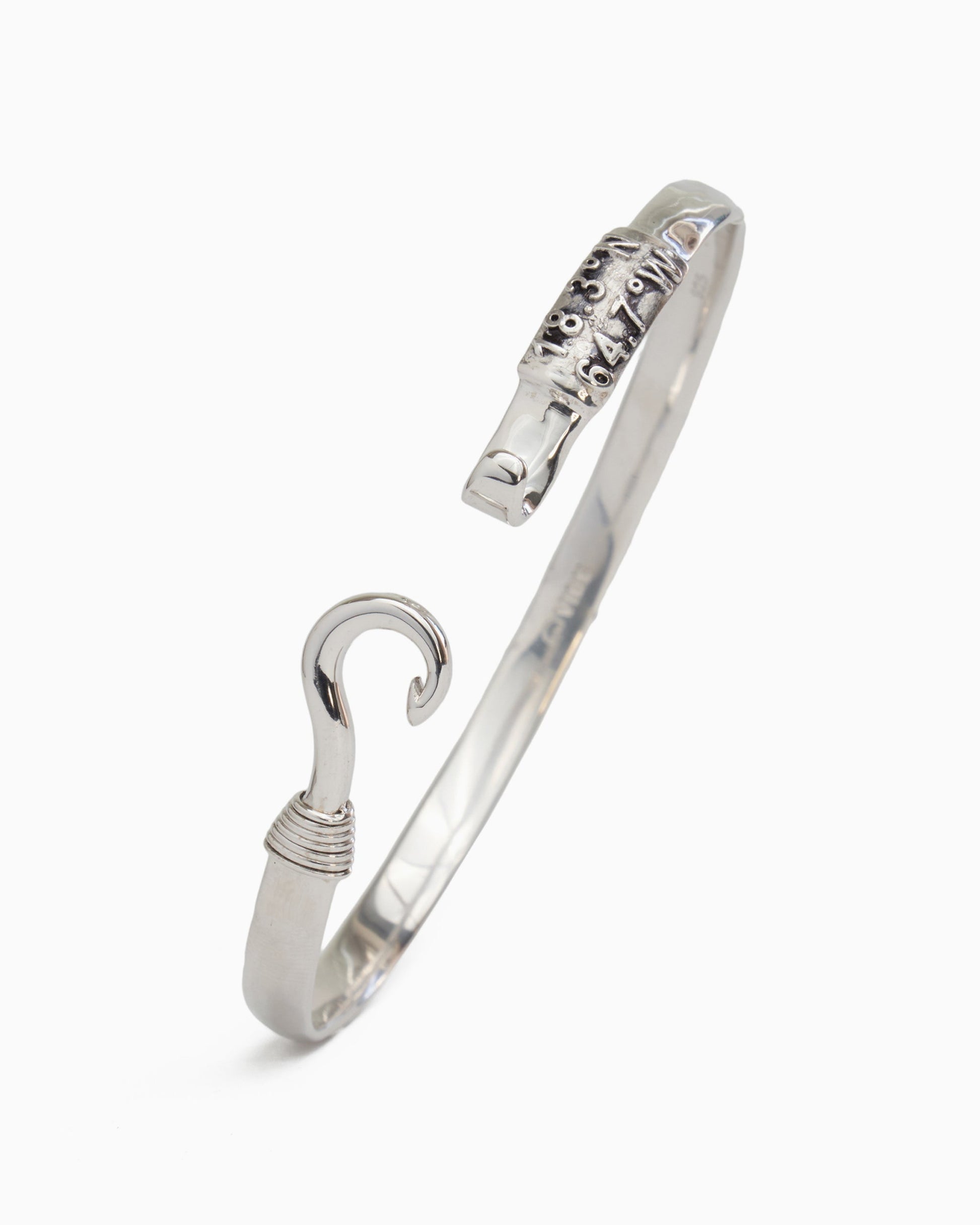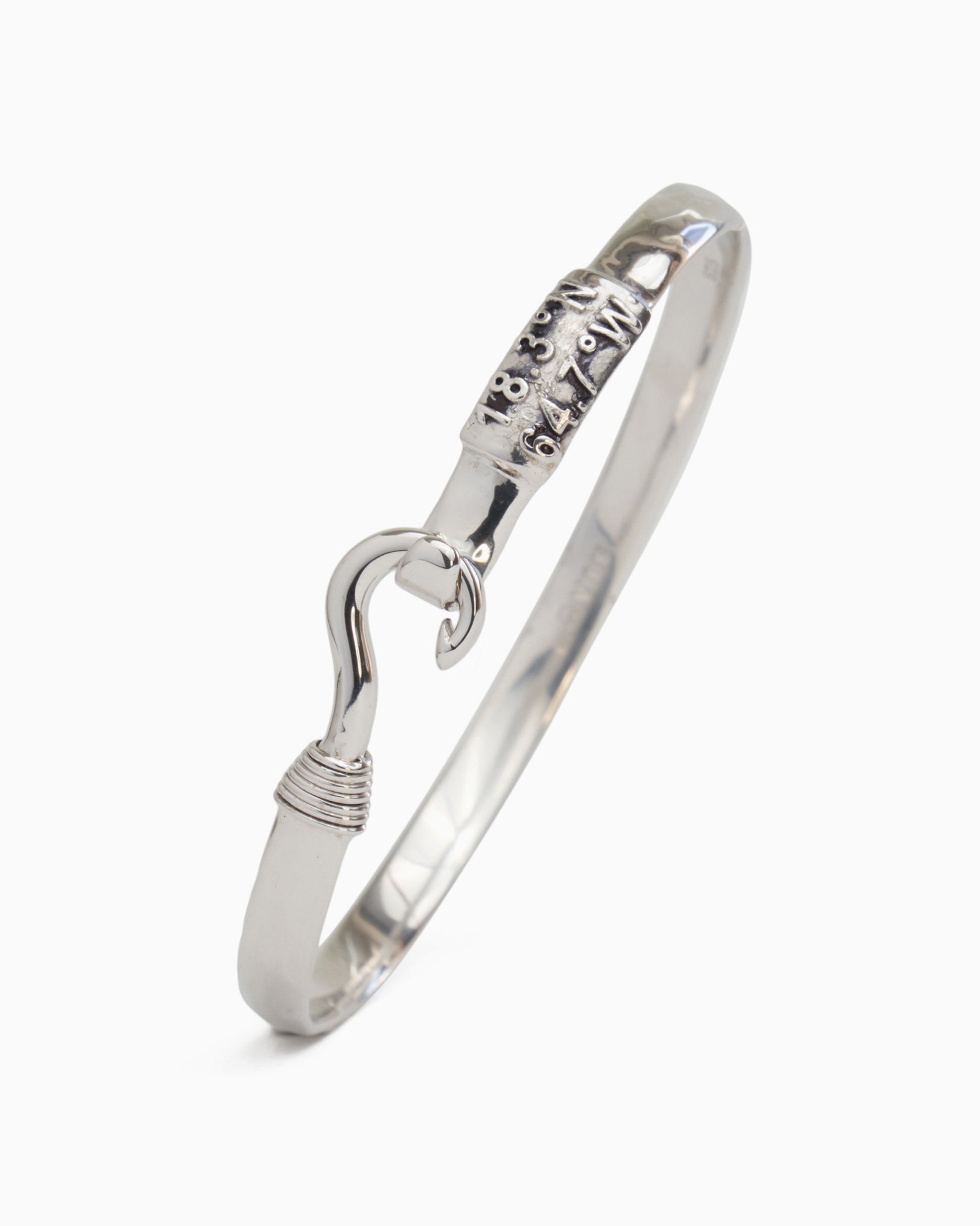 A Vibe signature, the Fish Hook Bracelet is fashioned in gently hammered sterling silver with a fish hook clasp. Featuring the St. John coordinates and seven good luck wraps, solo or stacked, it is sure to be a favorite statement piece. Found in many of our designs, Vibe’s seven good luck wraps represent love, laughter, happiness, good fortune, health, unity, and peace. In Caribbean tradition, the fish hook design represents a symbol of love and hope. Fishermen's wives wore hooks facing their hearts, wishing for their husband's safe return from the sea. Wear this piece on its own or stack it with other bracelets for a layered look.