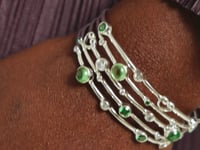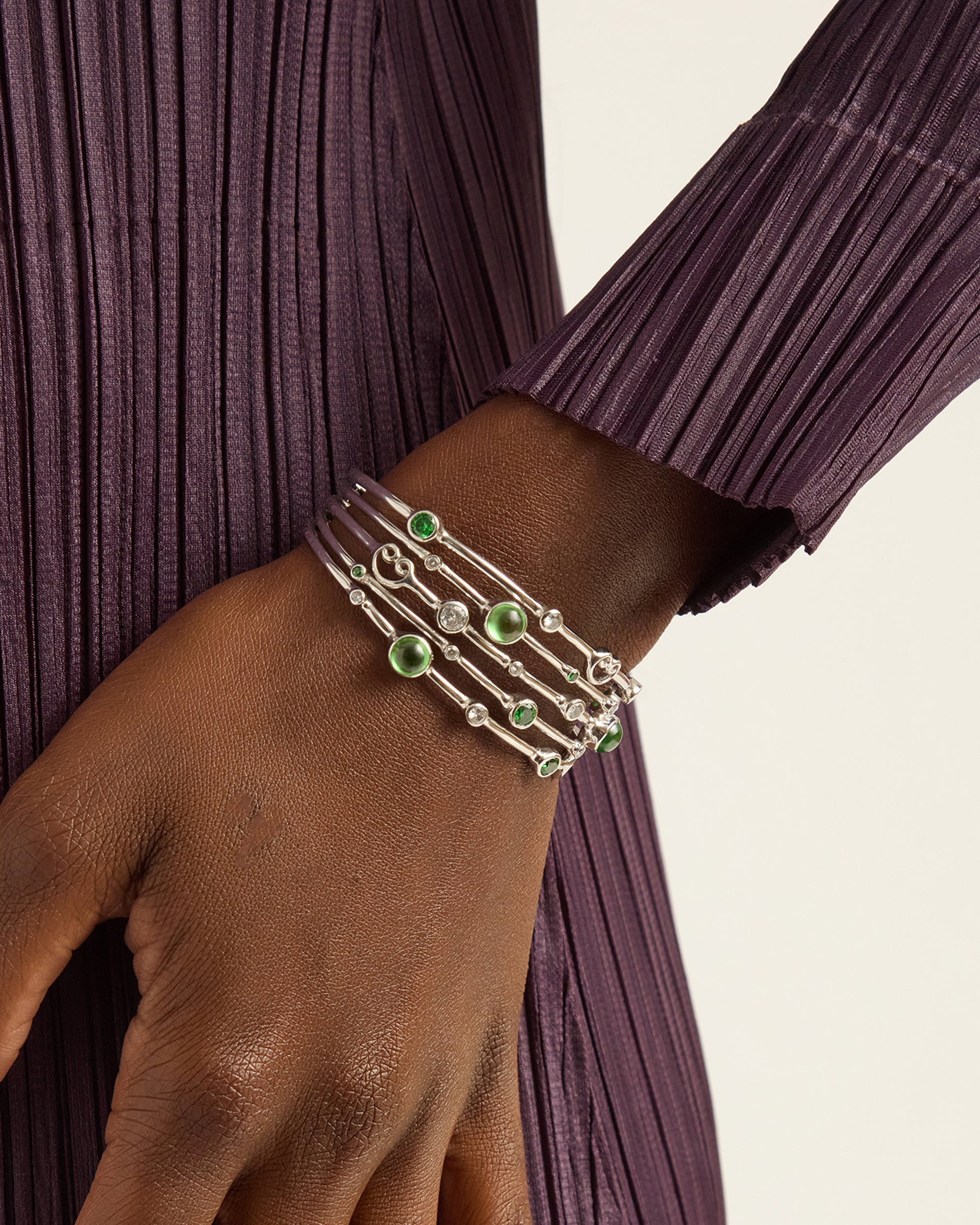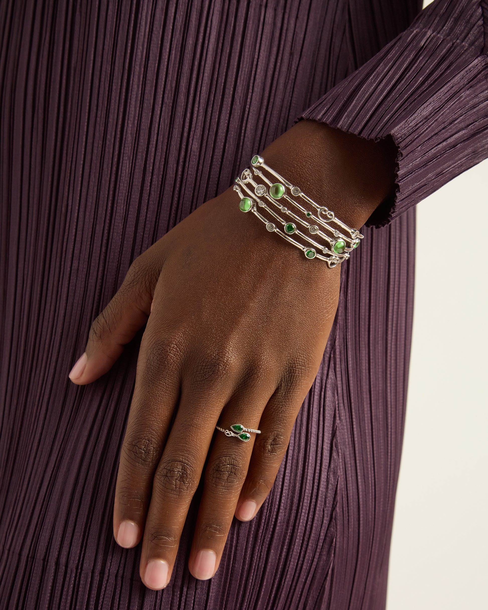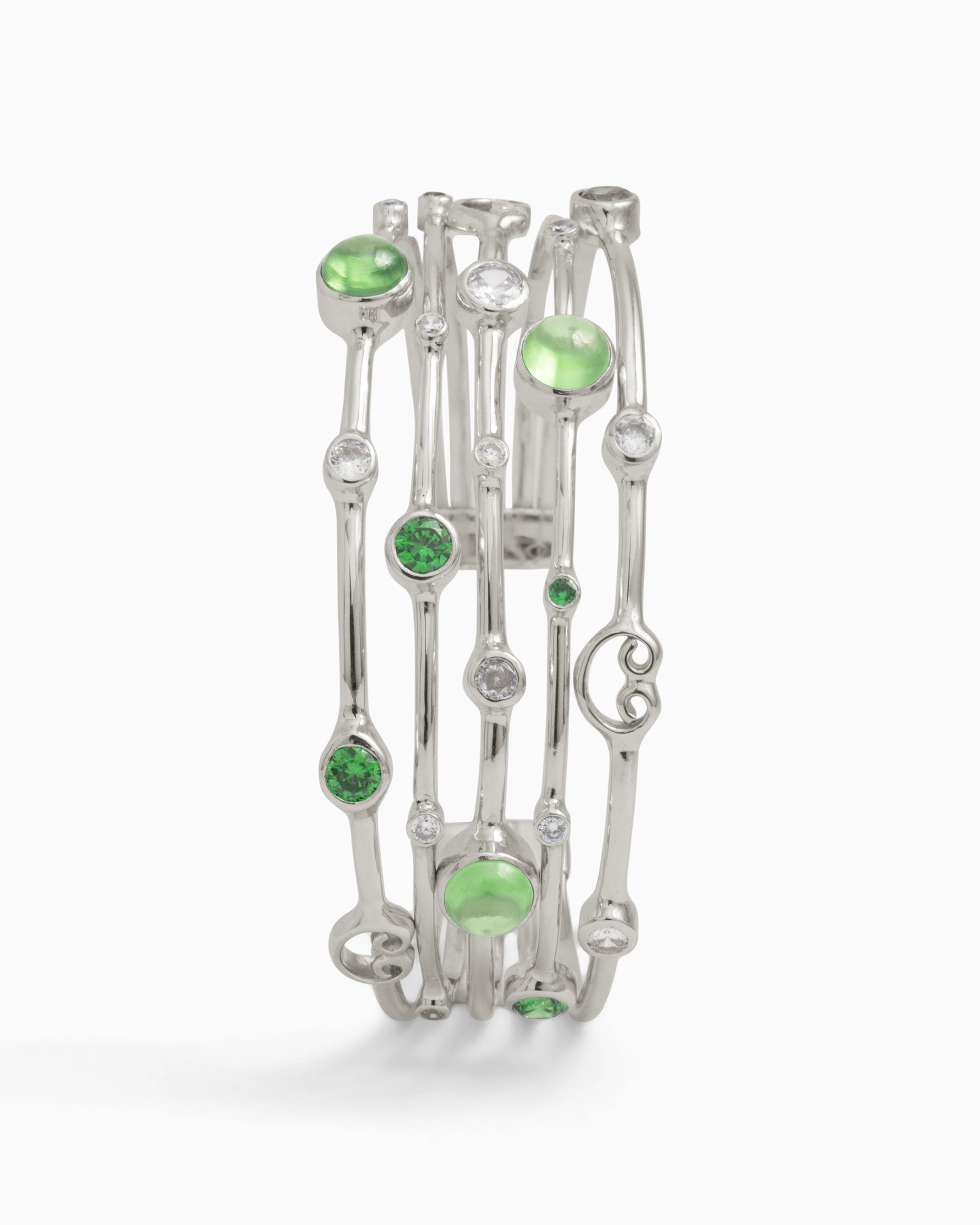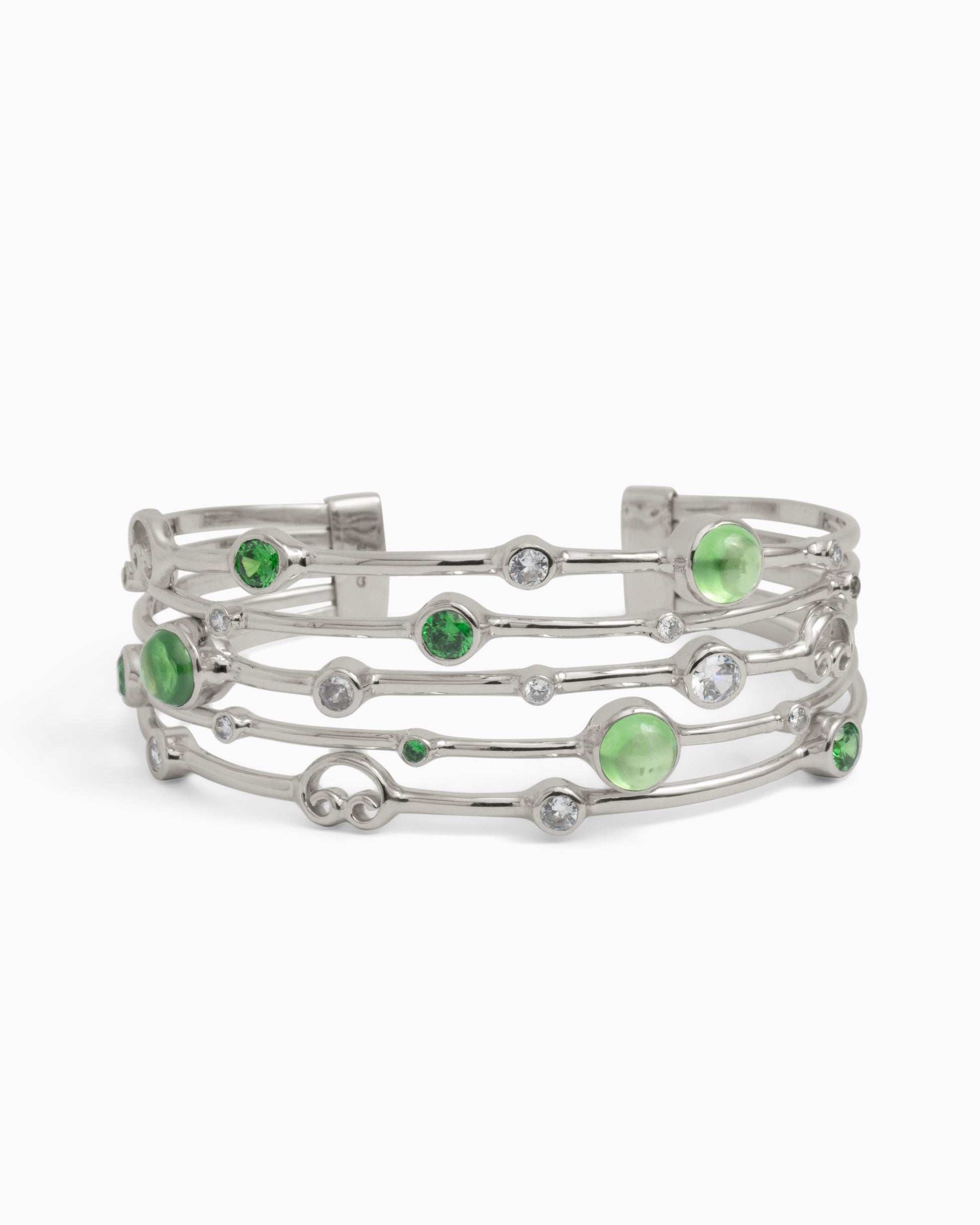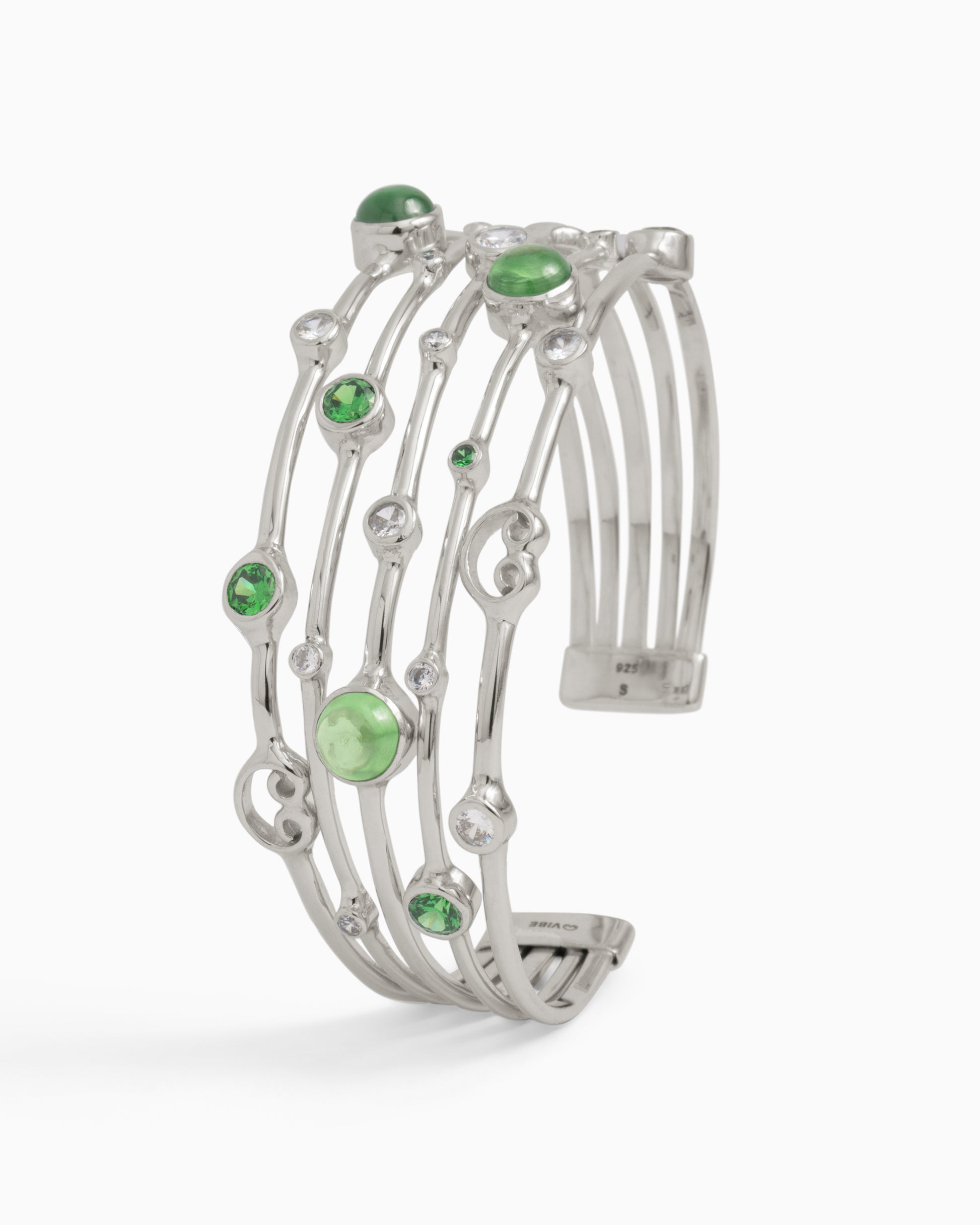 The sterling silver Cuff Bracelet with Petroglyphs and Bubble Stones features five bands adorned with dazzling green and white zircon faceted stones and signature petroglyphs throughout.