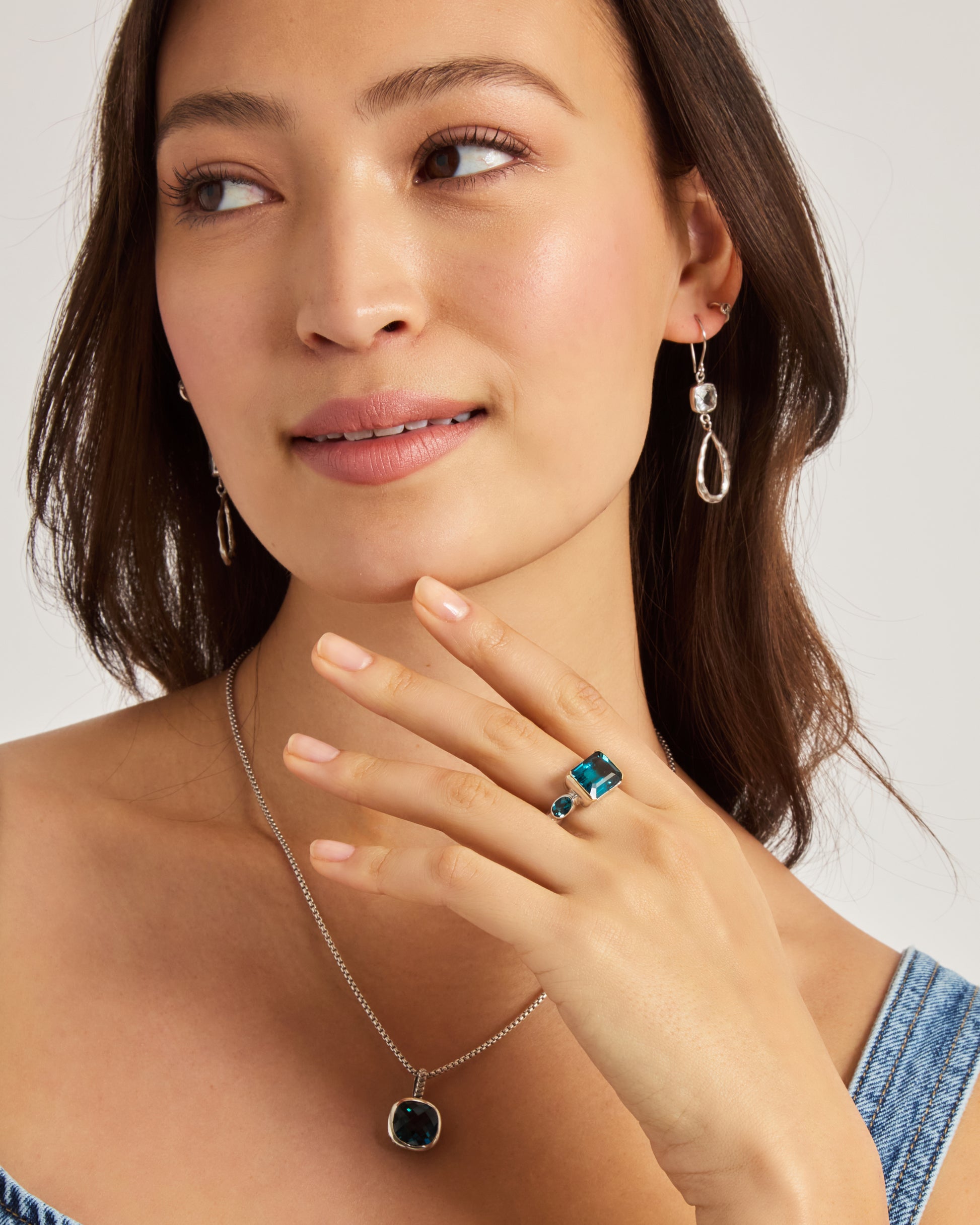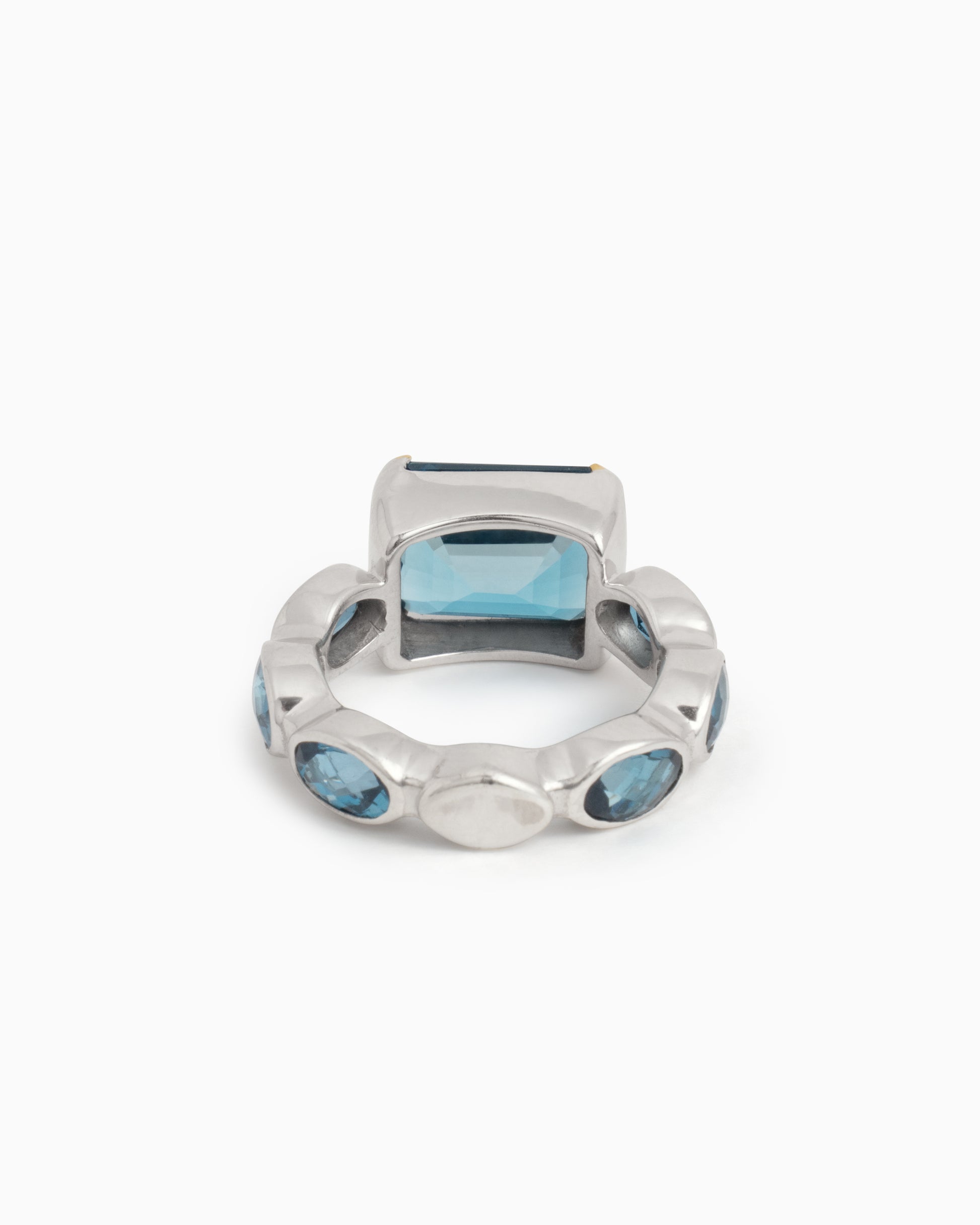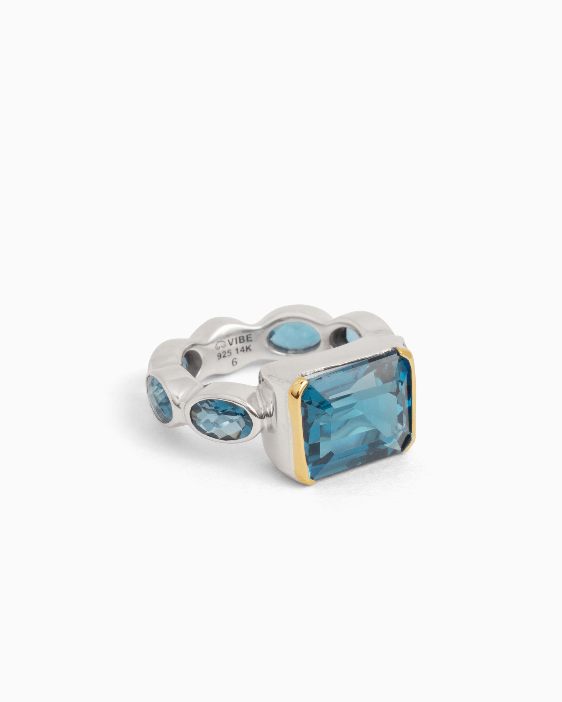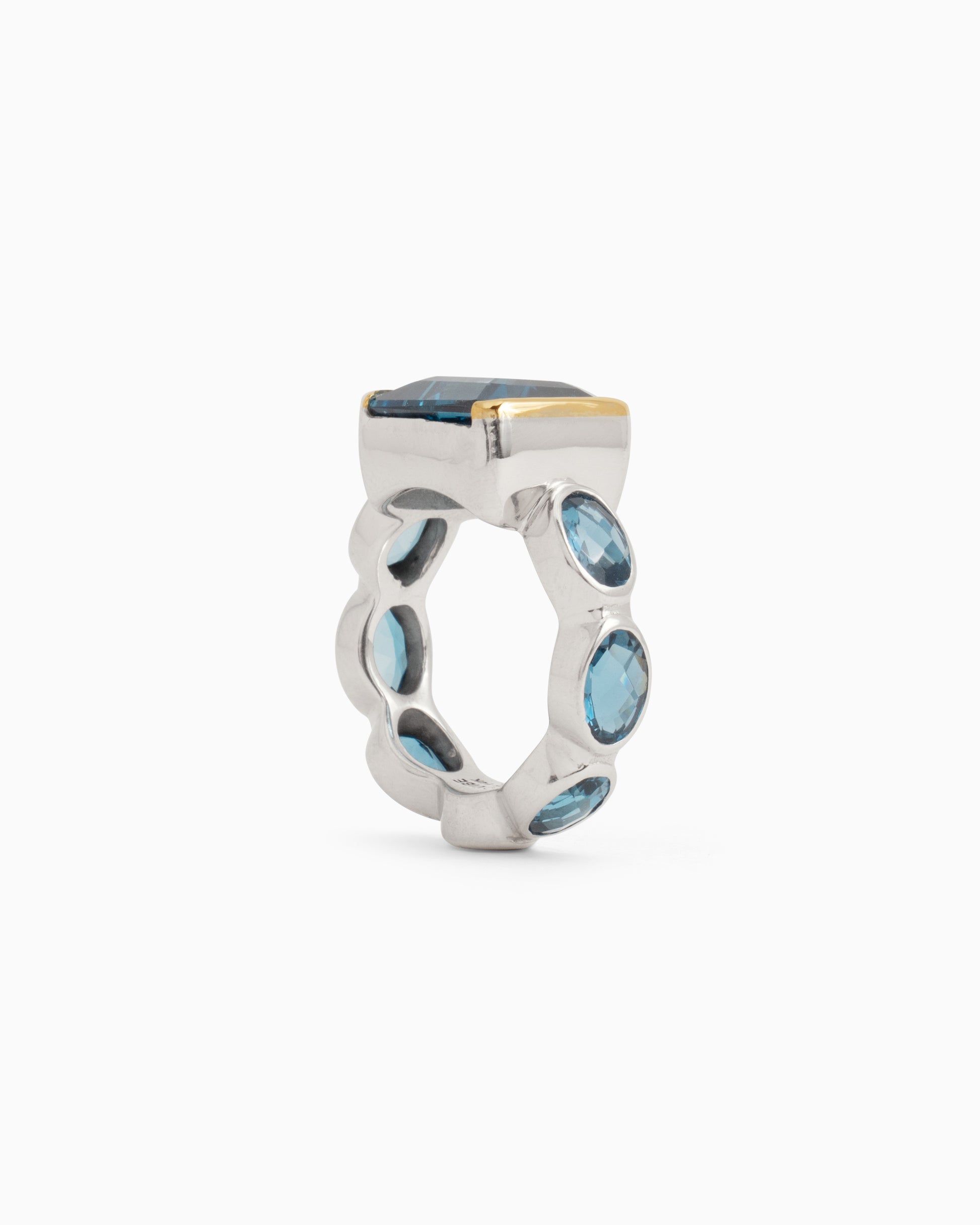 The Gemline Platform Ring is handcrafted in sterling silver and features a large emerald-cut London blue topaz center stone, framed with a 14K gold accent and matched by oval-cut London blue topaz stones that continue around the band.
