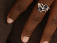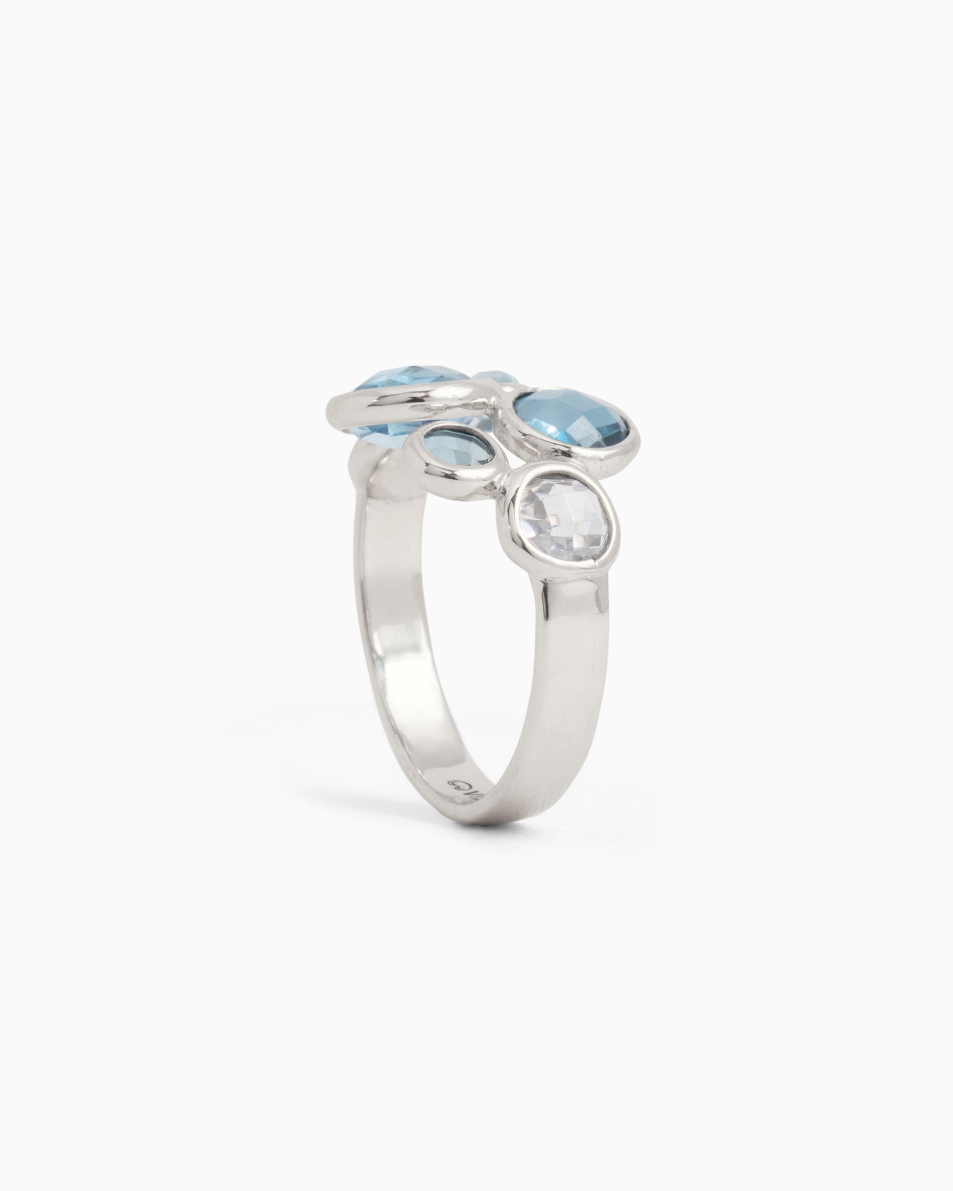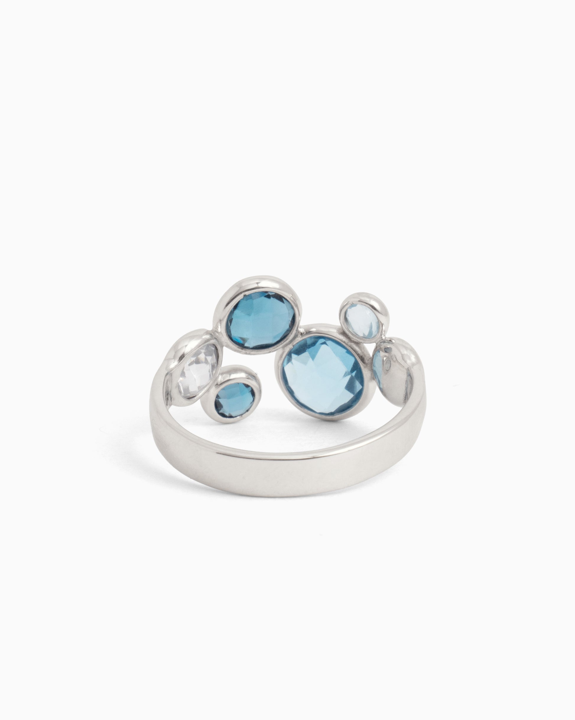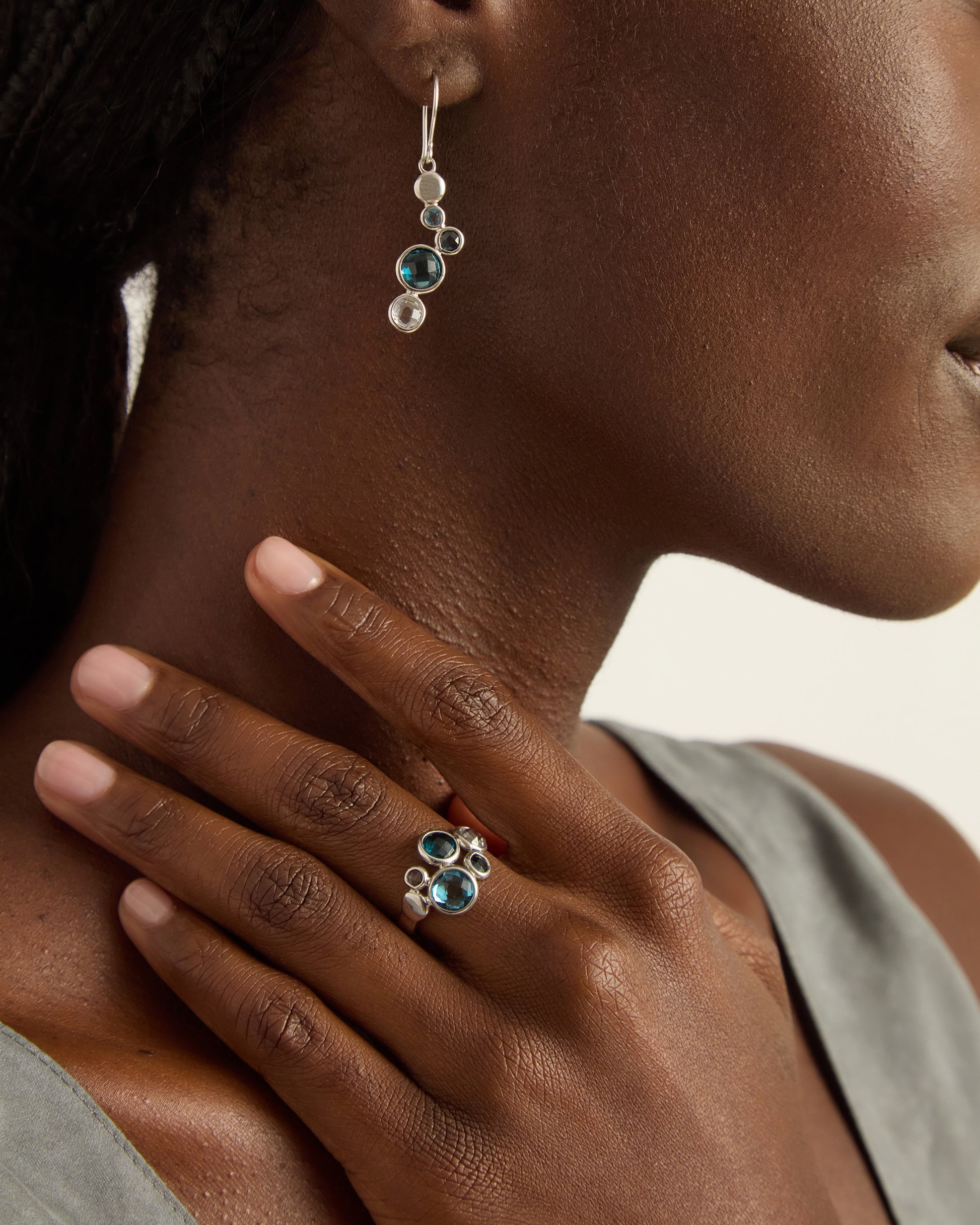 The Gemstone Bubble Ring is crafted in sterling silver, featuring bezel-set faceted London blue topaz, Hampton blue topaz, and white zircon stones—set slightly askew in a playful design inspired by a cascade of bubbles. The mix of varying sizes creates a unique look, perfect for both special occasions and everyday wear. Pair with more pieces from our Bubble Collection for a cohesive look!